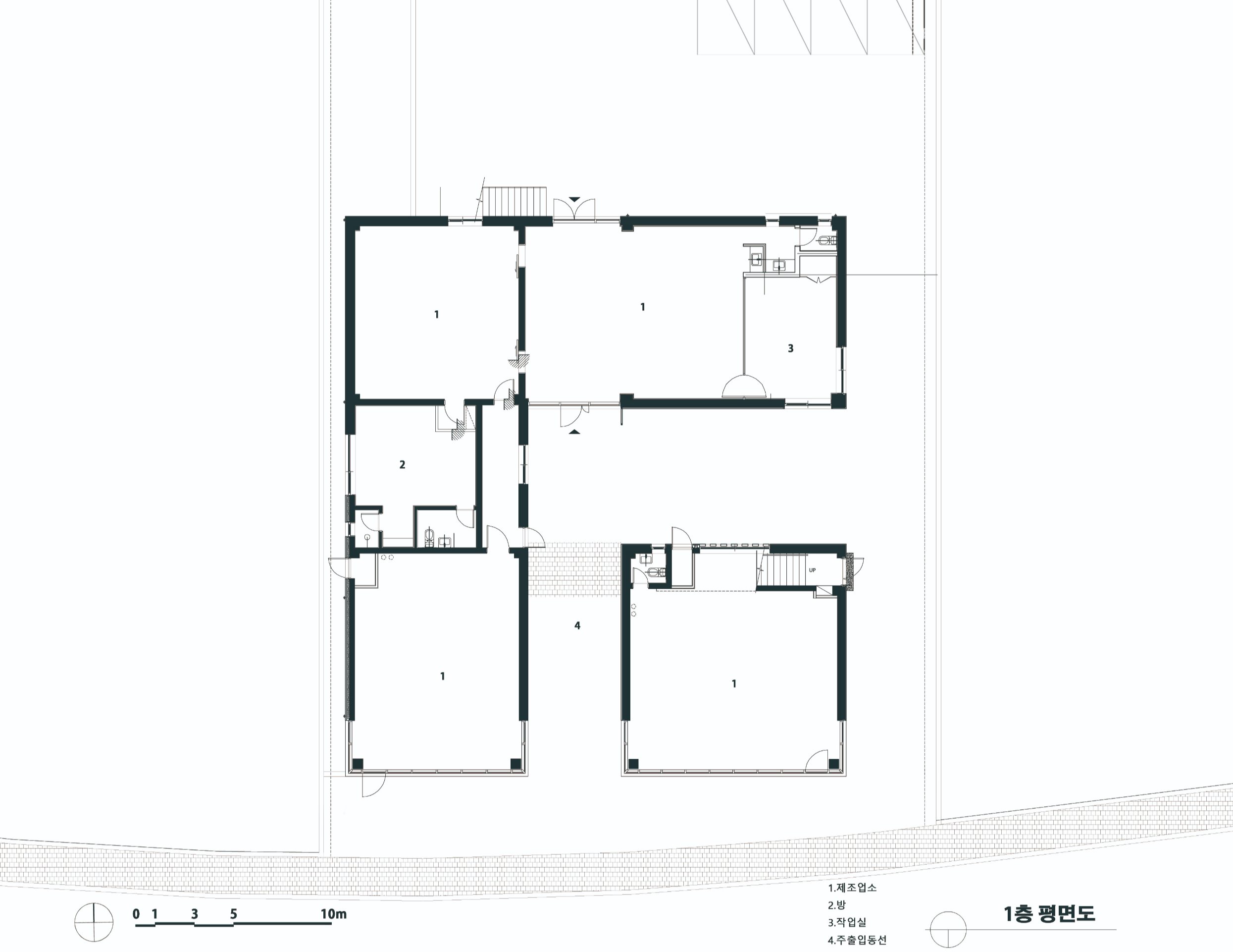 1층은 “ㄱ”자 형태의 중정으로 인해 두 개의 주요 공간으로 나뉘며, 오른쪽의 제조업소는 독립된 영역으로 활용될 수 있다. 그러나 2층의 브릿지 공간은 이들 공간을 유기적으로 연결하여 반선재의 독특한 특징을 부각시킨다. 일자형 계단과 브릿지의 공간적 연결은 단순한 이동 통로가 아닌, 건물을 관통하는 또 다른 공간적 장치로 기능하며, 남쪽 중정, 메인 제조업소, 후정으로 이어지는 축을 통해 공간의 조화로움을 이룬다. 브릿지 공간은 주변 풍경을 끌어들이는 차경 역할을 하여, 대지 내의 시간과 공간의 깊이를 느낄 수 있는 휴식 공간인 “소 전망대”로도 기능한다.