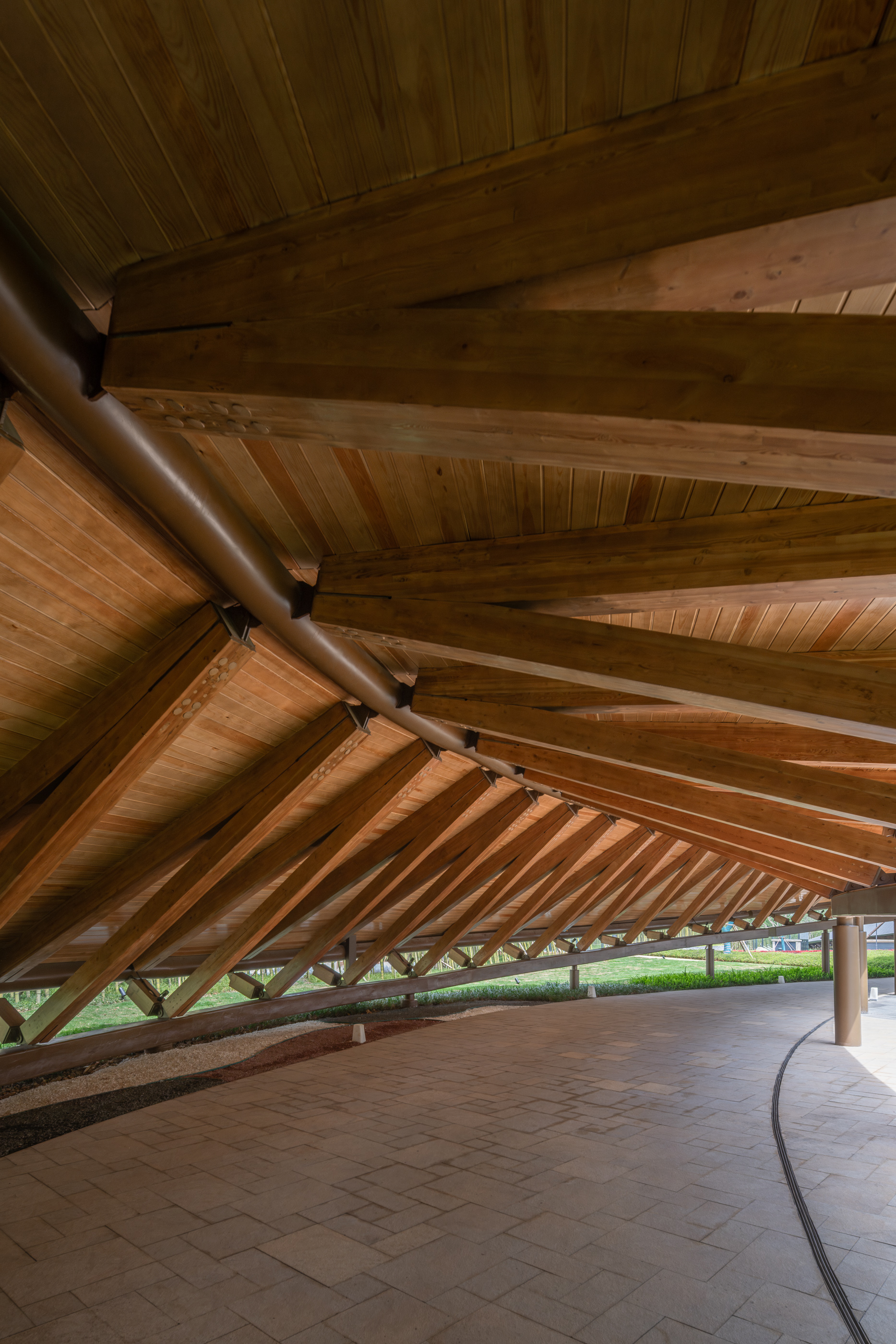 메인 건물과 산책로의 지붕은 목조 구조로 설계되었는데, 이는 전통 목조 건축과 배의 형상, 지속 가능성이라는 설계 콘셉트와 맞닿아 있다. 그 결과, 따뜻하고 생물 친화적이며 리듬감 있는 척추 형태의 구조가 형성되었다. 지붕이 덮인 산책로는 투숙객을 비와 햇볕으로부터 보호한다. 때로는 땅에 닿을 듯 넓고 평평하게 이어지며, 한쪽은 시야를 차단하고 다른 한쪽은 정원을 향해 열려 있어 아늑하고 친밀한 공간감을 제공한다.