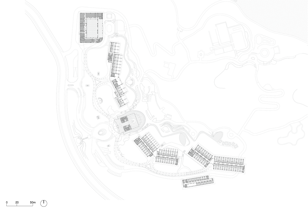 이러한 특성을 반영해 리조트는 객실 동들을 정원으로 감싸고, 지붕이 덮인 산책로로 연결하는 방식으로 구성되었다. 다양한 건물 구성 속에서 연결 요소들은 건축의 핵심이 되었고, 자연스럽게 산책로 위로 솟아오르는 메인 로비는 리조트의 중심 공간으로 자리 잡게 되었다. 스파인 리조트는 수직으로 높게 솟은 입구에서 시작해, 낮고 곡선적인 파노라마형태로 이어지며 호수로 향하는 전경을 강조한다.