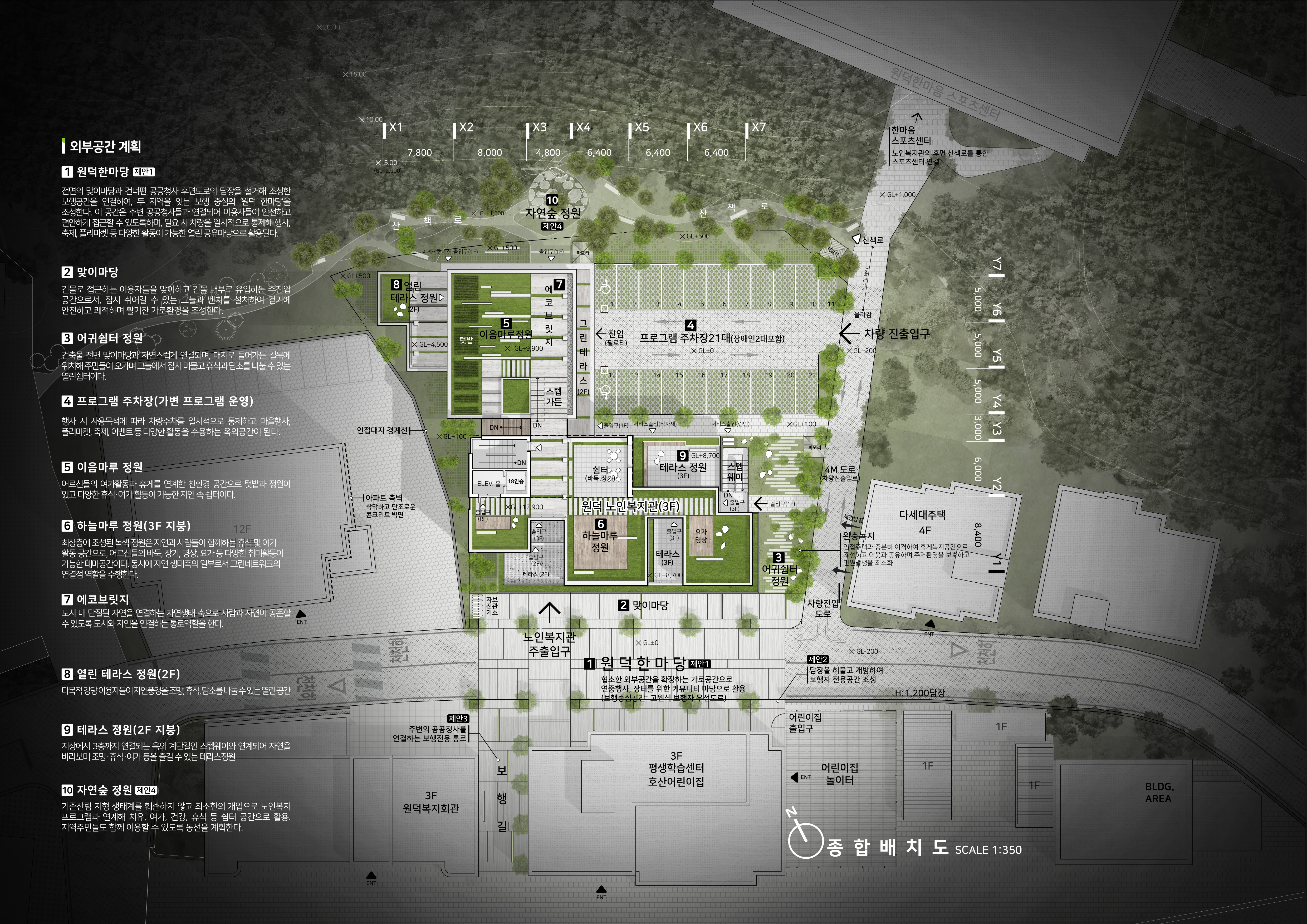 대상지는 도시와 자연의 경계에 위치하며, 주변에 공공건축물이 밀집해 클러스터를 이루고 있다. 그러나 종합적인 도시계획의 부재로 각 시설 간 기능적·공간적 연계가 부족하고, 차량 중심의 도로로 인하여 보행동선과 접근성을 저하시켜 지역 간 단절을 심화시키고 있다. 이에 우리는 '연결(link)'이라는 개념을 건축적으로 구체화하고자 하였으며, 단순한 연결을 넘어 함께 살아가는 공동체를 설계하고자 했다. 도시와 자연을 잇는 길, 사람과 사람을 잇는 라운지, 지역과 지역을 잇는 마당이라는 세가지 테마를 통해 입체적인 연결 방식을 제안하였으며, 이를 통해 원덕 노인복지관이 자연, 도시, 사람, 문화가 어우러지는 화합과 통합의 플랫폼이 되기를 기대한다.
