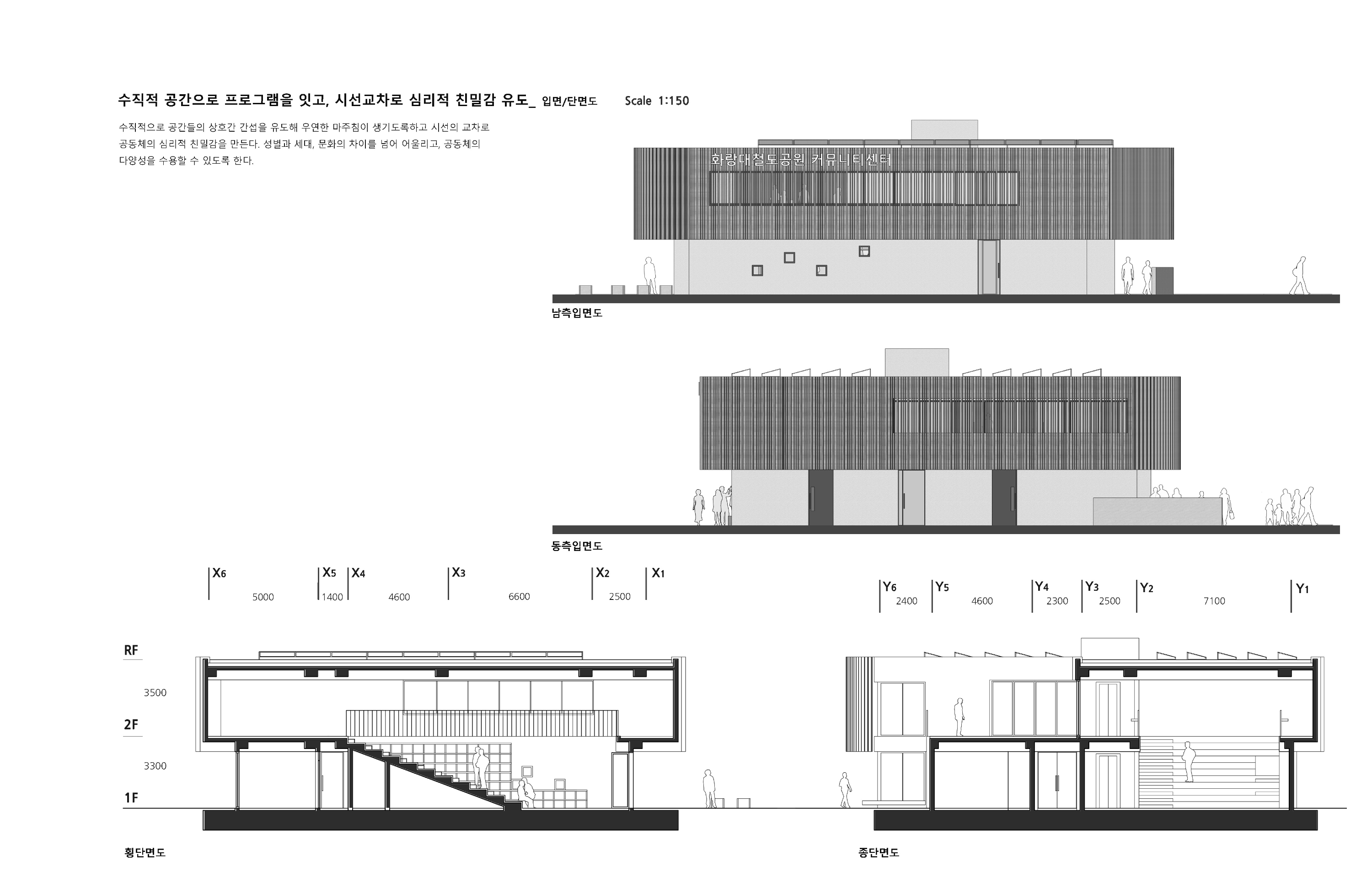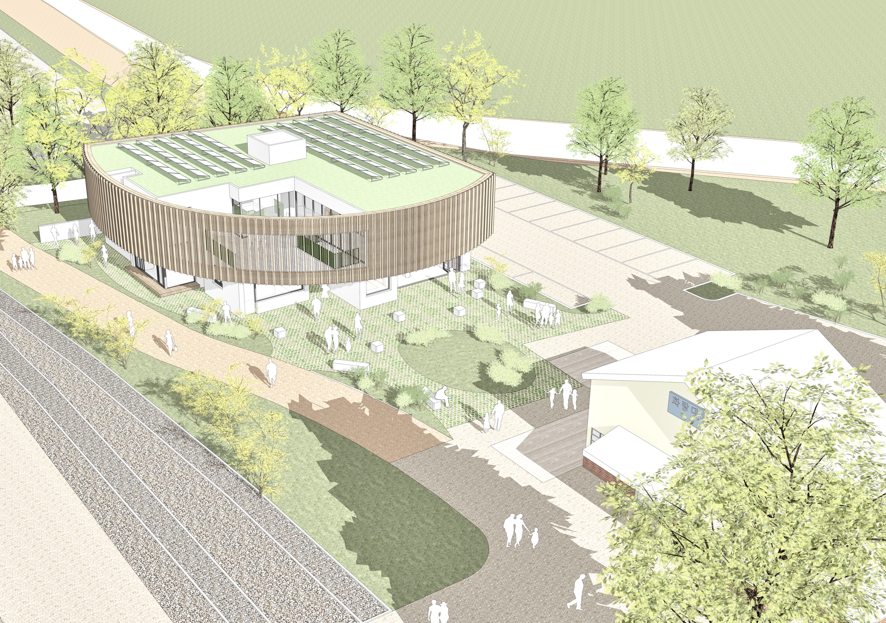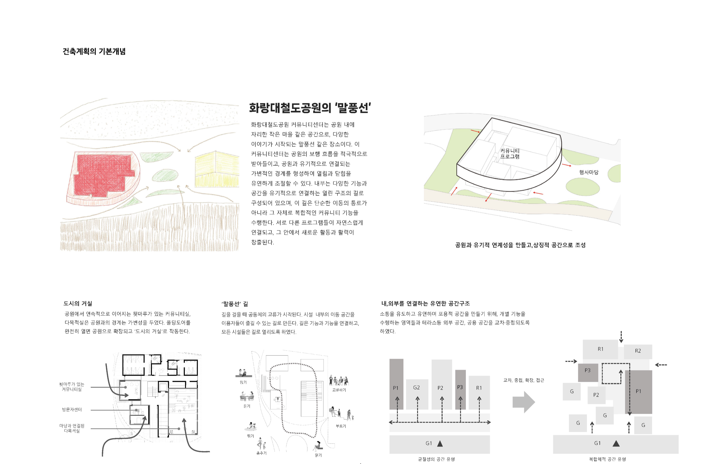 화랑대철도공원 커뮤니티센터는 공원 내에 자리한 작은 마을 같은 공간으로, 다양한 이야기가 시작되는 말풍선 같은 장소이다. 이 커뮤니티센터는 공원의 보행 흐름을 적극적으로 받아들이고, 공원과 유기적으로 연결되는 가변적인 경계를 형성하여 열림과 닫힘을 유연하게 조절할 수 있다. 내부는 다양한 기능과 공간을 유기적으로 연결하는 열린 구조의 길로 구성되어 있으며, 이 길은 단순한 이동의 통로가 아니라 그 자체로 복합적인 커뮤니티 기능을 수행한다. 서로 다른 프로그램들이 자연스럽게 연결되고, 그 안에서 새로운 활동과 활력이 창출된다.