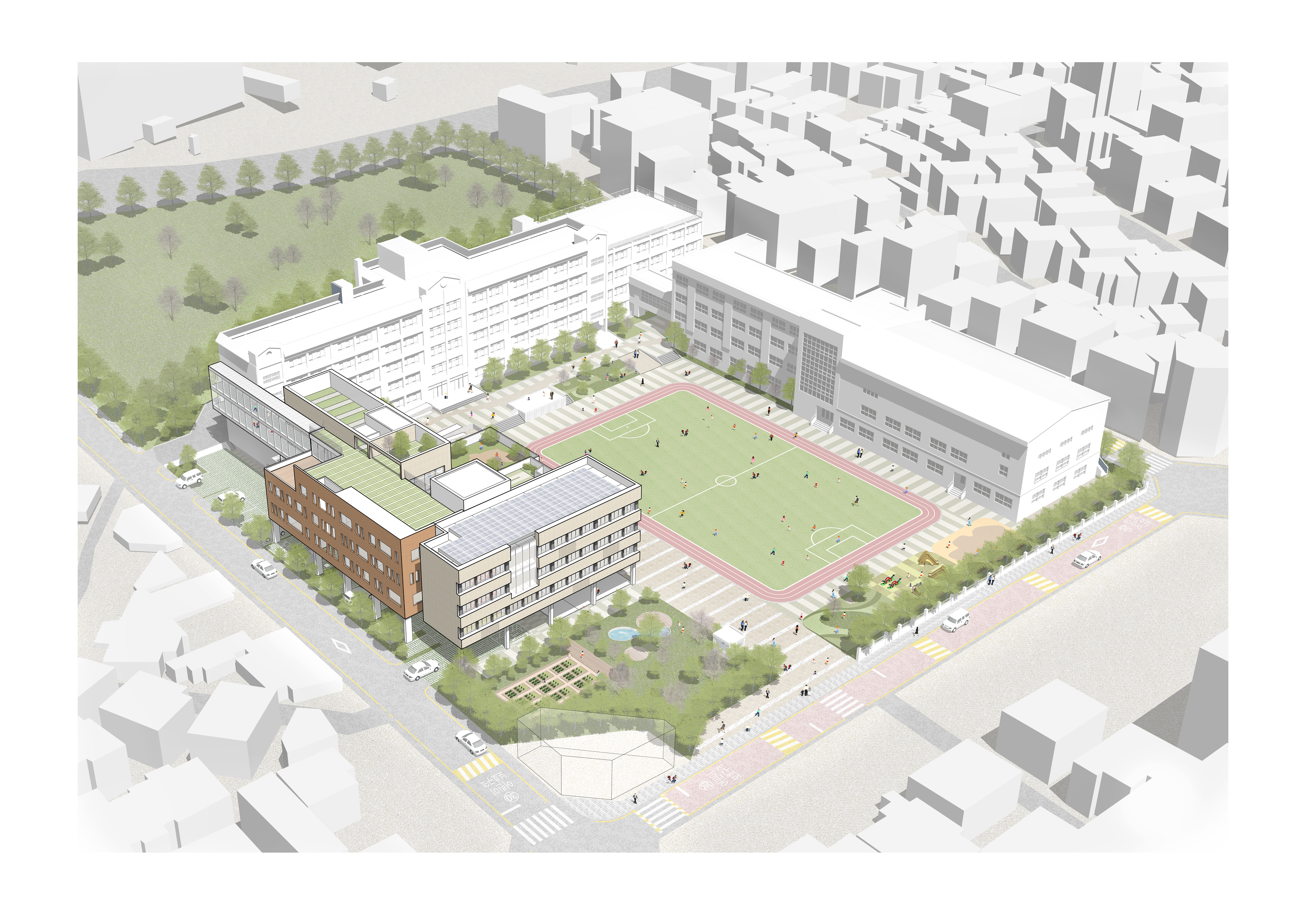 남향과 서향 위주로 배치된 교사동은 운동장과의 입체적 구성, 다양한 공간 사이의 유기적인 연결을 중요하게 생각하면서 계획하였다. 교사동에서 운동장을 시각적으로 조망할 수 있게 하고, 각 층의 테라스는 아이들의 다양한 휴게와 놀이, 학습의 장이 될 것이다.