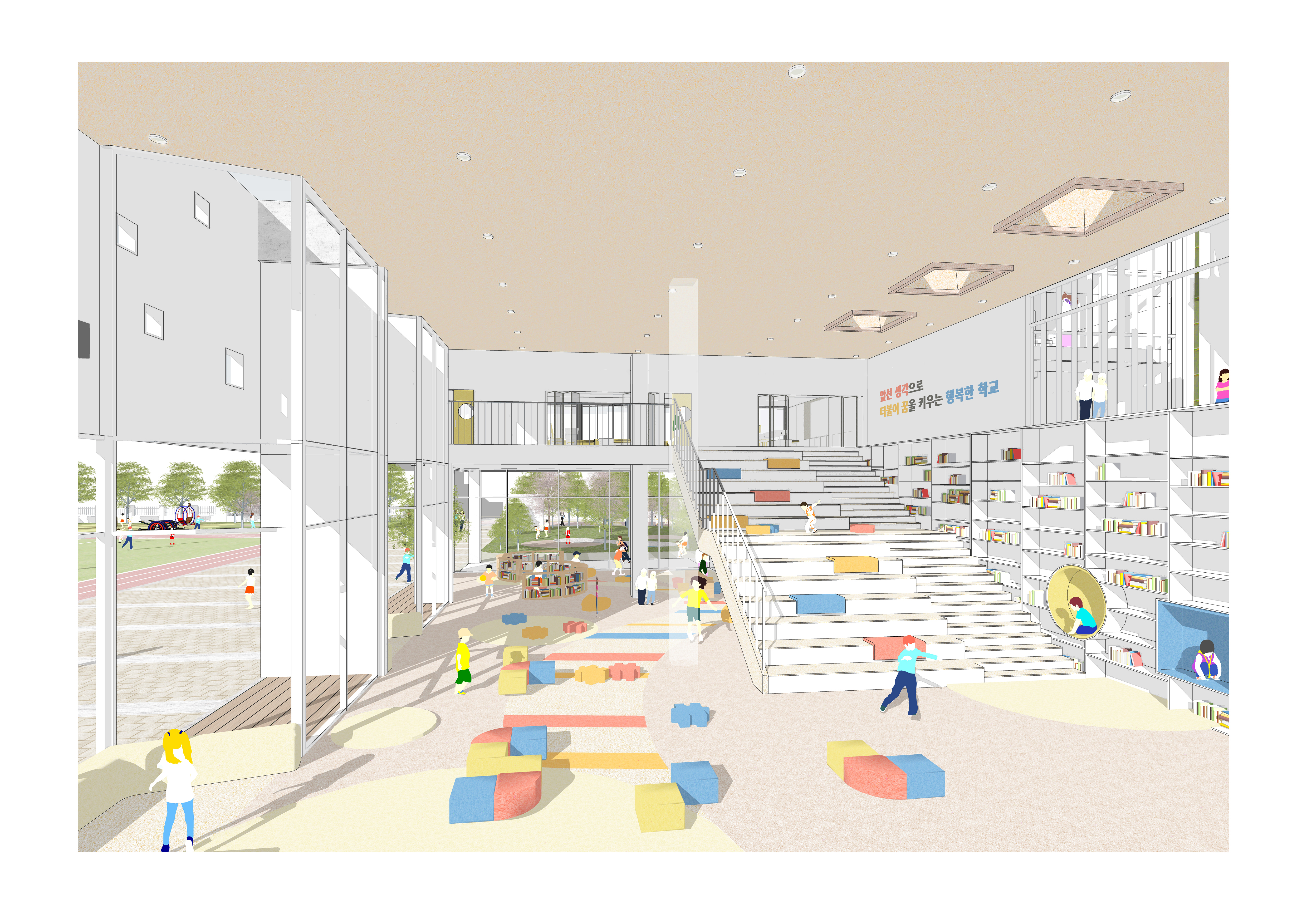 3가지 구역으로 나누어진 학습공간은 구역 별 교류공간을 가지며, 각 공간들은 학생들이 창의성을 발산할 수 있는 공간으로서 입체적으로 소통한다.