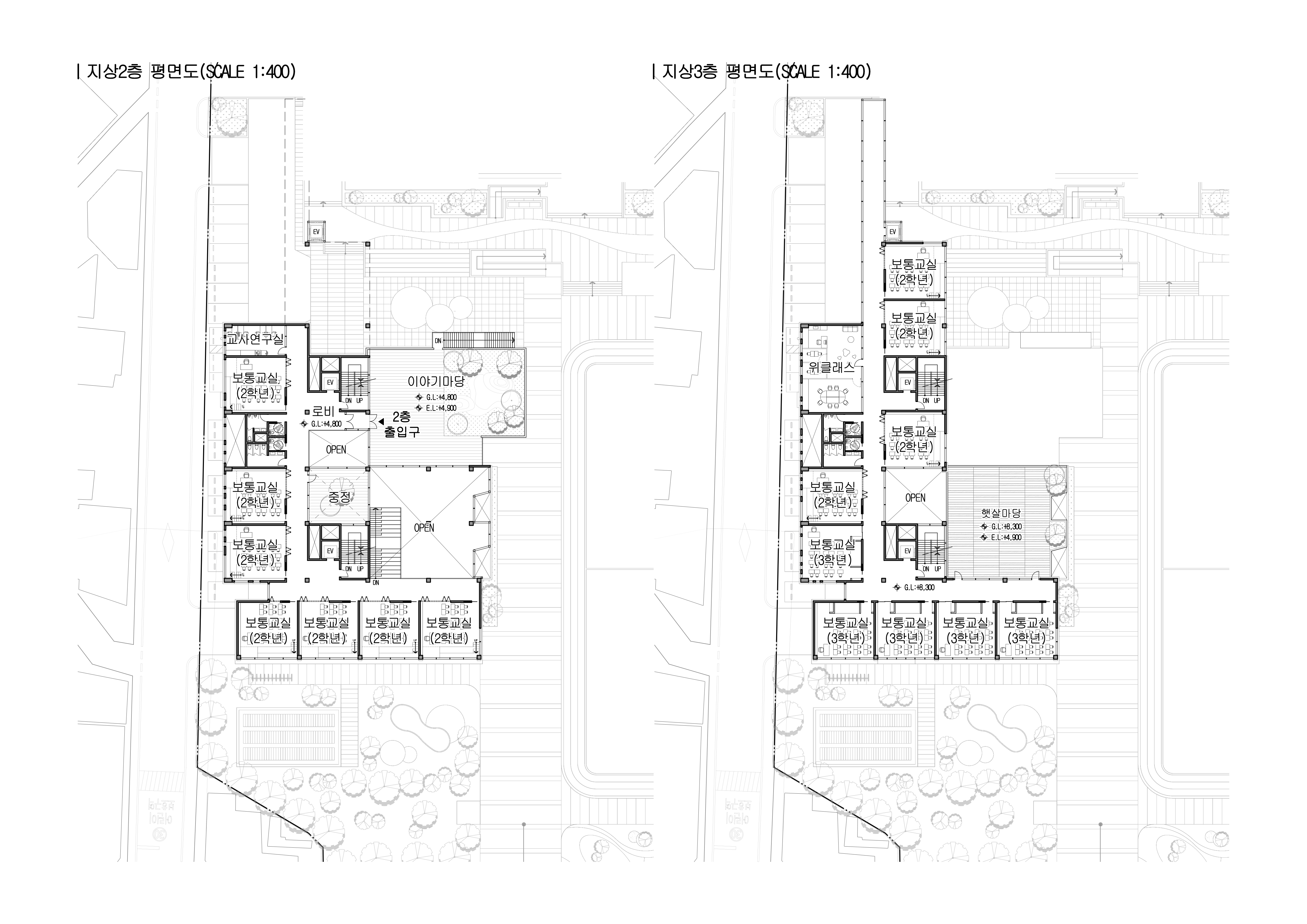 외부에서 펼쳐지는 다양한 놀이공간을 수직적으로 확장시켜 놀이와 학습이 단절되지 않고 하나로 통합된 교육공간을 구축하였다.