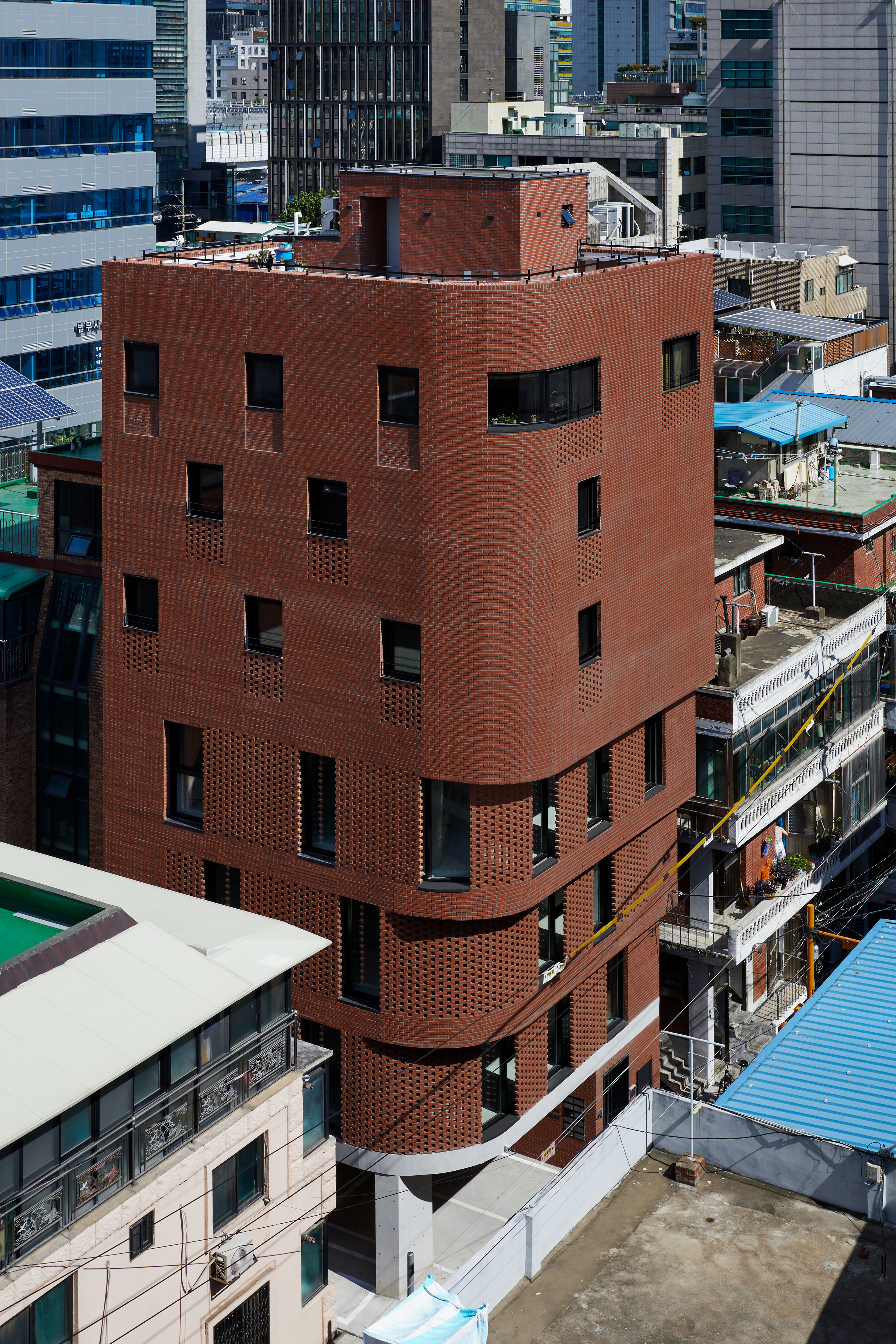 저층의 상업 시설은 이중외피의 커튼월로 계획하여 다소 좁은 실내 공간의 개방감을 극대화하고 고층의 주거 시설은 향후 주변 시설과의 시각적인 간섭을 고려하여 창 계획을 최소화하였다. 벽돌의 다양한 쌓기 방식으로 기존의 막힌 벽들은 빛을 받아들일 수 있도록 열리는 동시에 주변 이웃들의 삶이 지키질 수 있도록 스크린의 역할을 한다.