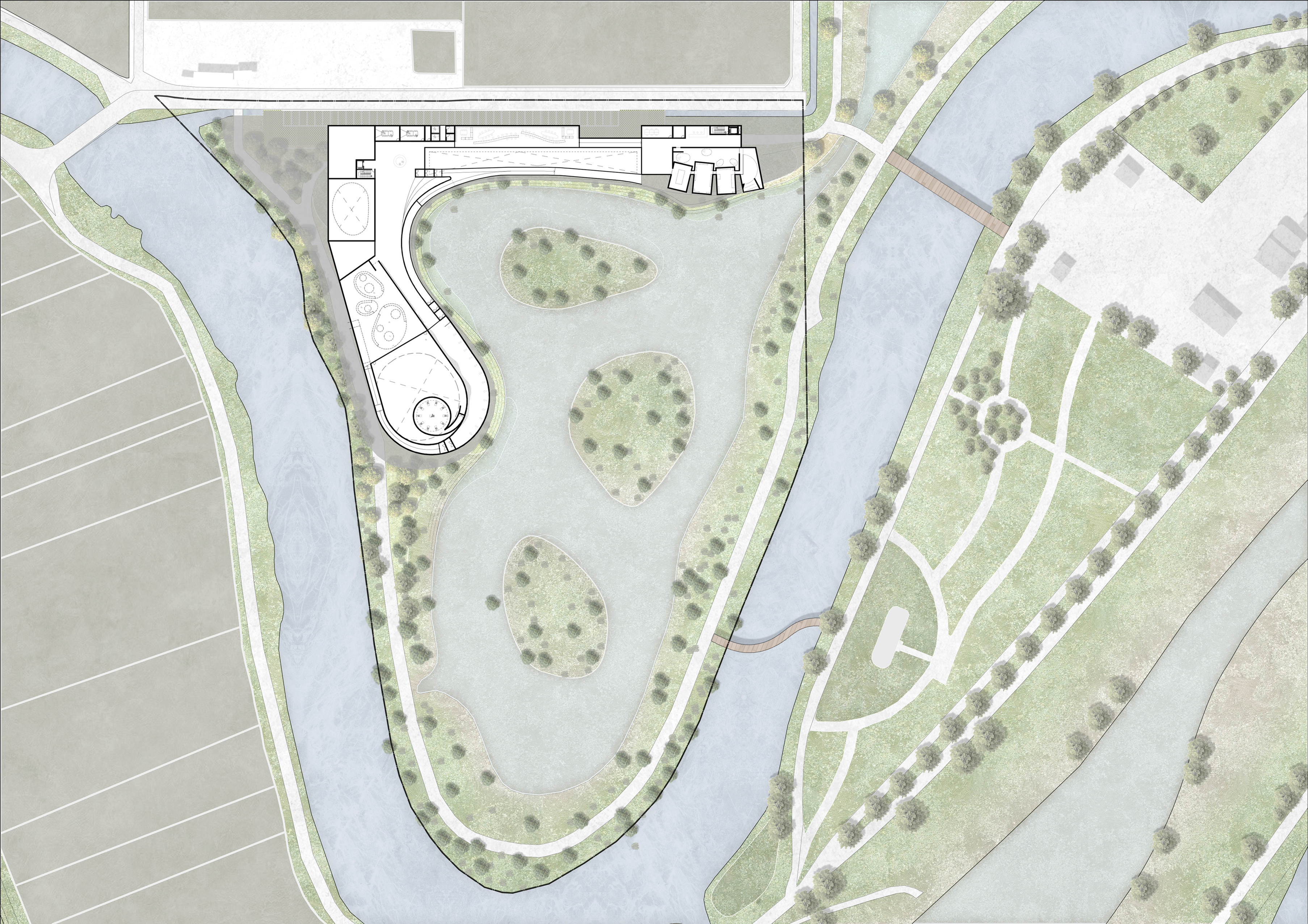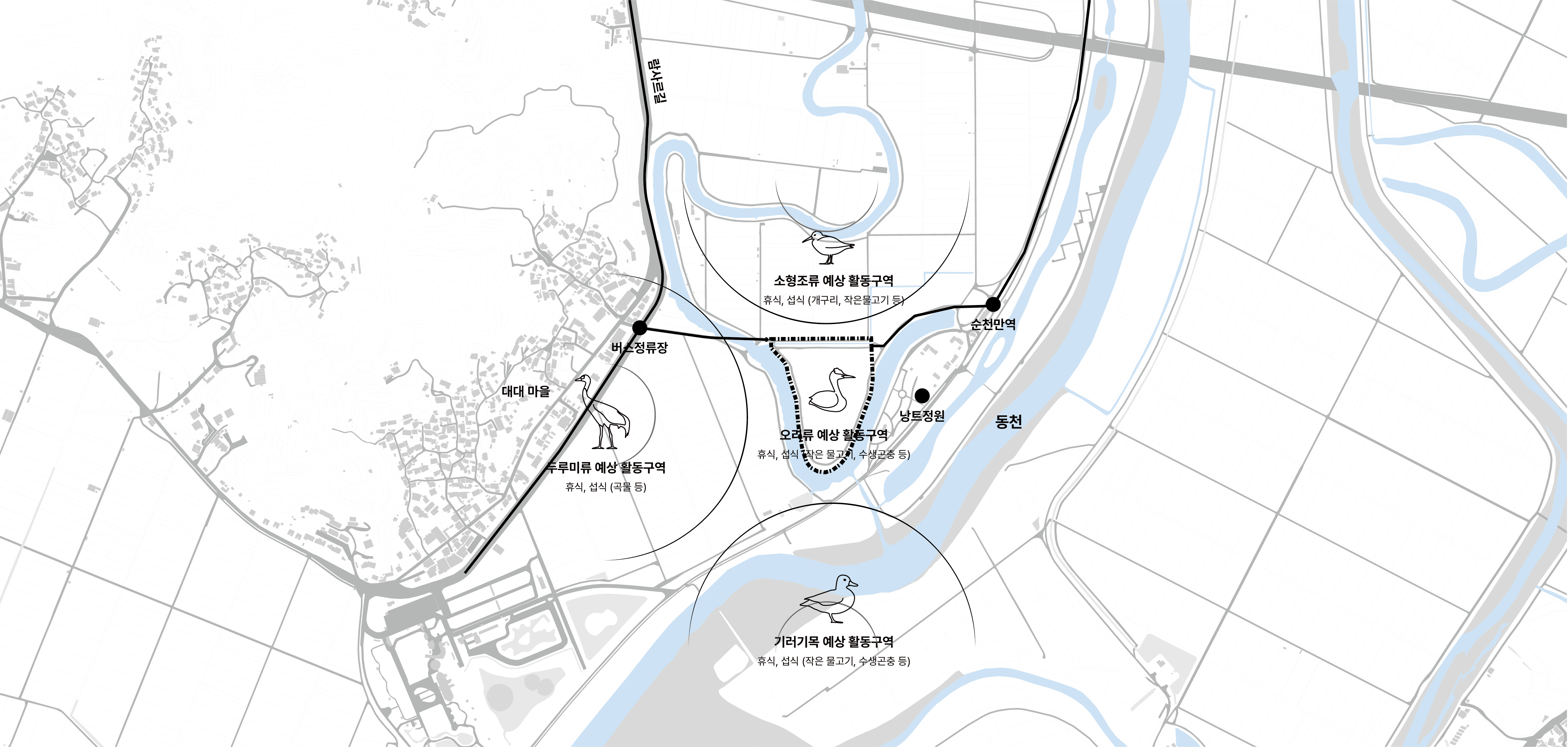 기존 생태 환경을 해치지 않도록 대부분의 공간은 습지에 낮게 배치되고, 사람과 동물 모두의 접근성이 고려된 습지변 탐방로와 관찰데크가 자연스럽게 이어진다. 이는 마치 기존 생태계의 흐름에 ‘사람’이라는 존재가 조심스럽게 발을 맞추도록 하는 것이다. 치유플랫폼의 기단부는 자연스러운 조경으로 건축을 숨기도록 하여 새들이 간섭을 느끼지 않도록 하며, 동시에 사람들도 열린 시야를 가질 수 있도록 하였다. 단면은 기능을 나누는 선이 아니라, 자연의 층위를 조율하는 악보처럼 설계되었다. 위로는 열린 하늘, 아래로 포근한 흙, 그 사이에 머무는 사람이 있다.
