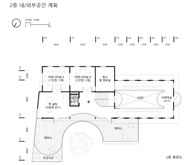 1층과 2층의 커뮤니티실(3개실)은 모두 남향 채광을 고려하여 배치하였으며, 책쉼터는 동측의 하천과 공원을 조망할 수 있고, 공원을 향하여 넓게 자리한 외부 테라스와 연계하여 사용할 수 있다.