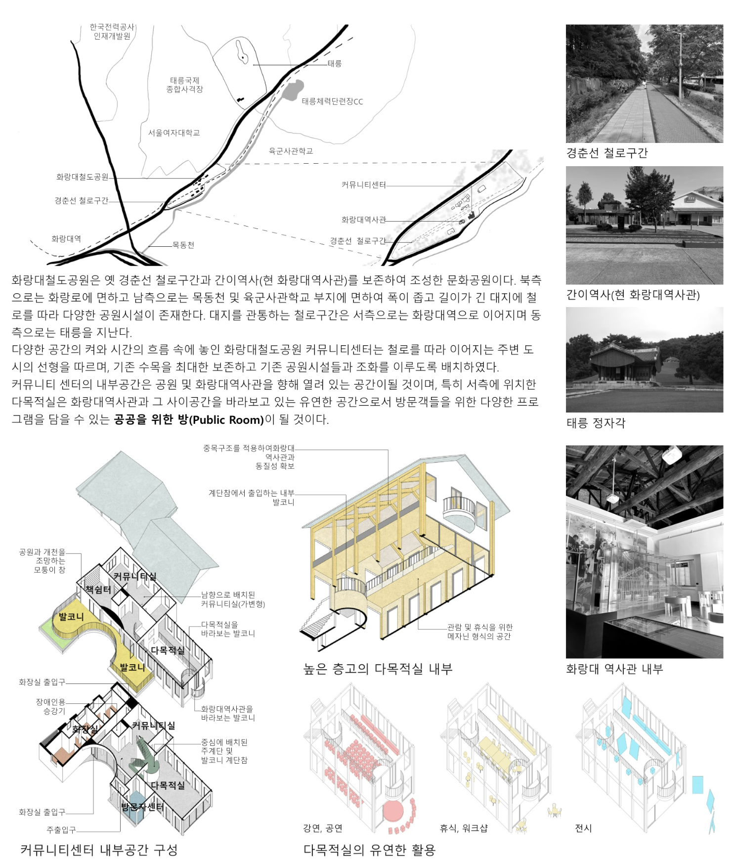 커뮤니티 센터의 내부공간은 공원 및 화랑대역사관을 향해 열려 있는 공간이될 것이며, 특히 서측에 위치한 다목적실은 화랑대역사관과 그 사이공간을 바라보고 있는 유연한 공간으로서 방문객들을 위한 다양한 프로그램을 담을 수 있는 공공을 위한 방(Public Room)이 될 것이다.