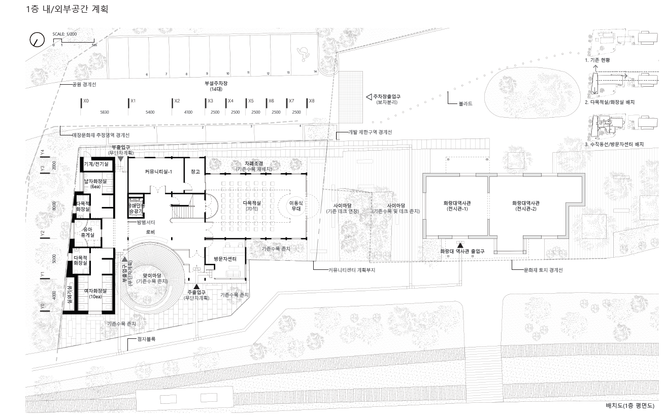 1층 내외부 공간 계획은 커뮤니티센터 부지 인근의 화랑대역사관과 공원시설, 기존 수목을 고려하여 주요 프로그램 공간을 배치하고 그 사이로 공원 보행로와 주차장 에서의 원활한 접근을 위한 출입동선과 공용공간을 계획하는 것에서 출발하였다.
