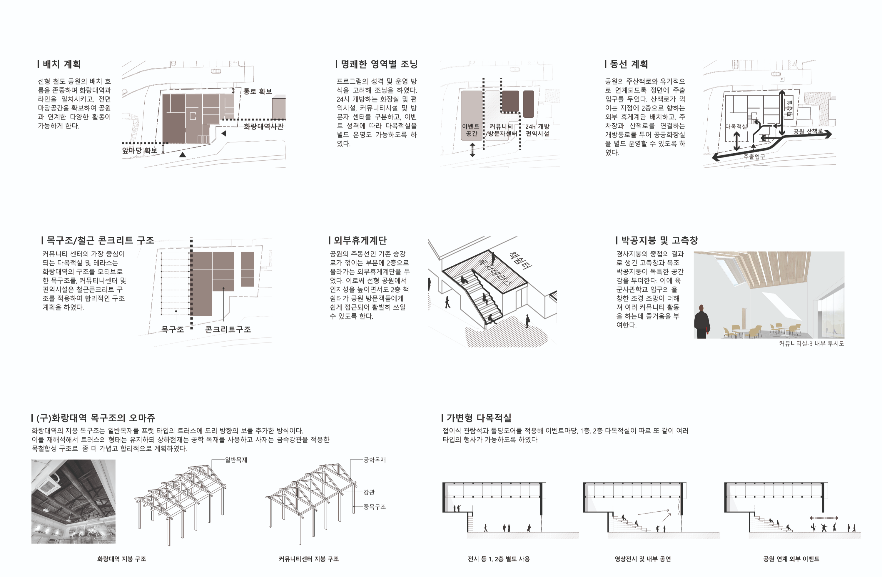 커뮤니티 센터의 가장 중심이 되는 다목적실 및 공원과 연계된 외부활동을 하는 테라스는 화랑대역의 구조를 모티브로한 목구조를 커뮤티니센터 및 편의시설은 철근콘크리트 구조를 적용하여 합리적인 구조계획을 하였다. 기존 화랑대역의 지붕 목구조는 일반목재를 프랫 타입의 트러스에 도리 방향의 보를 추가로 설치한 방식이다. 이를 재해석해서 트러스의 형태는 유지하되 상하현재는 공학용 목재를 사용하고 사재는 금속강관을 사용해 좀 더 가볍고 합리적인 구조로 계획하였다. 이로서 화랑대 철도공원의 공간적인 컨텍스트에 잘 녹아들면서, 구화랑대역사의 건축적 특징을 현대적을 반영한 공원의 새로운 구심점이 되는 커뮤니티시설을 제안한다.