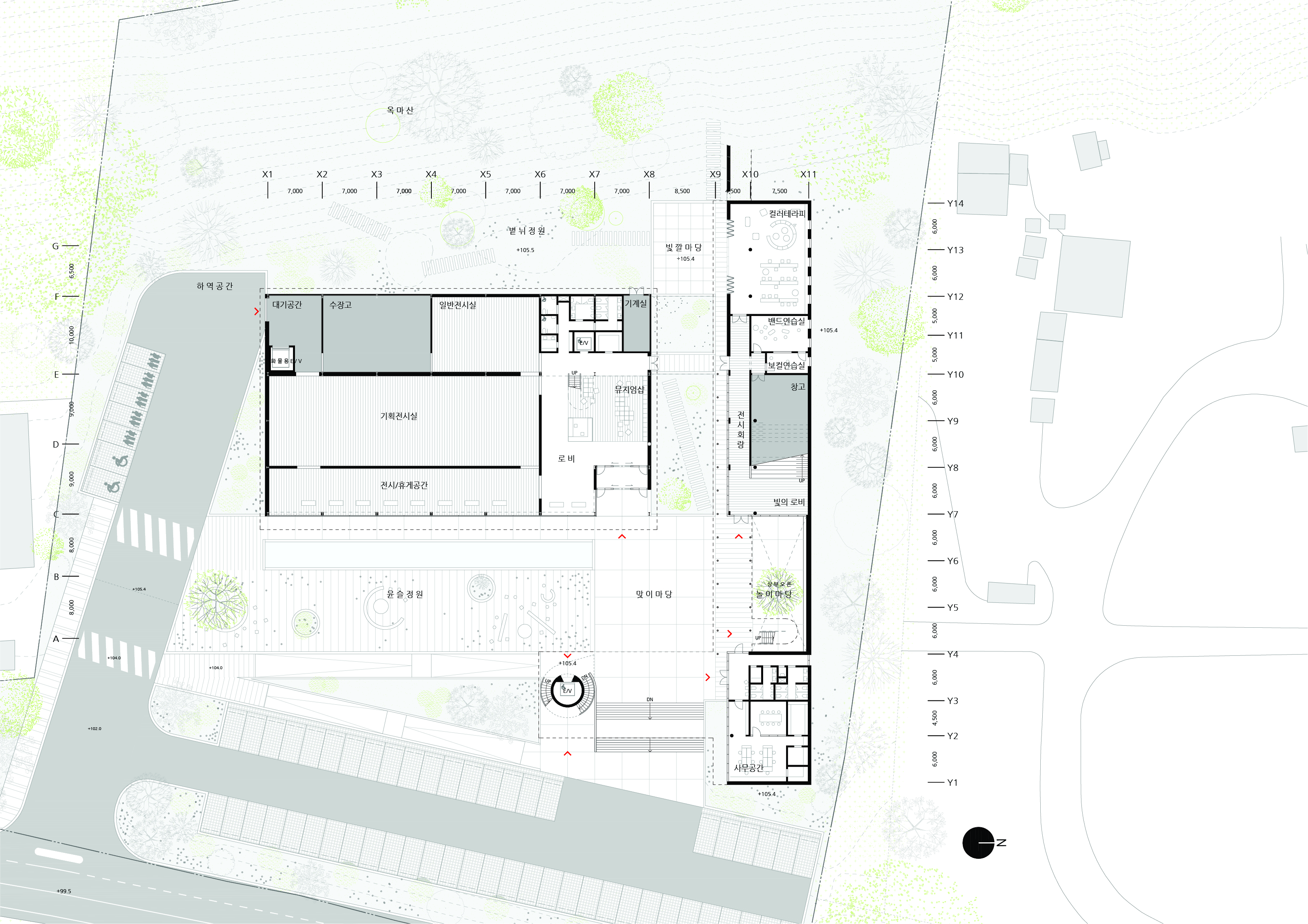 기존의 지형을 따라 옥마산-박숙들-만수산으로 이어지며 대지를 관통하는 자연의 축은 통경축이 되어 내외부 프로그램을 연결하고, 자연을 확장, 연속시켜 대지를 아우르는 느슨한 산책로가 된다.