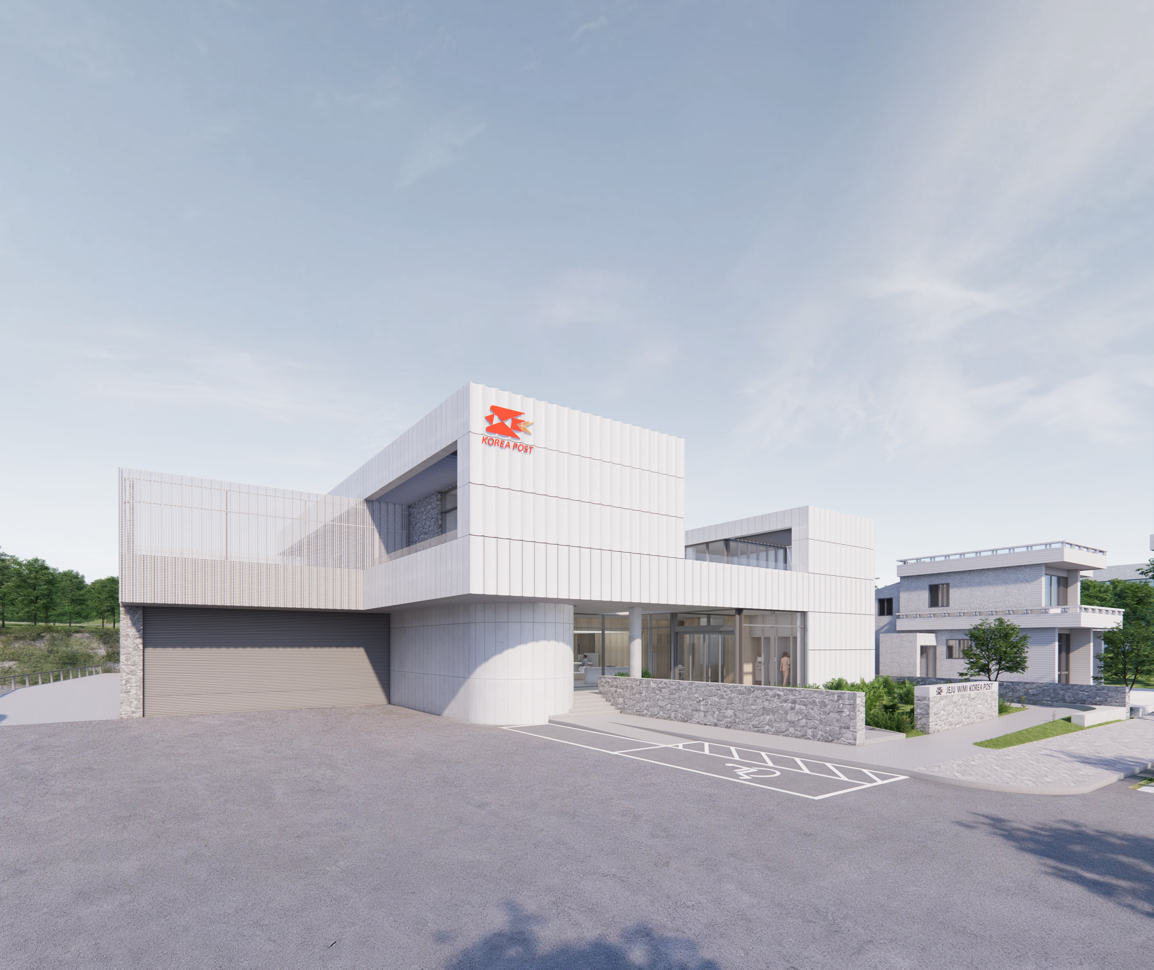 제주 위미리는 낮고 소박한 건물들이 드문드문 펼쳐진, 고요하고 따뜻한 마을이다. 2층 높이의 시선에서 멀리 위미항과 바다가 수평으로 열려 있는 반면, 전면을 제외한 북측은 옹벽과 인접 건물들로 인해 다소 폐쇄적인 조건을 지닌다. 우리는 이러한 대지의 양면성 속에서, 단절이 아닌 조화를 고민했고, 지역의 풍경을 수용하는 방식으로 우체국이라는 공공 건축물에 새로운 가능성을 그려보고자 했다. 70~80년대를 지나며 축적된 우체국의 근대건축적 이미지와 그에 따른 전형적인 도로 접면형 파사드 프로토타입은 오늘날까지 반복되고 있다. 그러나 이 프로젝트에서는 그러한 재현을 넘어서고자 했다. 우체국의 상징성과 기능을 담으면서도, 오늘날의 장소성과 미래의 지속가능성을 함께 품는 건축을 구상했다.