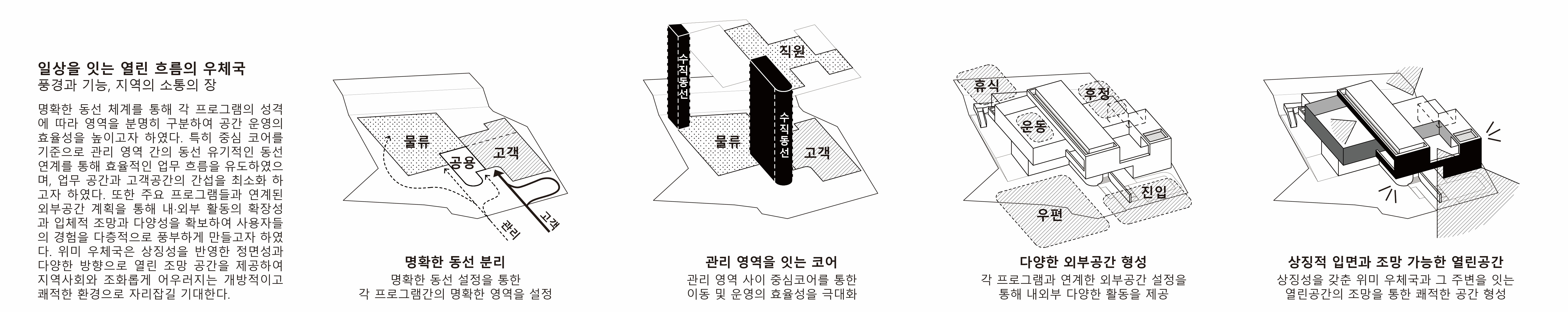 우체국이라는 특수 프로그램을 설계하면서 가장 먼저 주목한 것은, 이 공간을 사용하는 사람들의 구체적인 행태였다. 직원과 방문자, 내부 사용자와 일시적 이용자들의 이질적인 흐름을 분리하면서도 유기적으로 연결하기 위해, 코어 축을 중심으로 공간을 나누고 그 사이를 매개하는 다양한 외부 공간들을 겹겹이 레이어드 하였다. 그럼으로써 제주 자연의 수평적 풍경과 빛, 바람이 건축 안으로 자연스럽게 스며들도록 유도하였다.