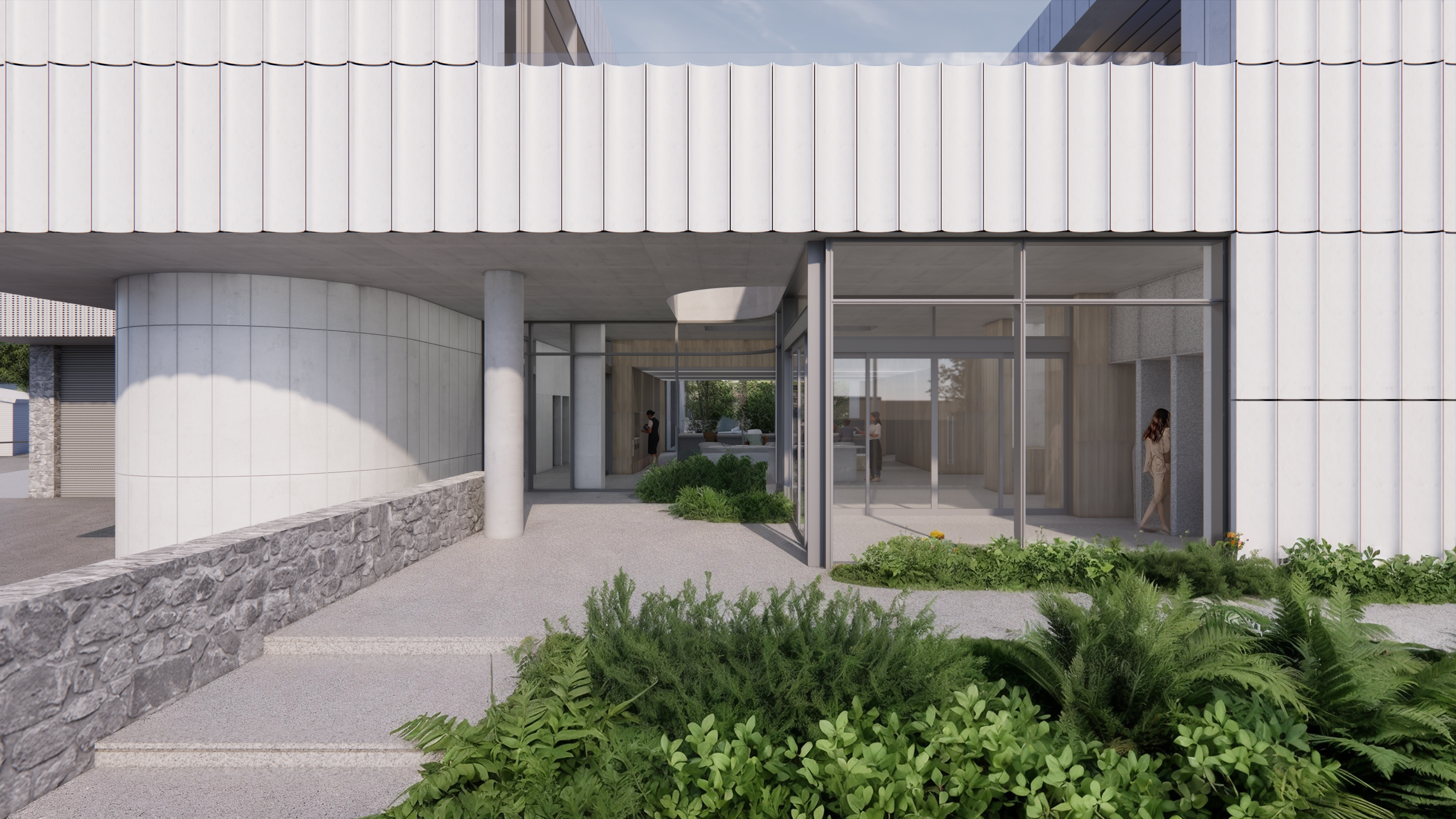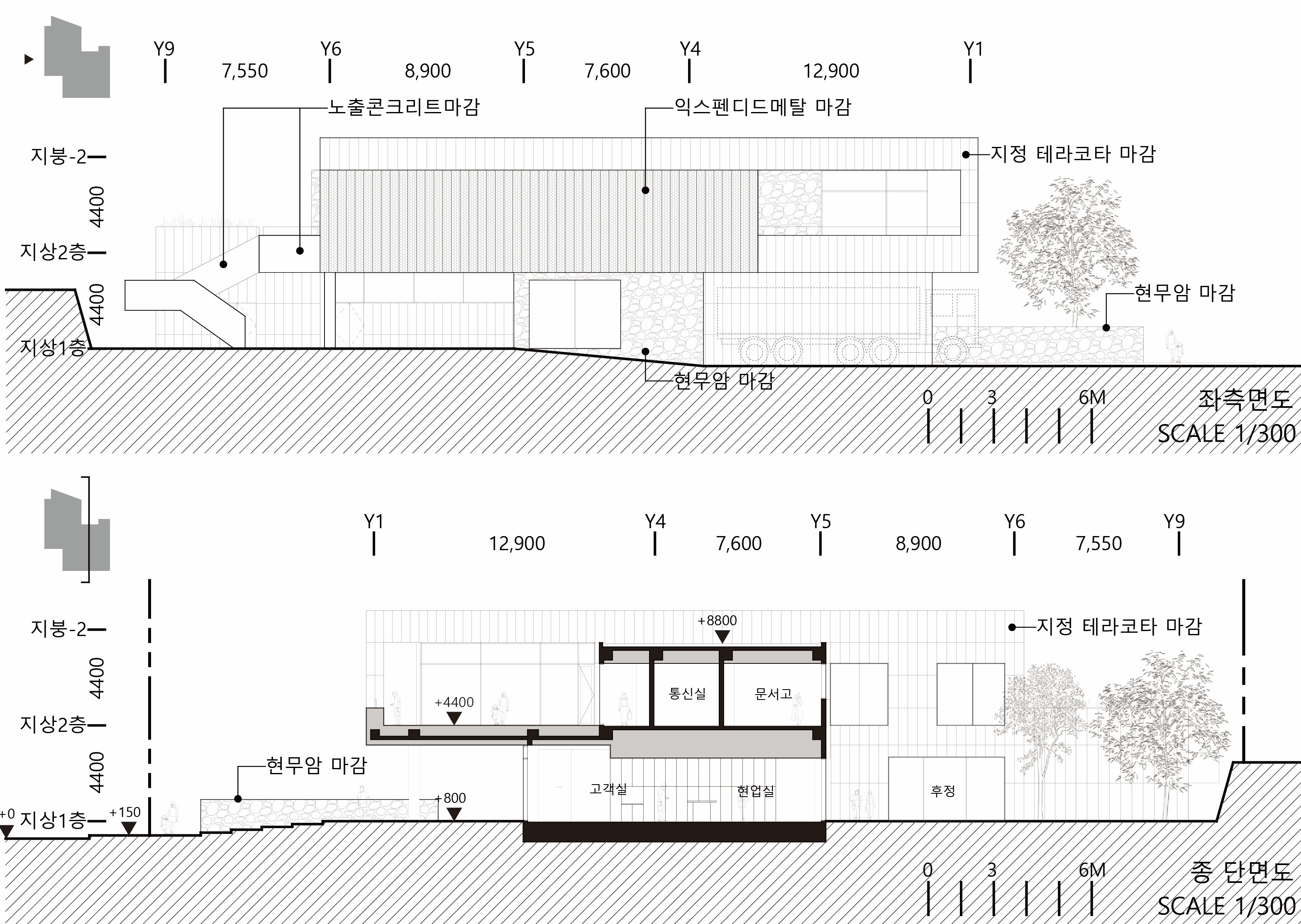 재료는 외피를 구성하는 기술적 수단을 넘어서, 장소성과 건물의 성격을 드러내는 건축의 언어로 작동한다. 전면부에는 곡선형의 순백 테라코타를 사용해 우체국의 상징성과 정면성을 강조하였고, 측면과 배면에는 무광의 매트 테라코타를 사용해 절제된 인상을 더했다. 현무암은 제주를 상징하는 재료로서 건축에 무게감을 부여하며, 절곡된 펀칭메탈은 빛과 바람을 받아들이는 반투명하고 경쾌한 경계로서 기능한다. 이 세 가지 재료는 각각의 물성을 유지하면서도 서로 긴밀하게 조화를 이루며, 단단함과 부드러움, 밀도와 여백 사이의 건축적 균형을 만들어낸다.