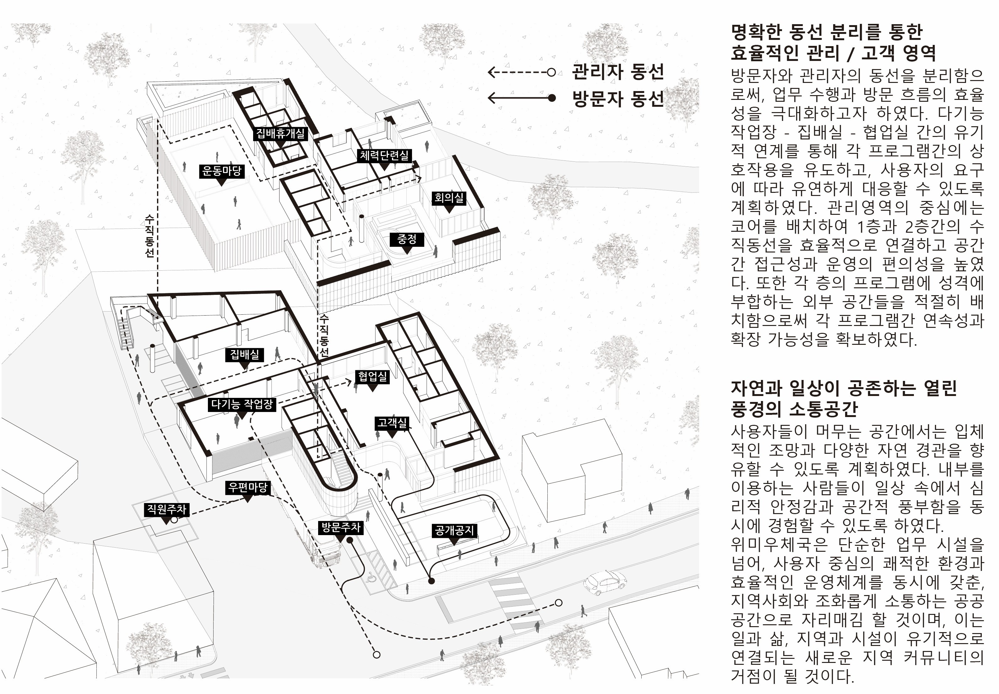 우체국이라는 특수 프로그램을 설계하면서 가장 먼저 주목한 것은, 이 공간을 사용하는 사람들의 구체적인 행태였다. 직원과 방문자, 내부 사용자와 일시적 이용자들의 이질적인 흐름을 분리하면서도 유기적으로 연결하기 위해, 코어 축을 중심으로 공간을 나누고 그 사이를 매개하는 다양한 외부 공간들을 겹겹이 레이어드 하였다. 그럼으로써 제주 자연의 수평적 풍경과 빛, 바람이 건축 안으로 자연스럽게 스며들도록 유도하였다.