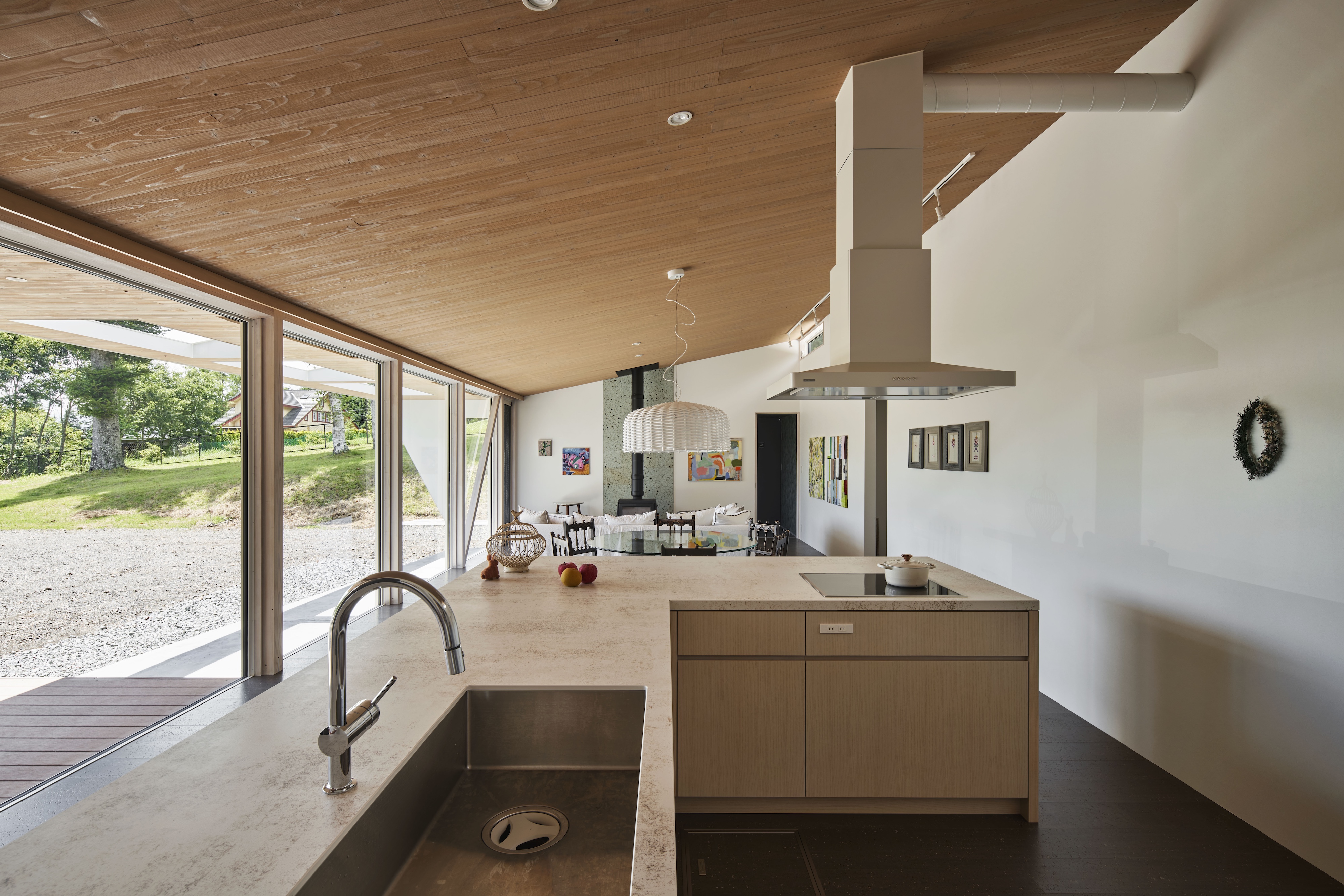 살롱 인 야쓰가타케는 그림을 그리고 소장을 위한 갤러리 기능과, 사우나 클럽에 소속된 건축주를 위한 트레이닝 캠프 공간이 요구되었다. 갤러리는 방문객을 맞이할 수 있도록 거실과 식당, 주방(LDK)이 배치되었고, 그 주변에 사우나실, 수(水) 공간, 침실, 게스트 룸이 배치되었다. 다양한 공간을 위해 각 영역마다 외형과 내외장 마감재를 달리하여 건물 외관을 분절시켰다. 또한 대지의 환경 조건을 분석하여, 남쪽을 향해 큰 처마를 가지고 있다.