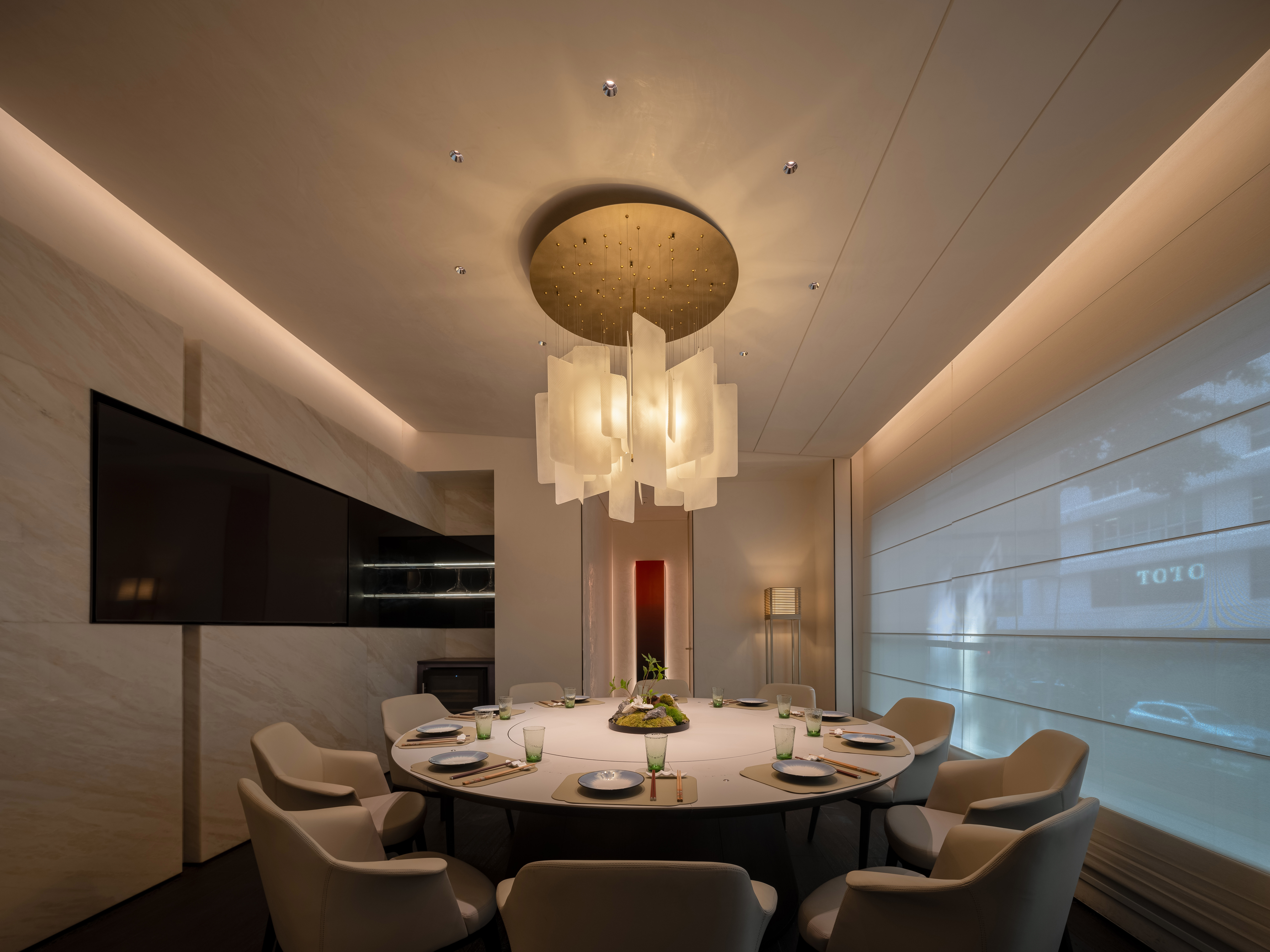 내부는 금속 스크린, 백옥 벽, 베이지 가죽 등이 고요하고 품격 있는 분위기를 자아낸다. 프라이빗 룸은 통일된 디자인 속에 다양한 재료와 색감으로 각기 다른 분위기를 연출하며, 특히 대형 룸은 비즈니스에 적합한 기능과 인테리어를 갖췄다.