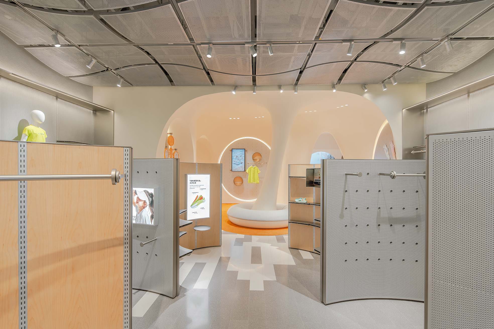 뒤편의 휴게 공간은 제품을 착용하거나 쉴 수 있는 다기능 공간으로 활용된다. 천장에서 내려오는 도넛 형태의 좌석과 따뜻한 조명은 편안한 분위기를 조성하며, 옷을 입어보는 경험을 놀이처럼 즐길 수 있게 한다. 쏘 스튜디오는 다양한 재료와 형태로 역동성을 구현하며, 무디타이거의 브랜드 철학을 감각적이고 기억에 남는 공간으로 구현했다.