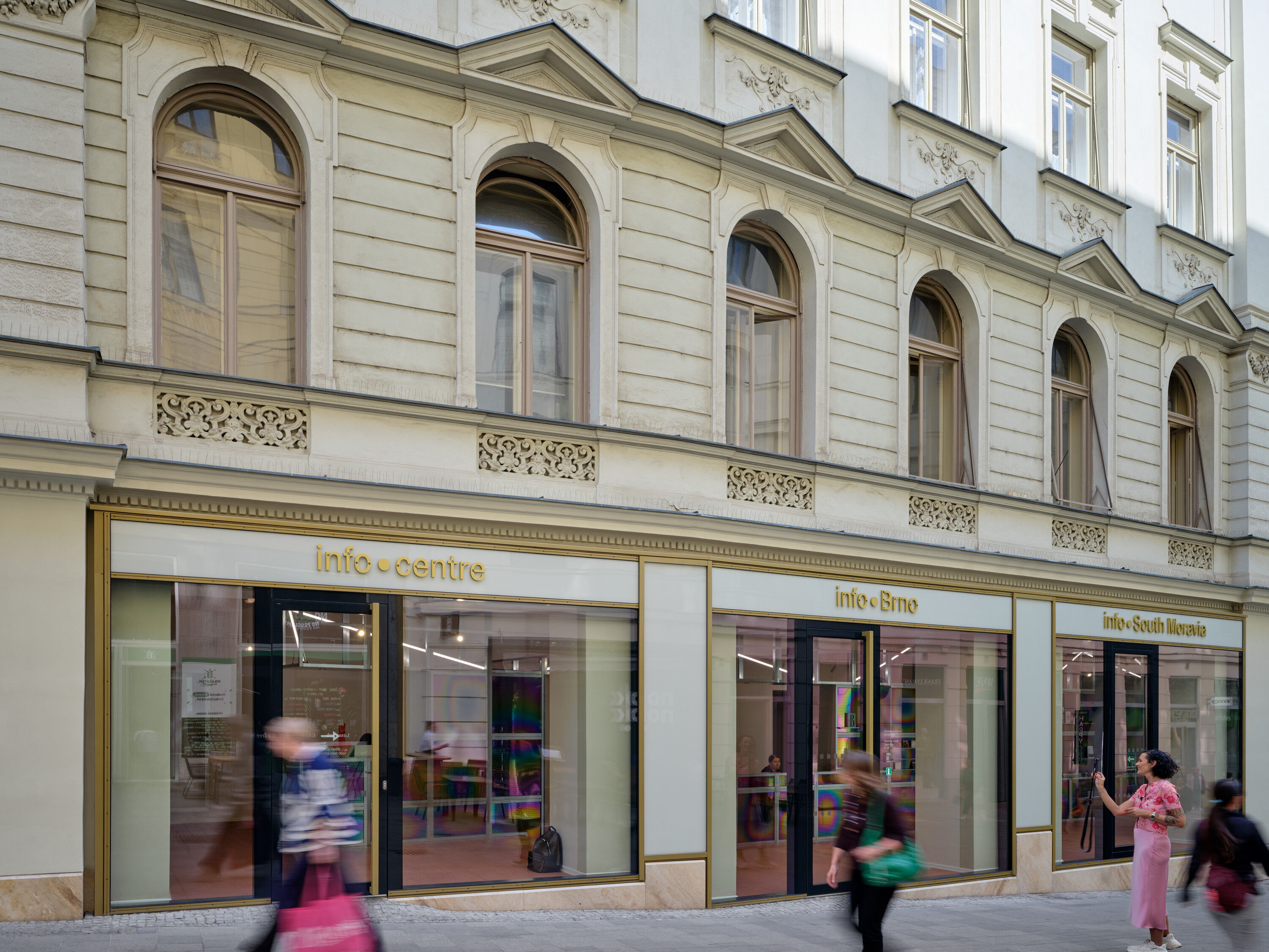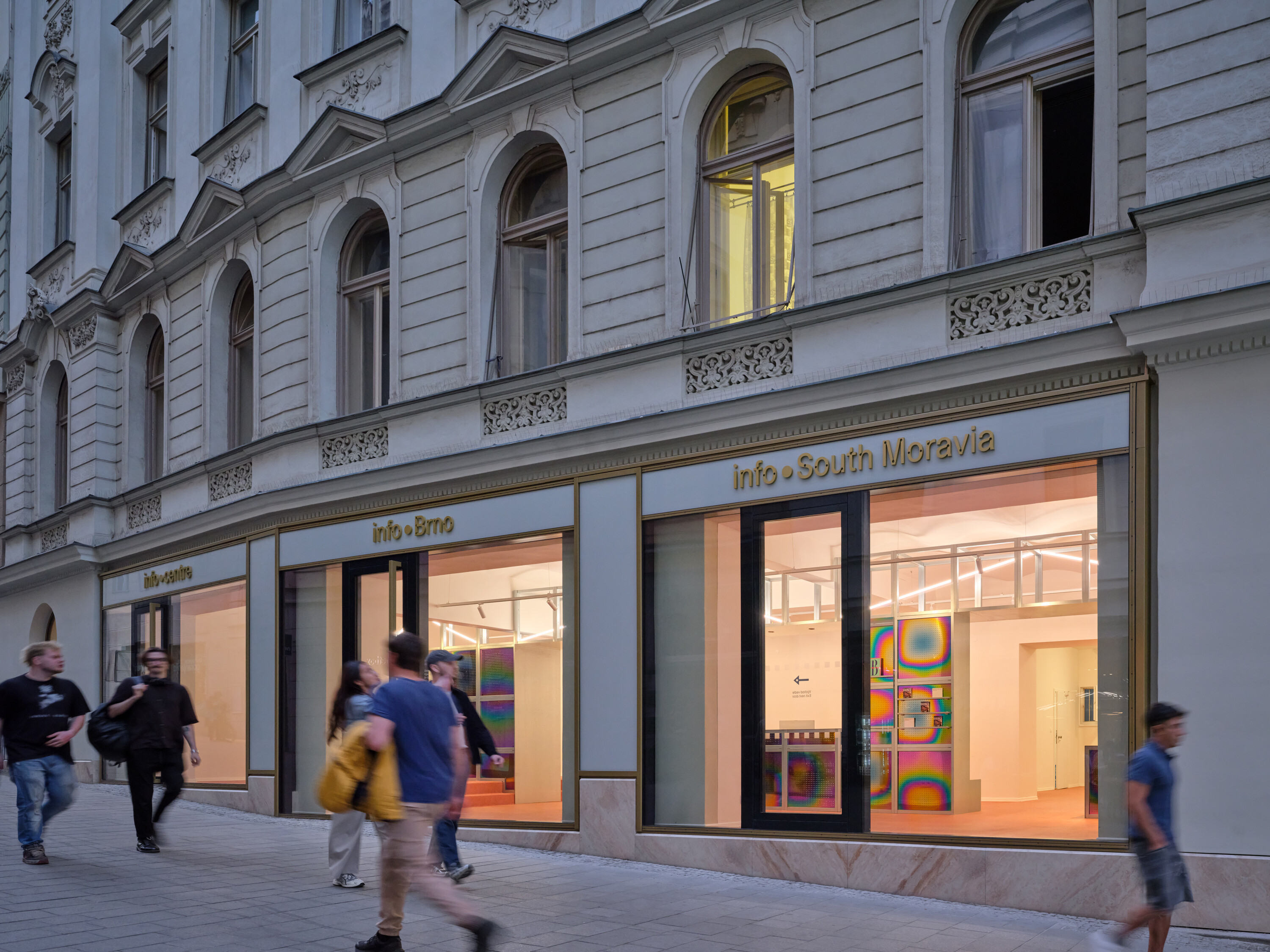 보호 문화재 건물 내에서 진행된 개입은 보존과 활성화 사이의 균형을 섬세하게 추구했다. 원래의 건축 리듬을 따르면서도, 지형 변화와 여러 시대에 걸친 임의적 개보수로 인해 변형된 입면을 정돈하였다. 새로운 개구부는 건물의 원래 구조 논리에 맞춰 도입되었고, 창턱을 제거해 거리와의 시각적 연속성과 투명성을 회복했다. 외부에는 경량의 캐노피를 설치해 간판을 통합하고, 접근성을 높이며 입면의 복잡성을 줄였다. 이 파사드 설계는 체코국립문화재관리청 및 브르노시 문화재과와 긴밀히 협의해 단계적 적용이 가능하도록 구성되어, 기존 임대 상점의 운영을 방해하지 않고 점진적으로 구현될 수 있다. 입면 하부에는 새로운 트라버틴 석재 띠가 도입되어 기존 건축물의 재료성과 조화를 이루며 견고한 기반을 형성한다. 반면, 캐노피는 가벼움과 개방감을 부여하며, 차분한 도시 경험을 위한 배경 역할을 수행한다.