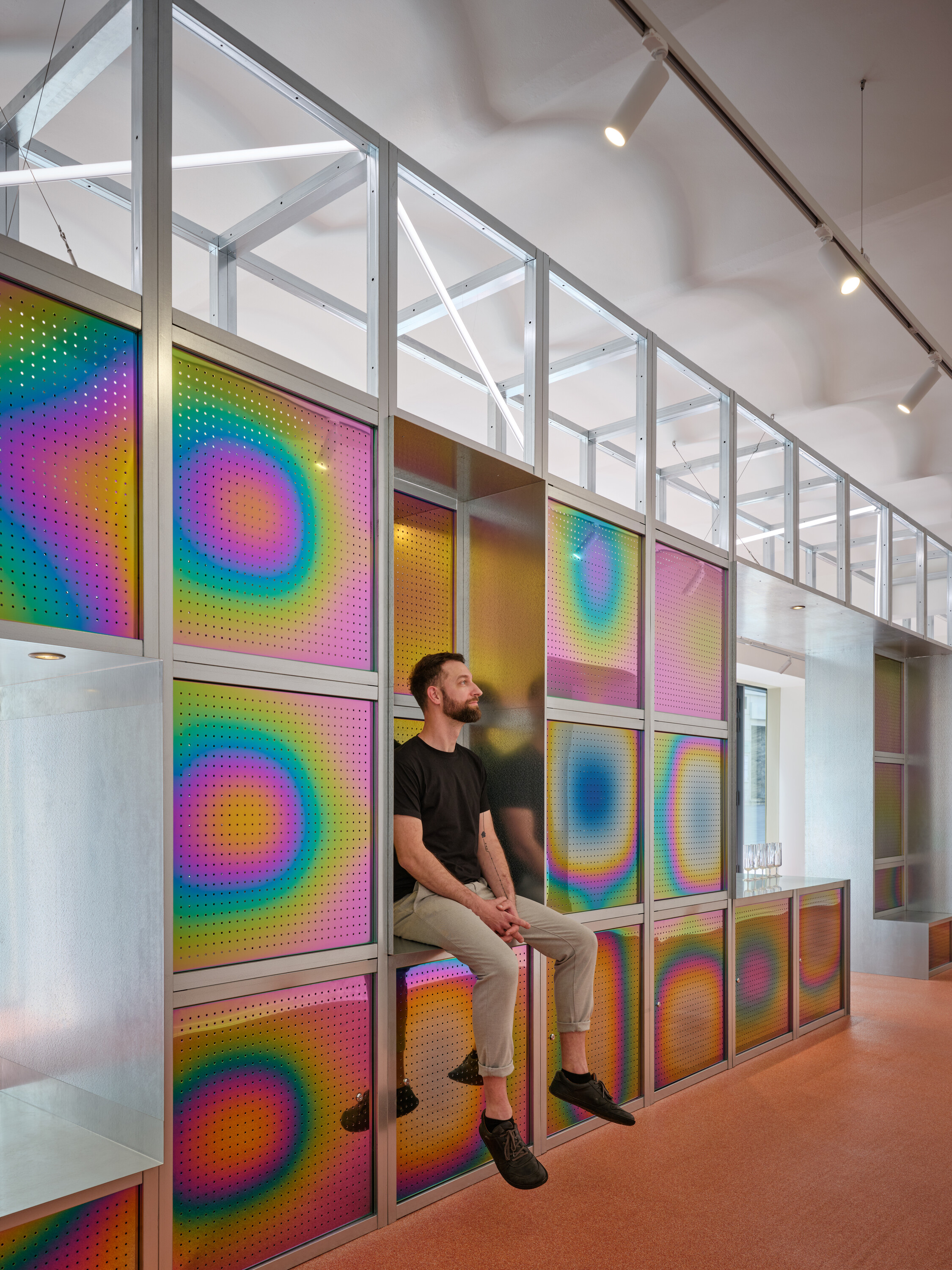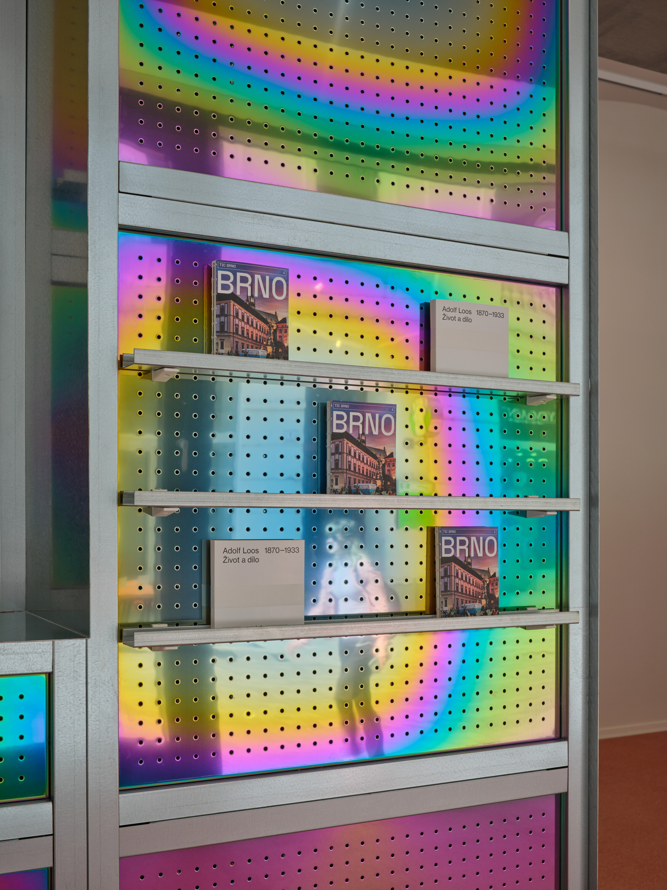 이 삽입 오브제는 첨단 금속 가공에 특화된 브르노의 가업 기반 제작소 DURO 디자인과 협업으로 완성되었다. 약 1년에 걸친 시제품 실험 끝에 최종 마감으로 채택된 것은 PVD(물리적 증착) 방식으로 티타늄 나이트라이드를 입힌 스테인리스 패널이다. 이 공정에 대기 가스를 도입함으로써, 각각의 패널마다 예측 불가능한 유광 색채 효과가 형성된다. DURO는 또한 오브제의 일체감을 유지하기 위한 맞춤형 결합 시스템도 개발했다. 이들은 산업 공정을 디자인 중심으로 재해석하는 장인적 태도를 실험, 기술, 재료 명확성 속에 구현했다. 티타늄 패널의 반짝임과 트라버틴의 질감이 이루는 대비는, 본 프로젝트의 핵심 의도—영속성과 변화, 장인정신과 실험, 유산과 현대 브르노의 정체성 사이의 대화를—상징적으로 드러낸다.