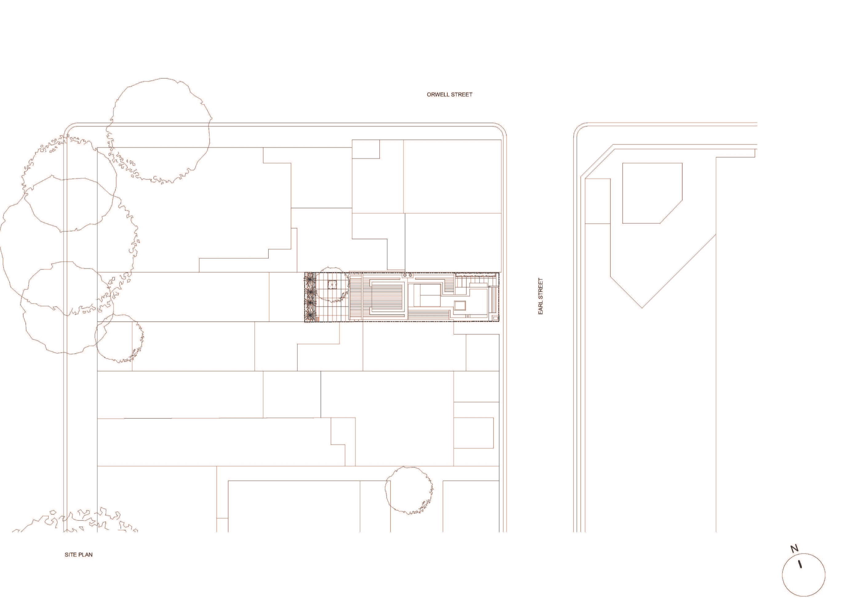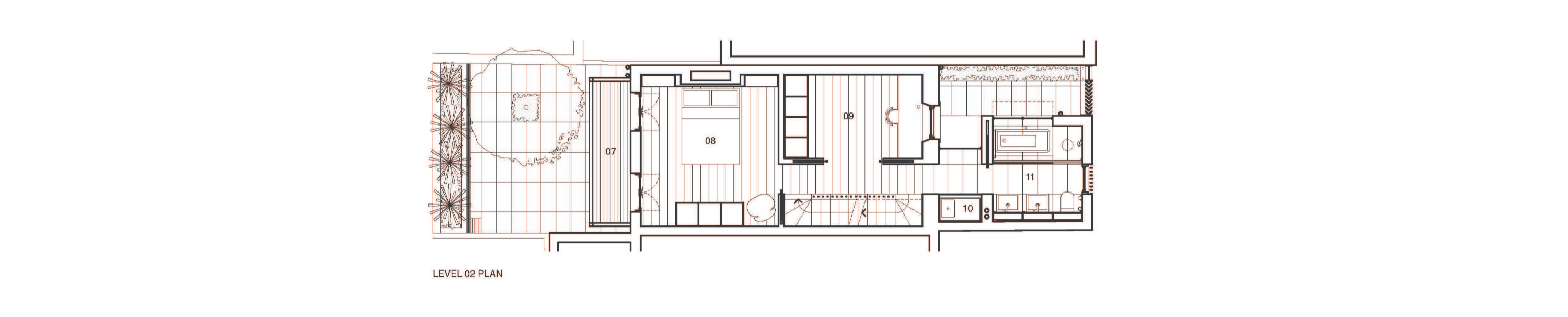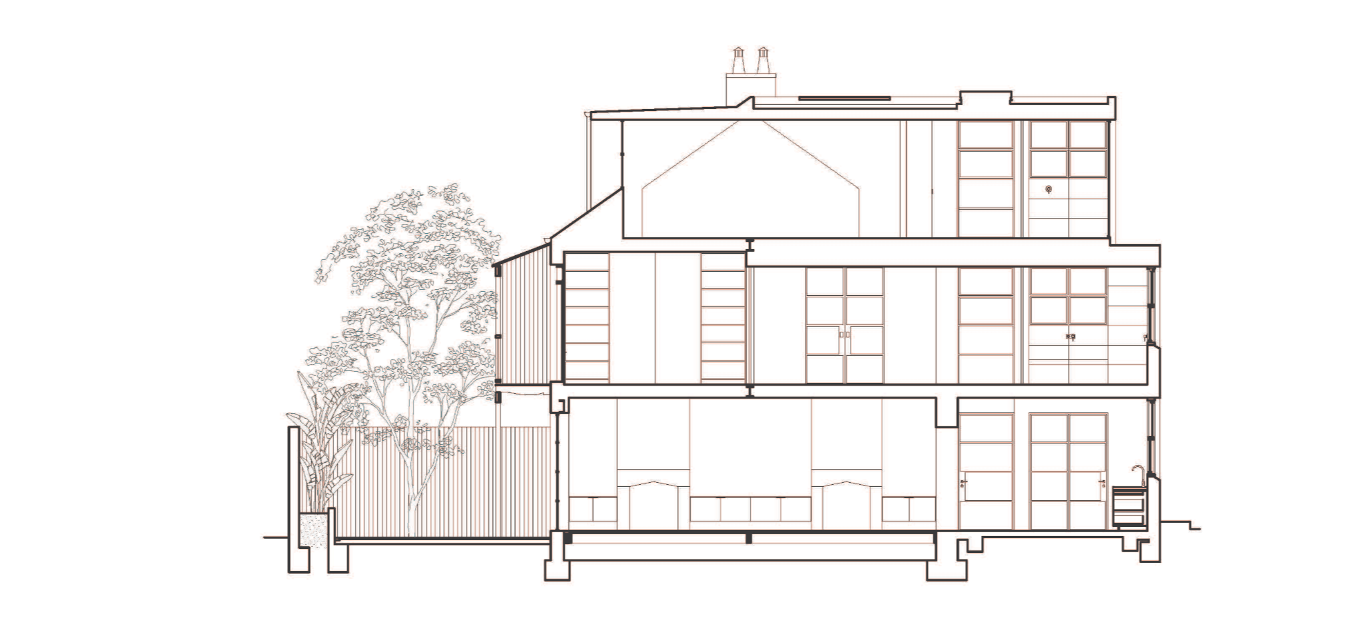 1863년에 지어진 동일한 형식의 사암 테라스 하우스 4채 중 하나였던 이 주택은 원래 빅토리아 스트리트에서 긴 전면 정원을 지나 진입하도록 계획되었다. 그러나 1980년, 대지의 전면부 절반이 분할되어 그 자리에 새로운 건물이 들어서면서 정원의 일부만 남게 되었고, 주 출입구는 후면 골목길 쪽으로 변경되었다. 이후 벽돌로 된 2층 높이의 후면 별채가 증축되었으며, 이 공간에는 주방과 욕실이 배치되었다. 건축주의 요구는 집에 더 적절한 진입 공간을 새롭게 구성하고, 거실 공간을 후면의 작은 중정으로 열어주며, 기존의 좁은 다락을 확장하고 그 공간을 위한 욕실을 추가하는 것이었다. 해당 주택은 문화재 보존 지역에 위치해 있었기 때문에, 시청은 100년이 넘은 후면 별채의 보존을 요구했으며, 새로운 증축부는 기존 건물과 명확히 구분되도록 설계할 것을 조건으로 내세웠다.