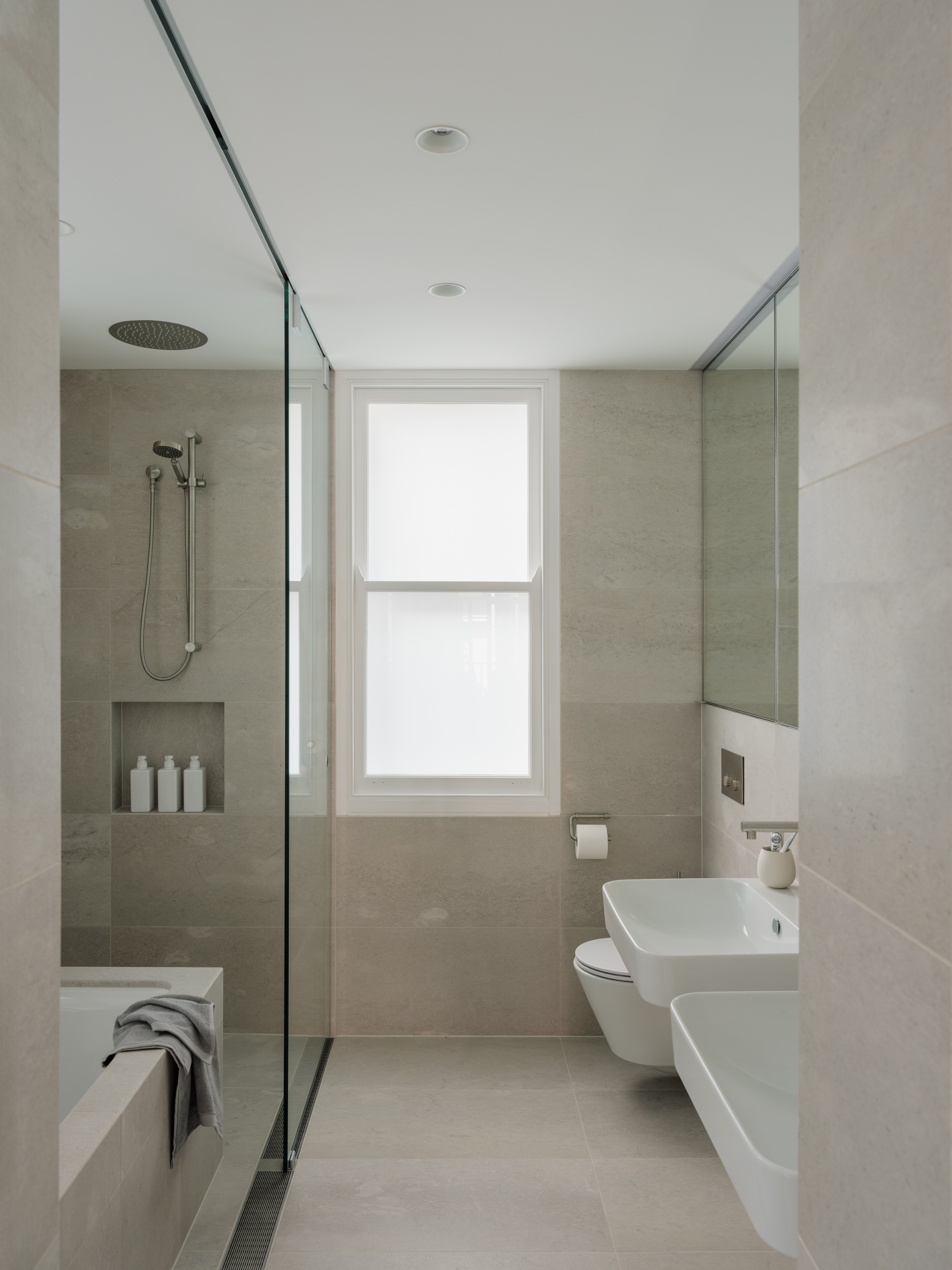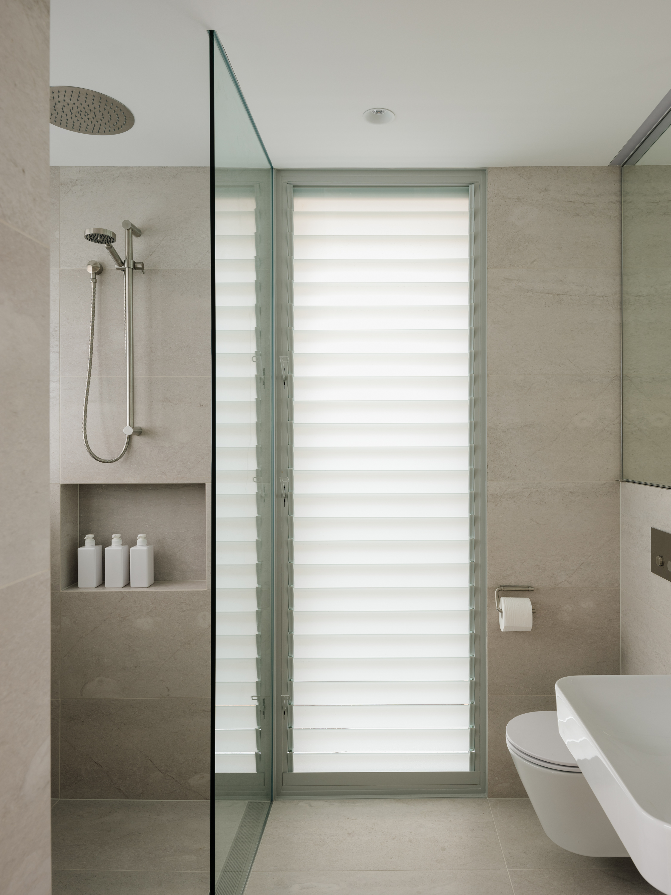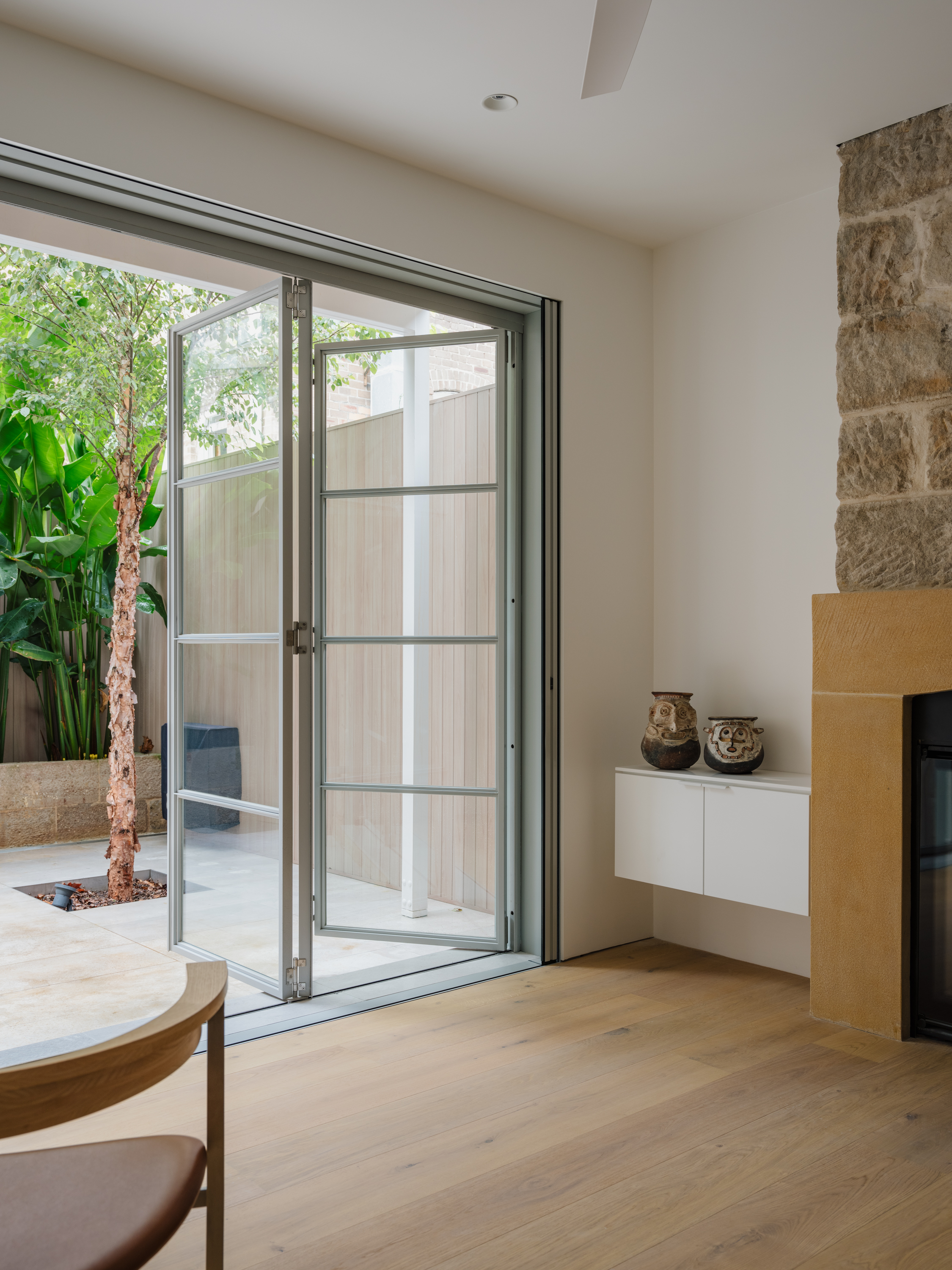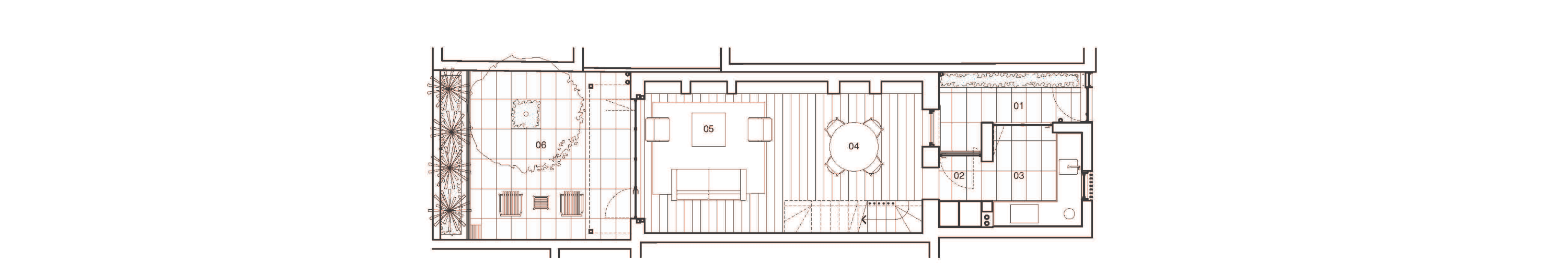 기존 주택 내부는 새로운 오크 마루로 마감되었고, 욕실과 주방, 중정에는 회색 트래버틴 석재를 사용해, 마감재를 통해 공간을 구분했다. 주요한 추가 요소로는 골목길에 접한 높이 5.2미터의 철제 입구 포털이 있으며, 하부에는 출입문이, 상부에는 프라이버시 스크린이 설치되었다.