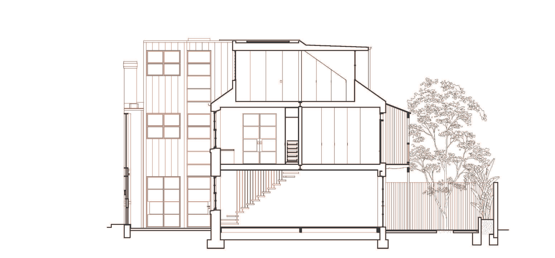 새롭게 증축된 부분은 철판으로 마감한 3층 규모의 타워 형태로 계획되었으며, 철제 프레임의 창호와 차양이 설치되었다. 반면 기존의 사암 외벽과 목재 프레임의 창호와 출입문은 원형대로 유지되었다. 새로운 공간의 중심에는 천창 아래에 철제와 목재로 구성된 계단이 놓여, 어두웠던 내부 공간에 깊숙이 햇빛이 들도록 했다. 신구의 경계에는 유리로 된 3층 높이의 연결부가 설치되어, 기존 외벽에 마련된 개구부를 통해 두 영역이 연결되었다. 이때 기존 외벽의 사암은 실내에서도 포털 형태로 드러나도록 계획되었다.