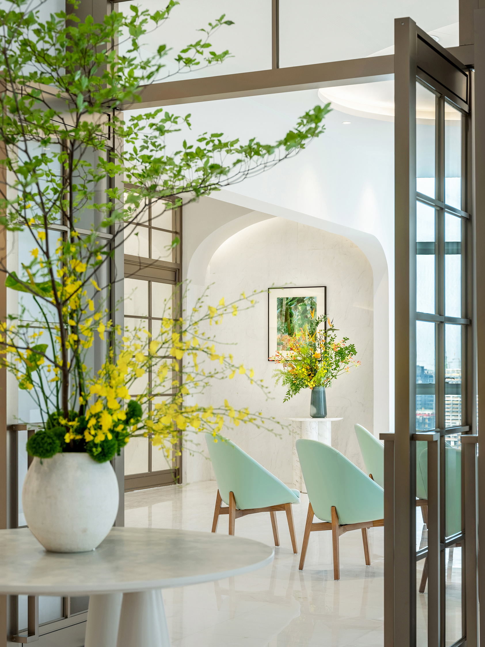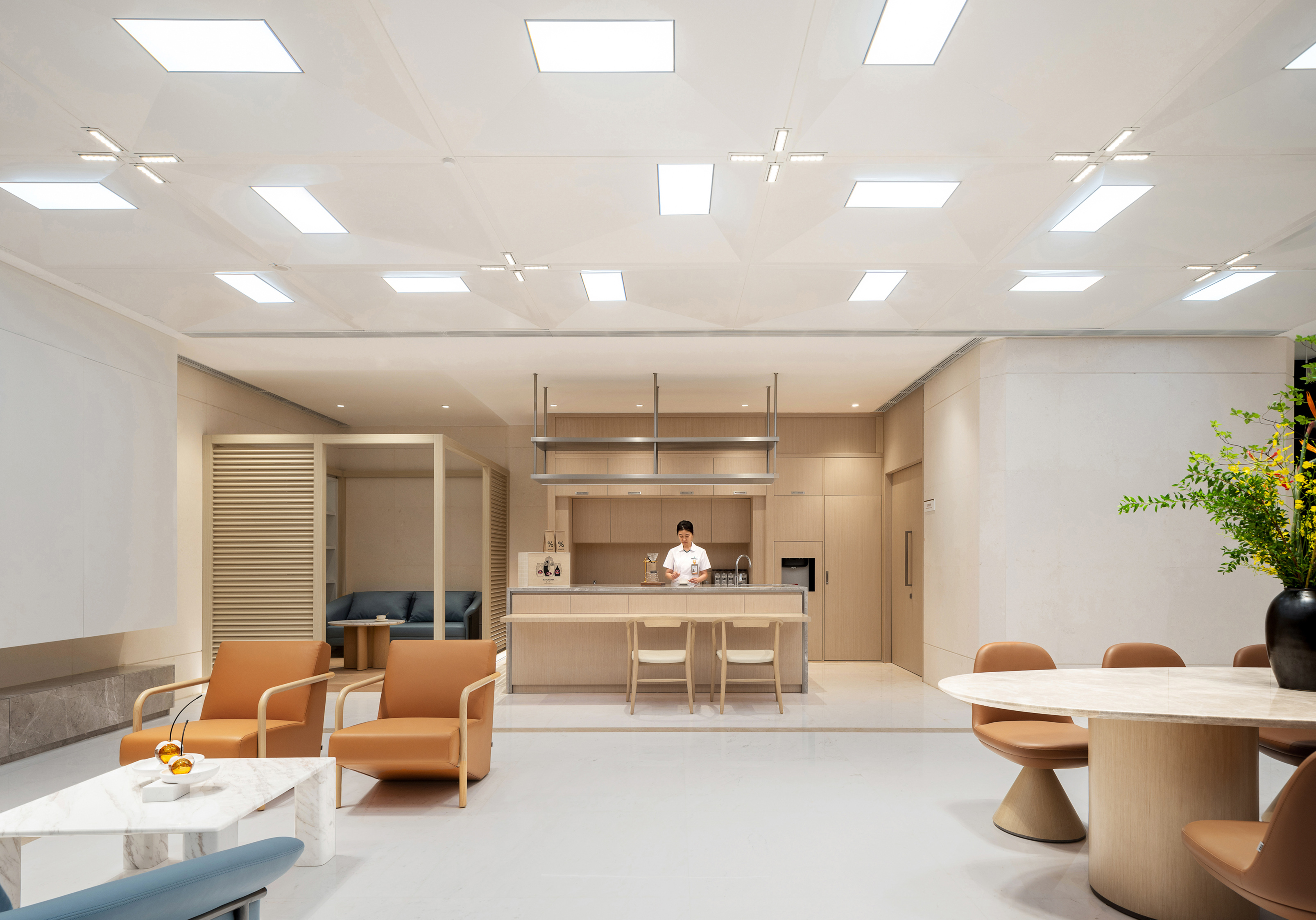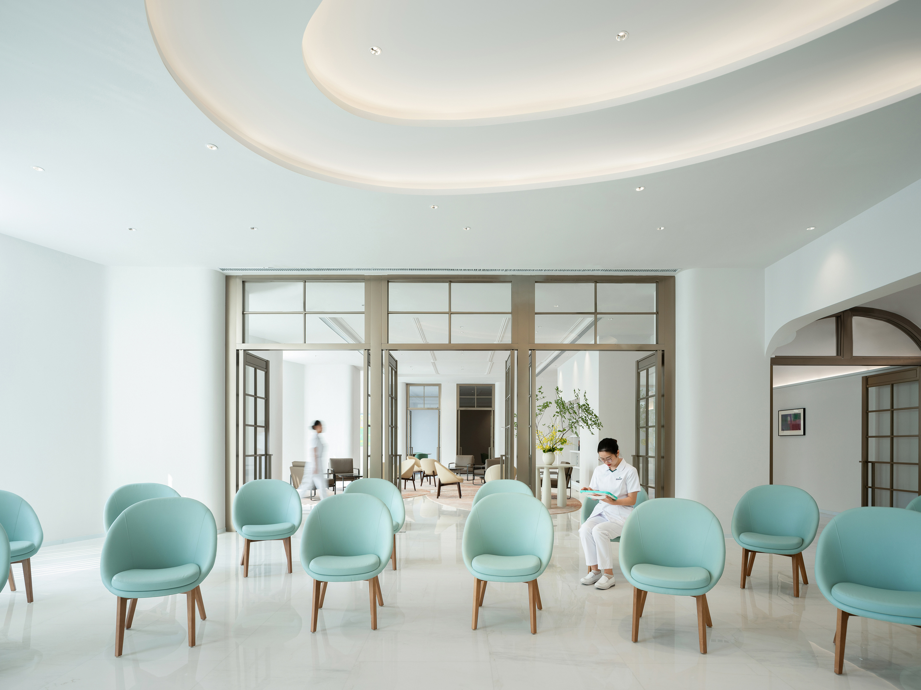 의료 환경에서 ‘공유, 유연성, 투명성’ 전략은 효과를 발휘하기 어렵다. 대신 ‘전문화, 격리, 보호, 차단’이 우선시된다. 국제 메디컬 센터는 이러한 맥락 속에서 정교한 균형을 이뤘다. 프라이버시는 환자의 편안함과 치료 결과에 있어 핵심 요소이지만, 과도한 고립은 외로움을 초래할 수 있다. 디자인은 다음과 같은 방식으로 이를 조율했다: 스크린 월, 은은한 경계 등 다층적 공간 구성을 갖춘 전용 출입구를 통해 배타성을 전달했다. 상담, 식사, 휴식을 위한 공간은 책장, 파티션, 플로럴 설치물 등 부드러운 경계 요소를 활용해 나뉘었으며, 연결감을 유지하면서도 사적 영역을 확보했다.