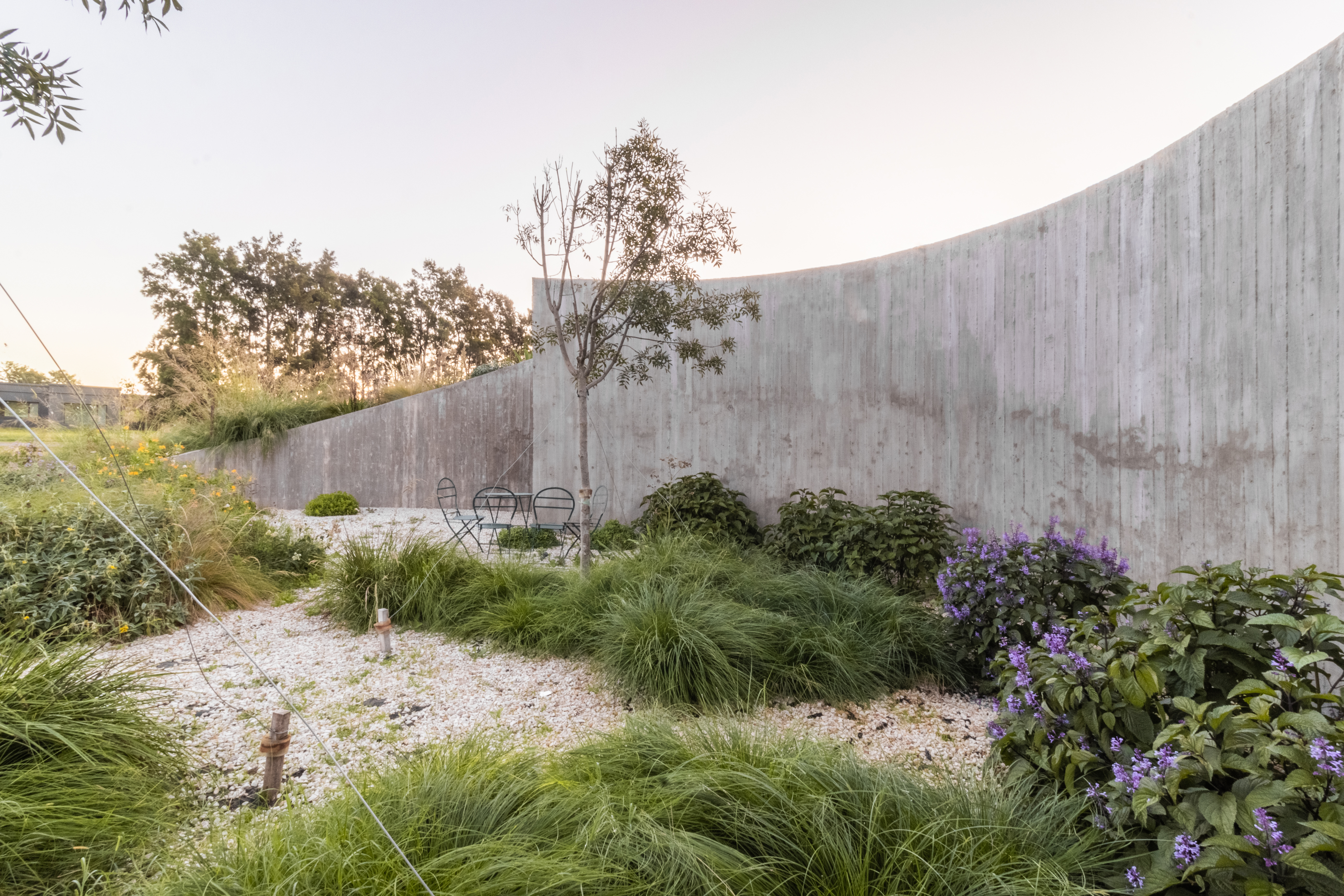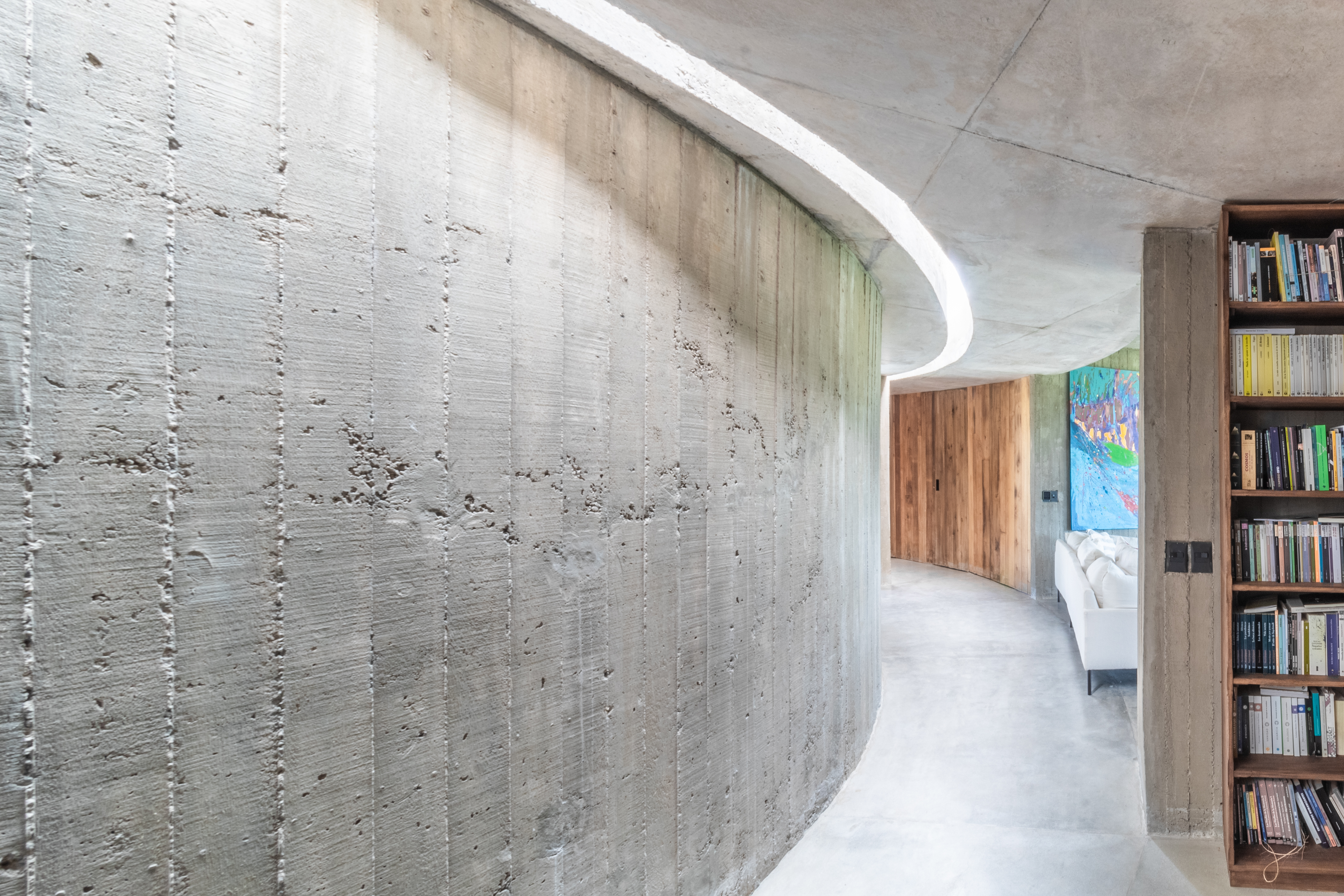 도시에서 오랜 시간 동안 협소한 공간에 머물렀던 건축주들은, 자연과 연결되고 다양한 장면과 상황을 만들어낼 수 있는 새로운 삶의 방식을 갈망했다. 이러한 개념은 두 단계의 과정으로 구체화되었다. 첫 번째 단계는 프로그램을 수용할 수 있는 선형의 바 형태를 설정하는 것이었다. 이어서 이 바를 휘어 양 끝을 연결함으로써, 꼭짓점도 경계도 없는 하나의 완전한 원형 구조를 형성했다. 기하를 파라메트릭하게 설정하면서, 개별 공간과 대지의 나머지 부분이 어떻게 연결될 수 있는지를 발견하기 시작했다. 이로 인해 다양한 상황들이 연출되었다.