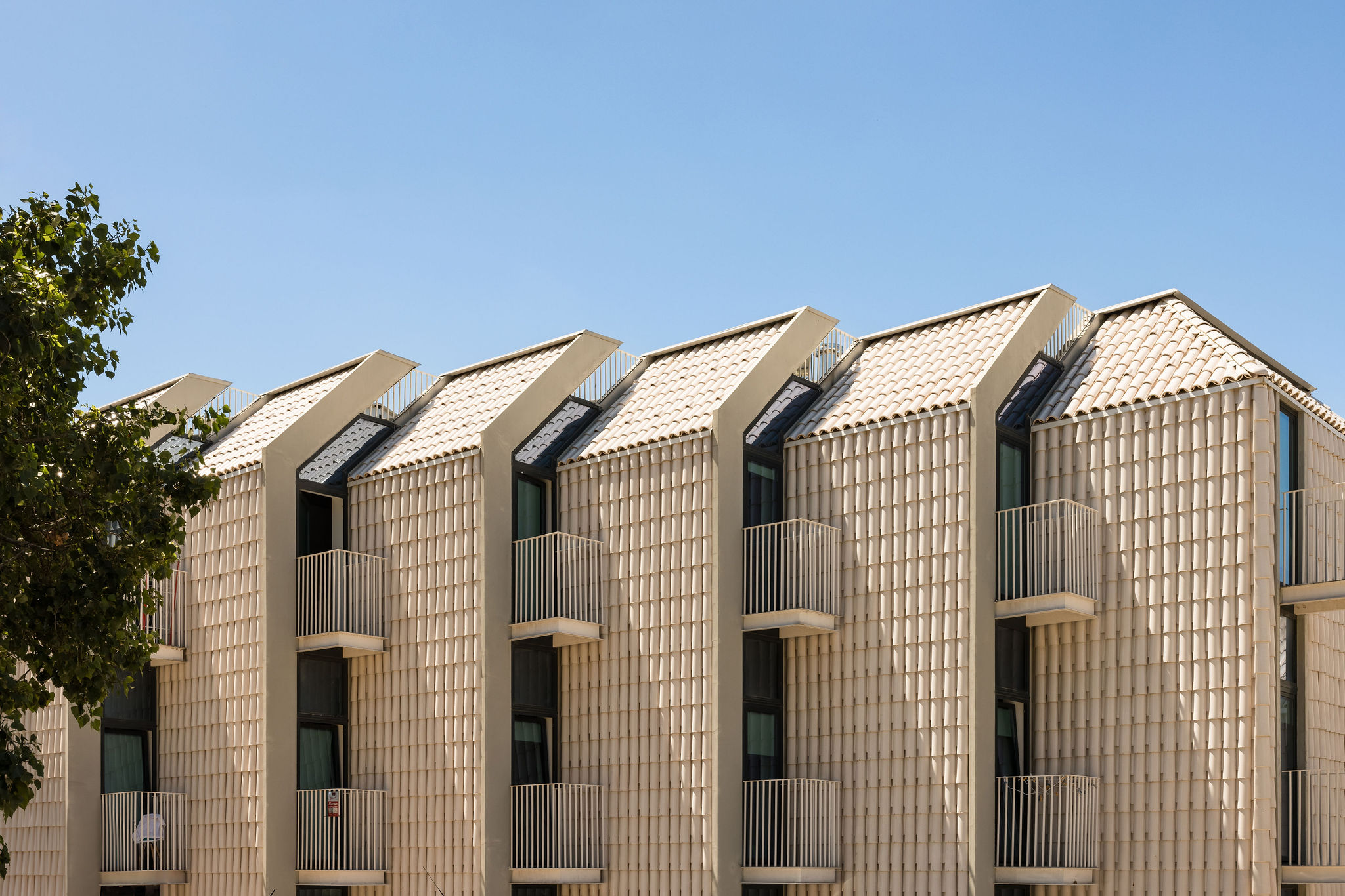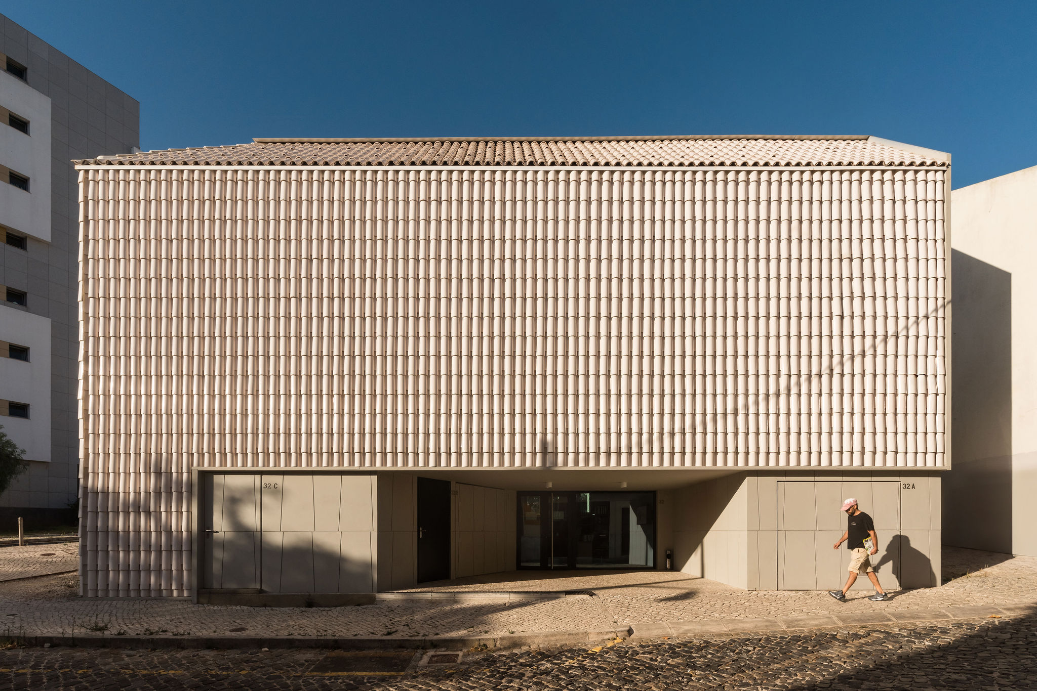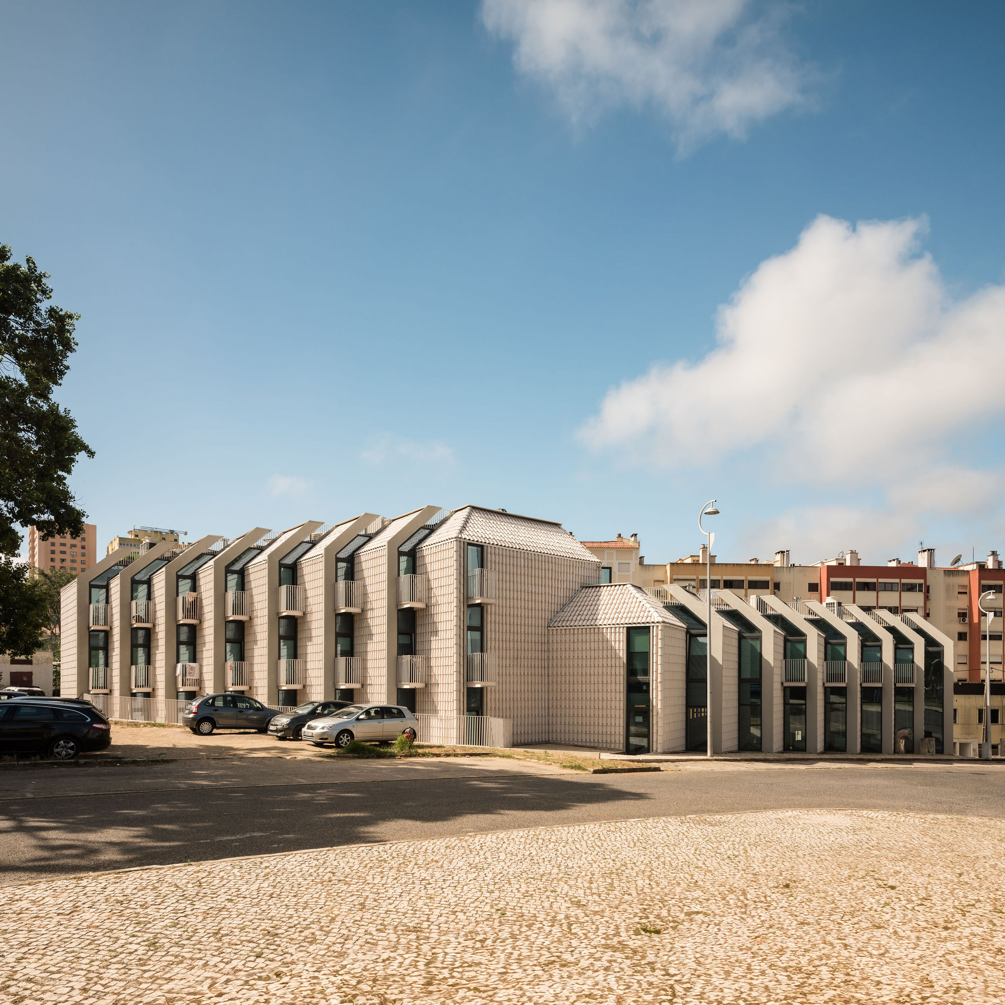 건축물의 외관은 인근 지역에 자리한 흰색 외벽과 테라코타 채널 지붕 타일을 지닌 전통 가옥에서 착안했다. 건축가는 두 요소를 결합해 백색 유약 처리된 테라코타 지붕 타일을 맞춤 제작했으며, 이를 입면에도 적용했다. 이러한 세라믹 타일은 1930년대에 인근에 위치했던 ‘Viuva Lamego’ 도자기 공장에 대한 역사적 맥락도 반영한다. 반사 타일은 태양열을 차단하고, 건물 전체에 자연 환기층을 형성해 에너지 효율을 높이며, 동시에 지역의 소규모 전통 건물과 시각적 연속성을 유지하는 한편, 주변 신축 주거 단지 속에서 독창적인 디자인으로 돋보이는 지표가 된다.