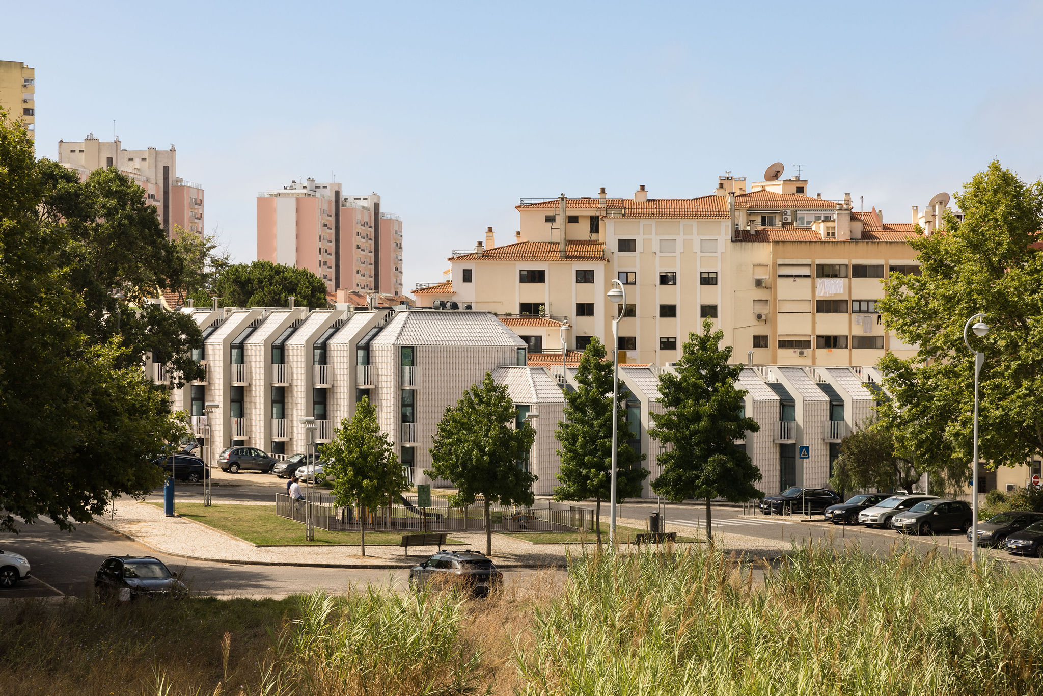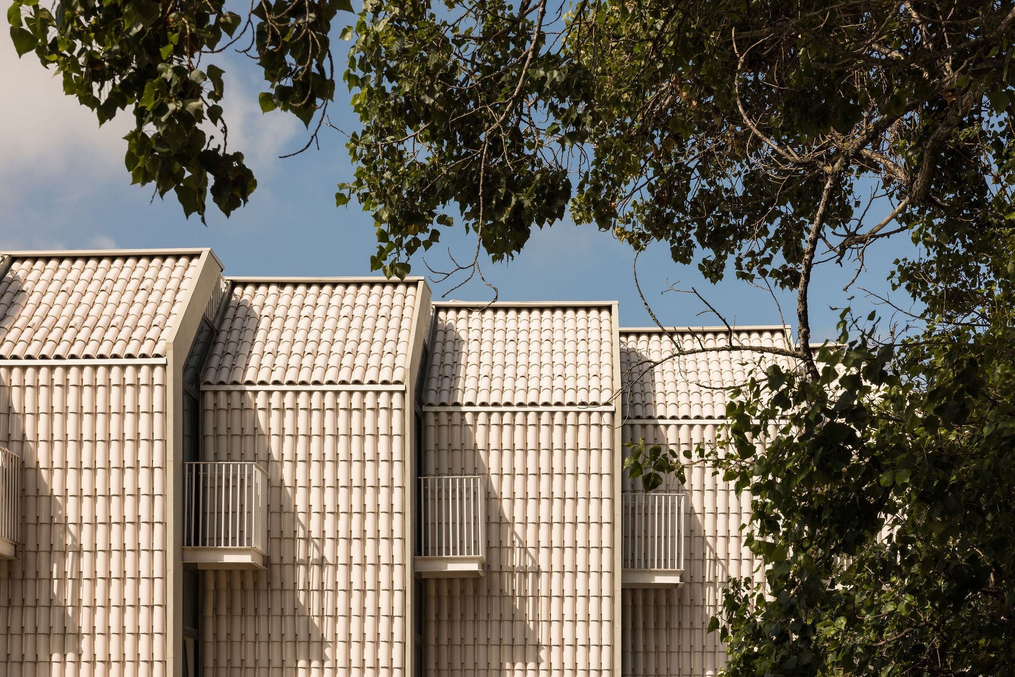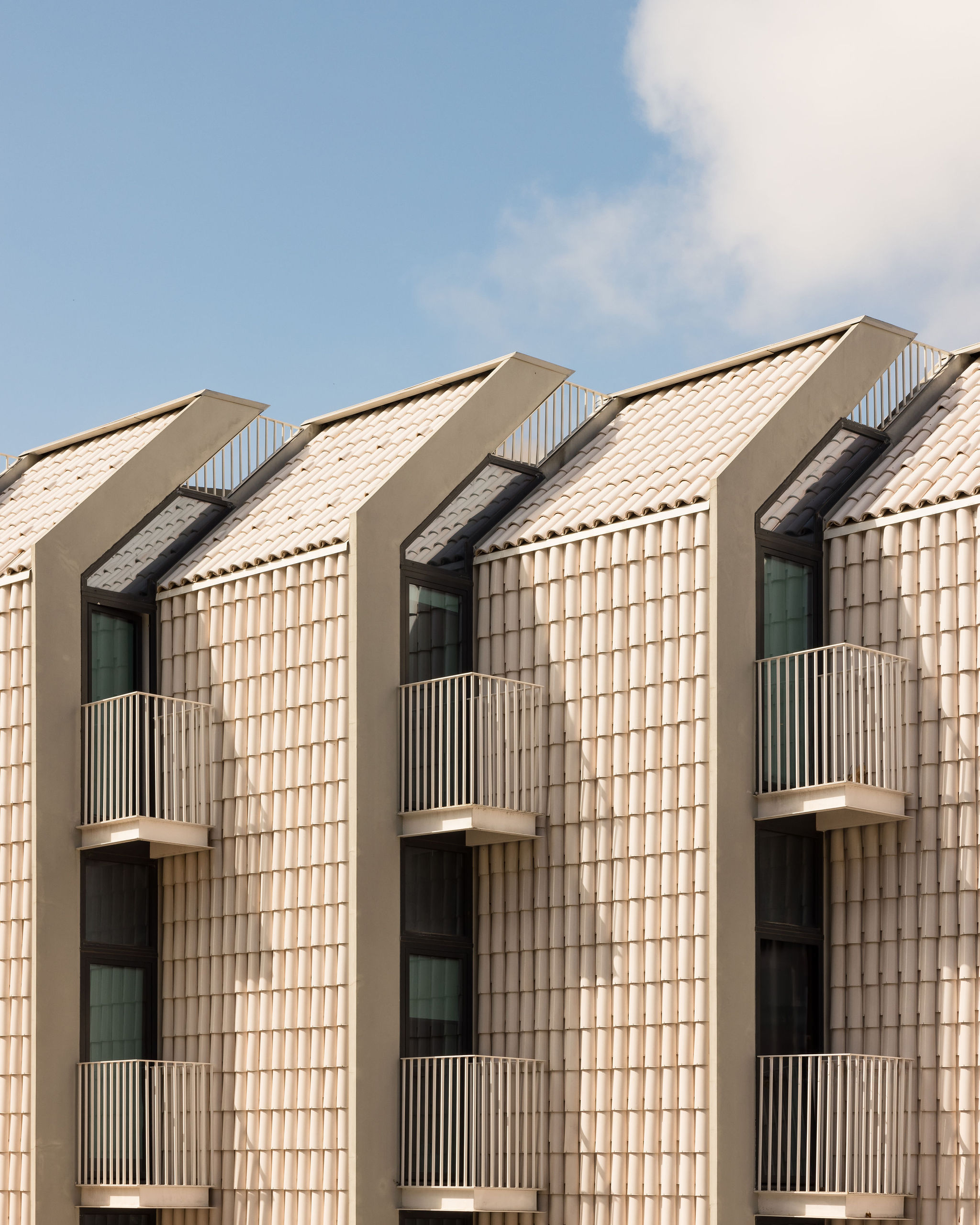 건축물의 외관은 인근 지역에 자리한 흰색 외벽과 테라코타 채널 지붕 타일을 지닌 전통 가옥에서 착안했다. 건축가는 두 요소를 결합해 백색 유약 처리된 테라코타 지붕 타일을 맞춤 제작했으며, 이를 입면에도 적용했다. 이러한 세라믹 타일은 1930년대에 인근에 위치했던 ‘Viuva Lamego’ 도자기 공장에 대한 역사적 맥락도 반영한다. 반사 타일은 태양열을 차단하고, 건물 전체에 자연 환기층을 형성해 에너지 효율을 높이며, 동시에 지역의 소규모 전통 건물과 시각적 연속성을 유지하는 한편, 주변 신축 주거 단지 속에서 독창적인 디자인으로 돋보이는 지표가 된다.