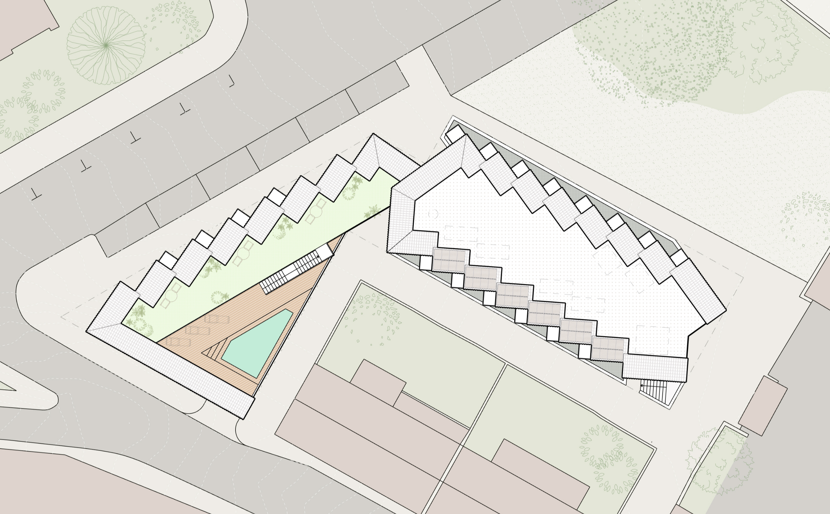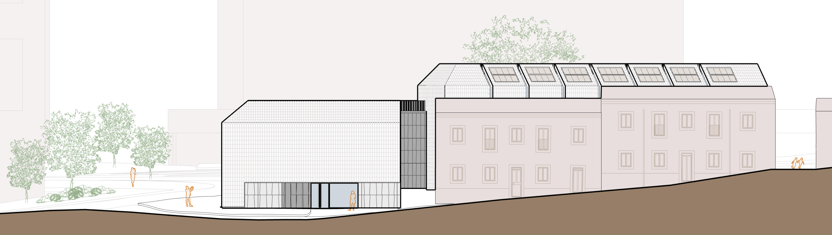 건물은 ‘공동의 집’이라는 개념 아래 설계되었다. 각 방은 저마다 독립적인 지붕 모듈을 갖고 있으며, 지붕과 외벽이 하나의 연속된 형태로 설계되어 마치 지면에서 자연스럽게 솟아오른 듯한 인상을 준다. 매스는 여러 방향으로 분절되고 꺾인 형태를 띠며, 다양한 입체감을 연출하는 동시에 채광을 극대화하고 대지의 형태에 최적화된 실 배치를 가능하게 했다.