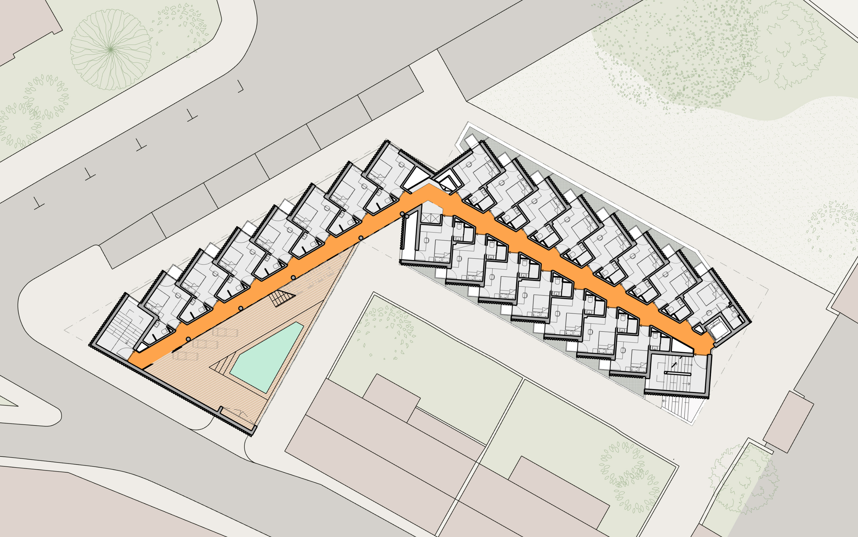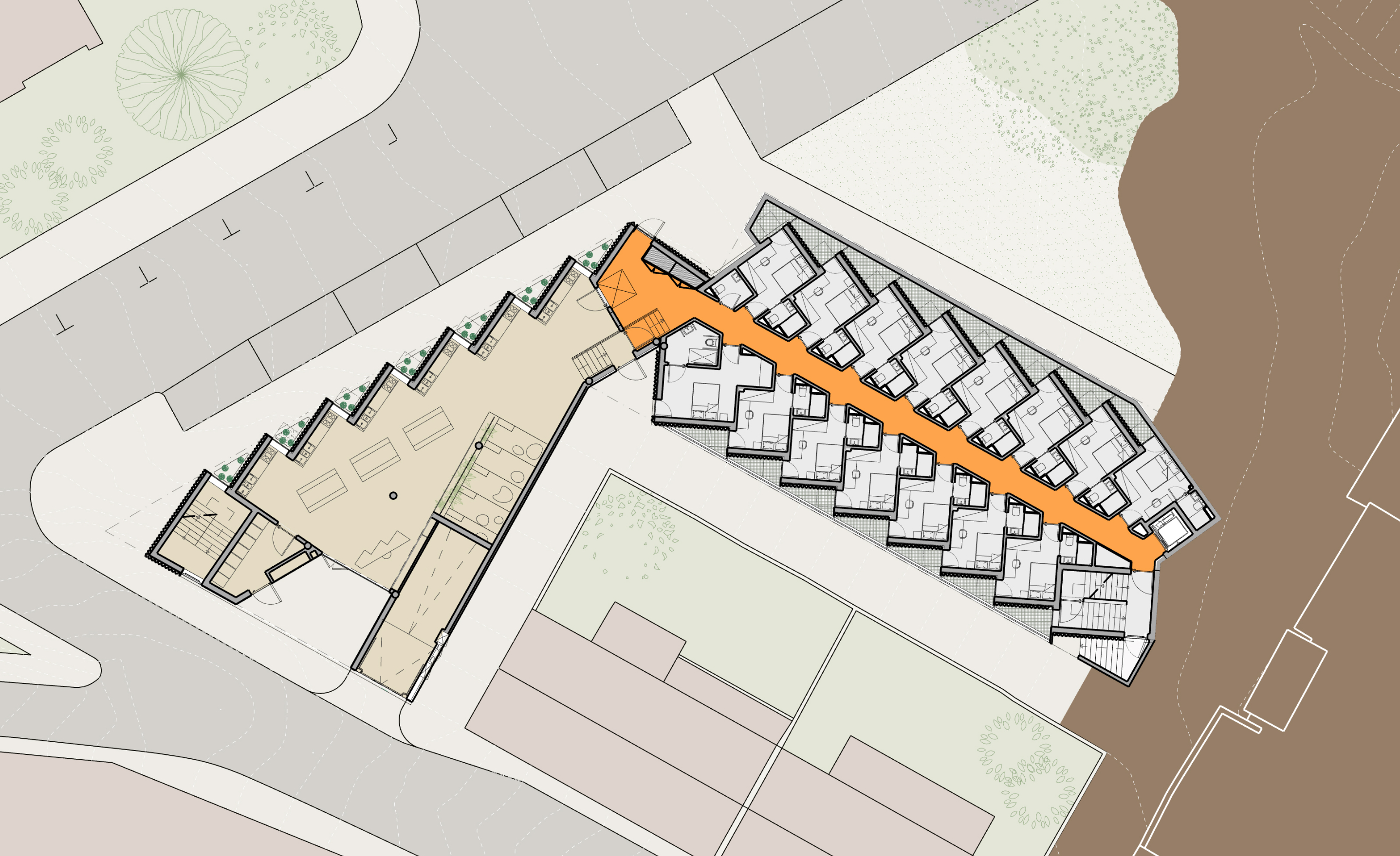 건물은 총 52개의 욕실 포함형 객실로 구성되며, 모든 방은 전용 발코니, 샤워실, 수납장, 더블 침대를 갖추고 있다. 학생들은 체육실, 게임룸, 옥상 테라스, 수영장 등 다양한 공용 커뮤니티 공간도 함께 사용할 수 있다. 이 프로젝트의 중심 공간은 이단 계단식 좌석이 있는 복층 높이의 주방 및 거실로, 학생 간의 자연스러운 교류와 공동체 형성을 유도한다.