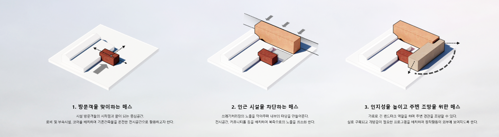 기존건물과 신축건물의 접점을 최소화 하였으며 기존 건물은 거대한 하나의 메인전시관으로, 덧대어진 신축 건물은 이러한 기능을 서포트하는 부속공간으로 생각하였다. 동선의 과정에서 기존건물과 신축건물을 오가며 시각적으로 시퀀스를 완성하게 된다. 또한 신축건물은 기존건물을 위요하는 배치로 각 매스 별로 부속 기능을 가지며, 다양한 외부공간을 조성하며 전체적인 문화테마파크를 완성한다.