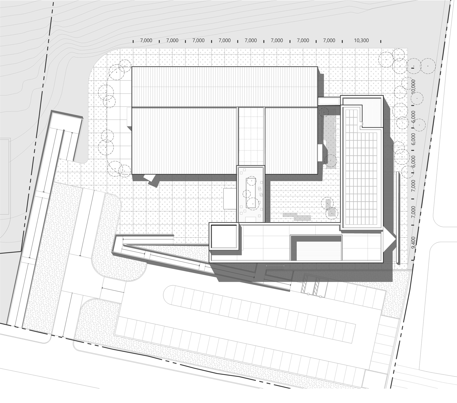 경사지 위에 숨겨져 있는 듯한 기존 부지와 건물을 시각적으로 노출시키고 접근성을 고려해 대지의 경사를 조정하였고 후면의 경사진 풍부한 녹지, 기존건물의 경사지붕은 또 하나의 경관으로 이용하고자 한다. 시각적 간섭과 방문객의 접근성을 고려해 주차장의 레벨을 조성하였다.