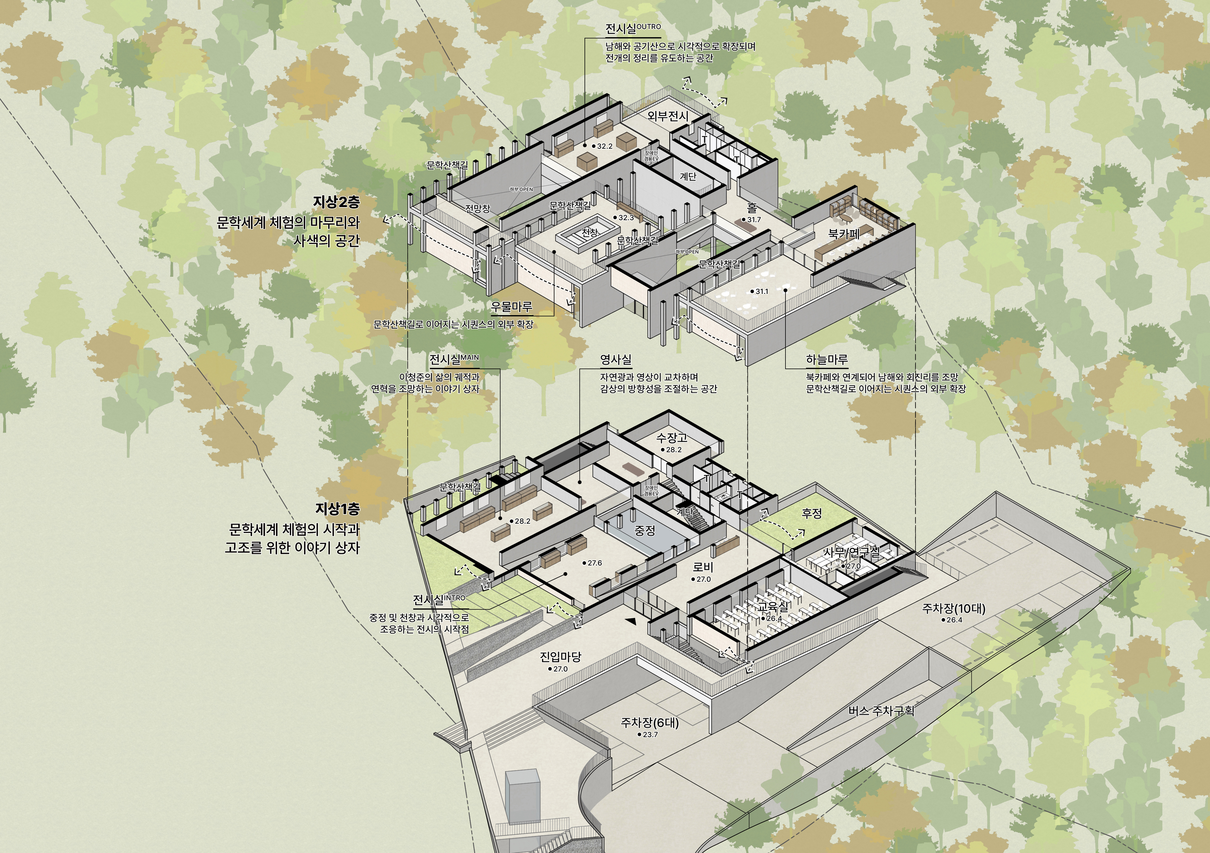 문학 형식의 건축화를 위해 이청준 작가가 소설에 주로 활용한 액자식 구성을 재해석하여, 이를 '중첩된 이야기 상자'의 3차원적 구조로 환원한다. 즉, 소설의 문학적 특징을 건축적으로 차용함으로써 이청준 문학세계를 온전히 구현한다. 개별 이야기 상자에 주어진 전시 및 부속 프로그램을 충실히 수용하고 이를 시지각적으로 연결하여 유기적인 체험을 유도한다.