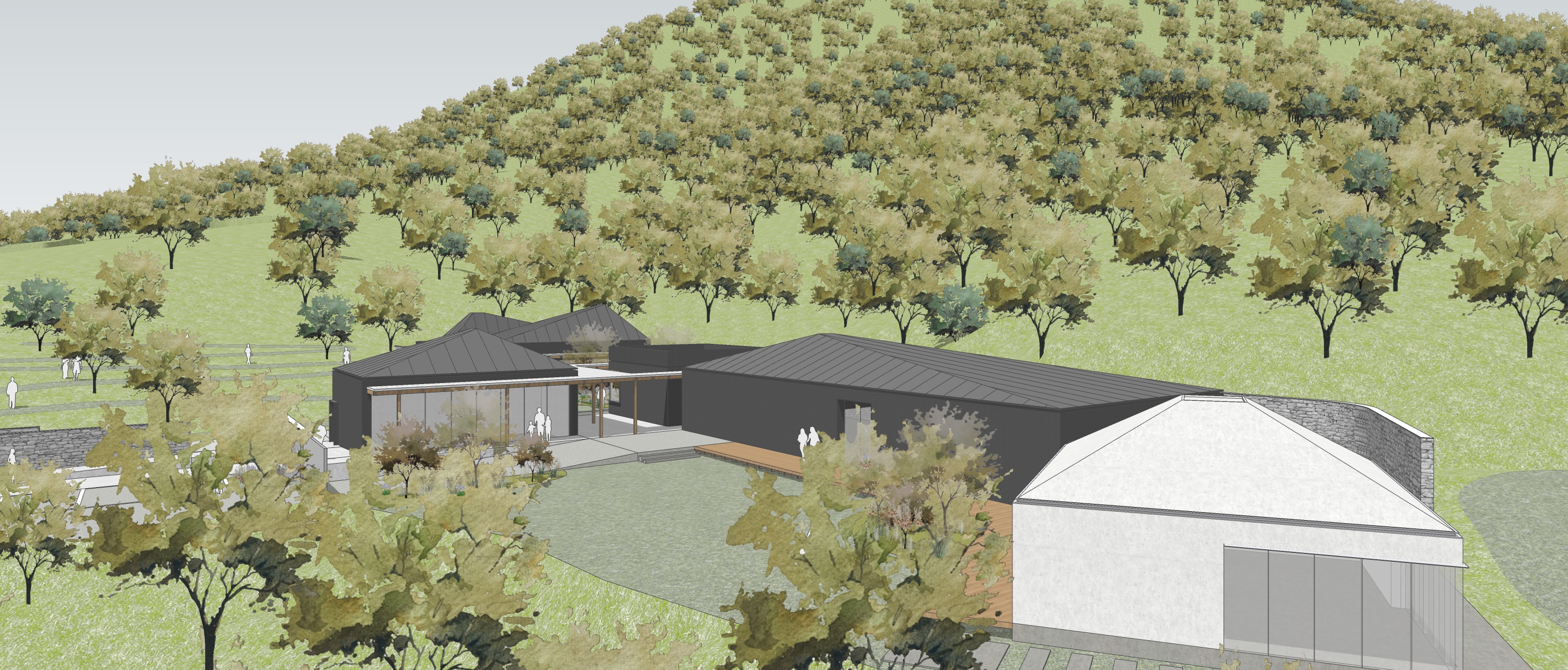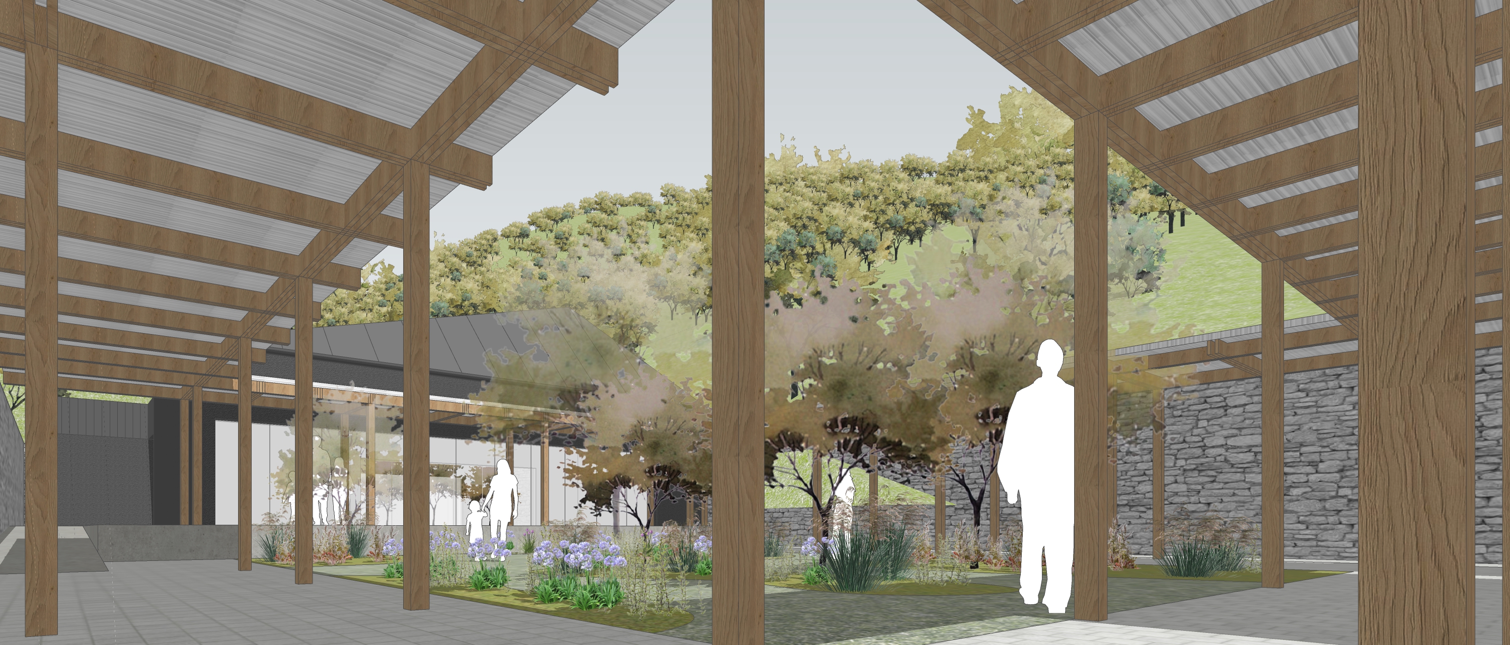 대지는 바다를 향해 완만히 열리고, 마을과 들판, 숲이 각기 다른 속도로 흐른다. 우리는 이 다양한 경사와 시야, 접근 조건을 존중하며, 자연스러운 동선 흐름과 공간의 리듬을 설정했다. 입구에 위치한 웰컴센터는 지역 주민과 관람객 모두에게 열려 있는 중립의 공간으로 계획되었고, 꿈의 언덕은 문학관의 주요 축에서 가장 높은 곳에 위치하며 바다를 조망하는 이상적 공간으로 작동한다. 이곳에서부터 전시가 시작되는 이상의 뜰로, 그리고 전시동과 유채마당, 회귀의 뜰까지. 공간은 물리적으로 하강하면서, 기억과 감정은 고조되는 역진적 감정의 흐름을 유도한다. 마지막에 다시 돌아오는 회귀의 뜰은 단순한 순환형 동선의 반환점이 아니라, 삶의 원점으로 되돌아온 작가의 시선을 담은 장소로 작동한다.