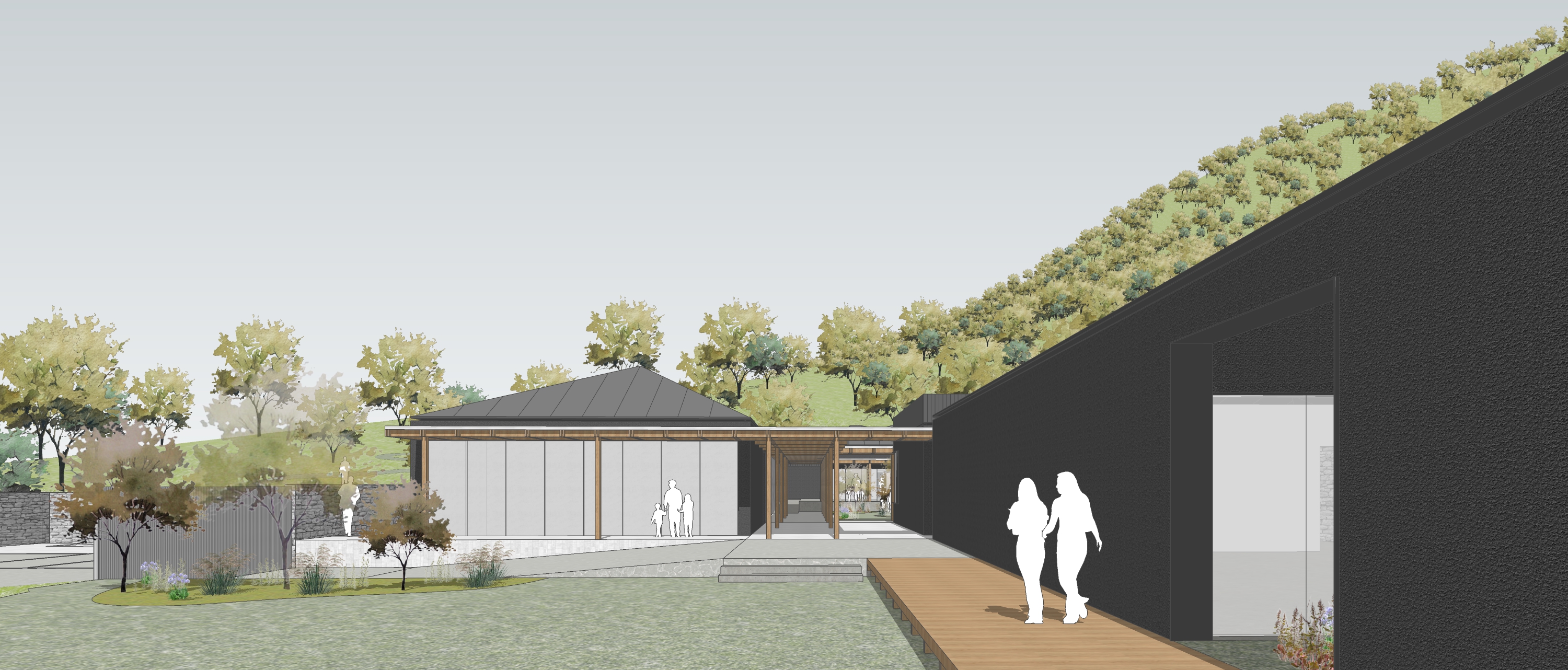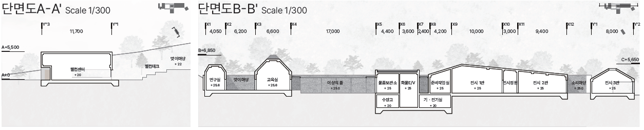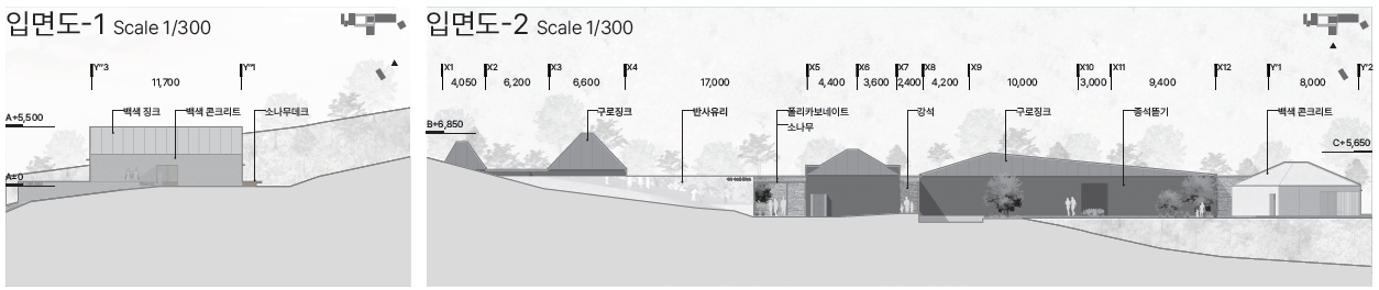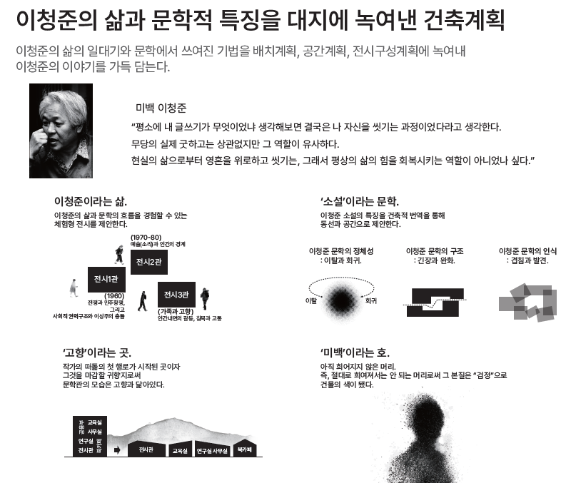 전체 매스는 전시동과 교육동을 포함하되, 분절된 형태로 나누어 배치했다. 이 분절은 이청준 문학의 구조처럼 긴장과 완화를 반복하며 공간에 리듬을 만든다. 건물의 높이는 주변 주거지와 어울리도록 낮게 설정되었고, 지붕의 경사는 마을의 지붕선과 조응하면서도, 작가의 사유곡선을 닮은 미묘한 틀어짐을 담았다. 외장 재료는 시간에 따라 질감이 변하는 목재와 짙은 색조의 벽돌을 중심으로 구성하였으며, 전체적으로는 조용하고 물러난 색감 위에, 일부 전시 영역에서는 다채로운 재질감으로 감각적 긴장을 부여했다. 건축은 전면에 나서지 않되, 배경이 아니라 장면으로 존재하도록 계획되었다.