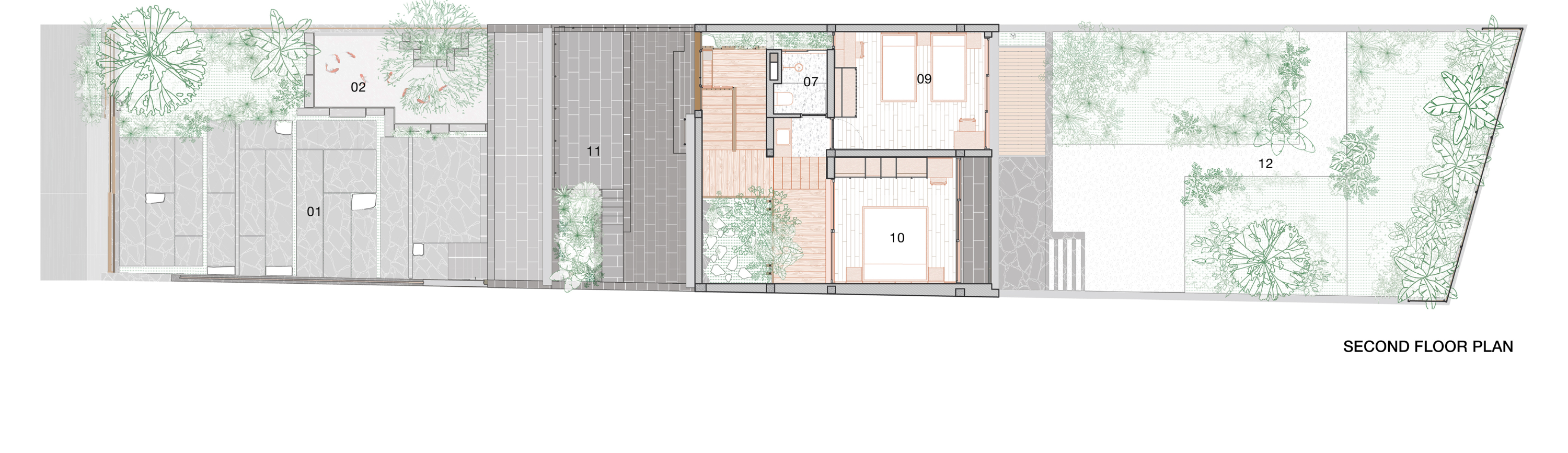 내부에서 외부로, 외부에서 내부로 흐르는 두 방향의 설계 전략을 통해 다양한 건축 요소와 조경 요소가 중첩되며 공간을 구성한다. 이로써 공간에 깊이가 생기고 실내외 경계가 부드럽게 전환된다. 일부 실내 공간에는 조경 재료를 적용해 건축과 자연이 조화롭게 어우러지도록 했다.