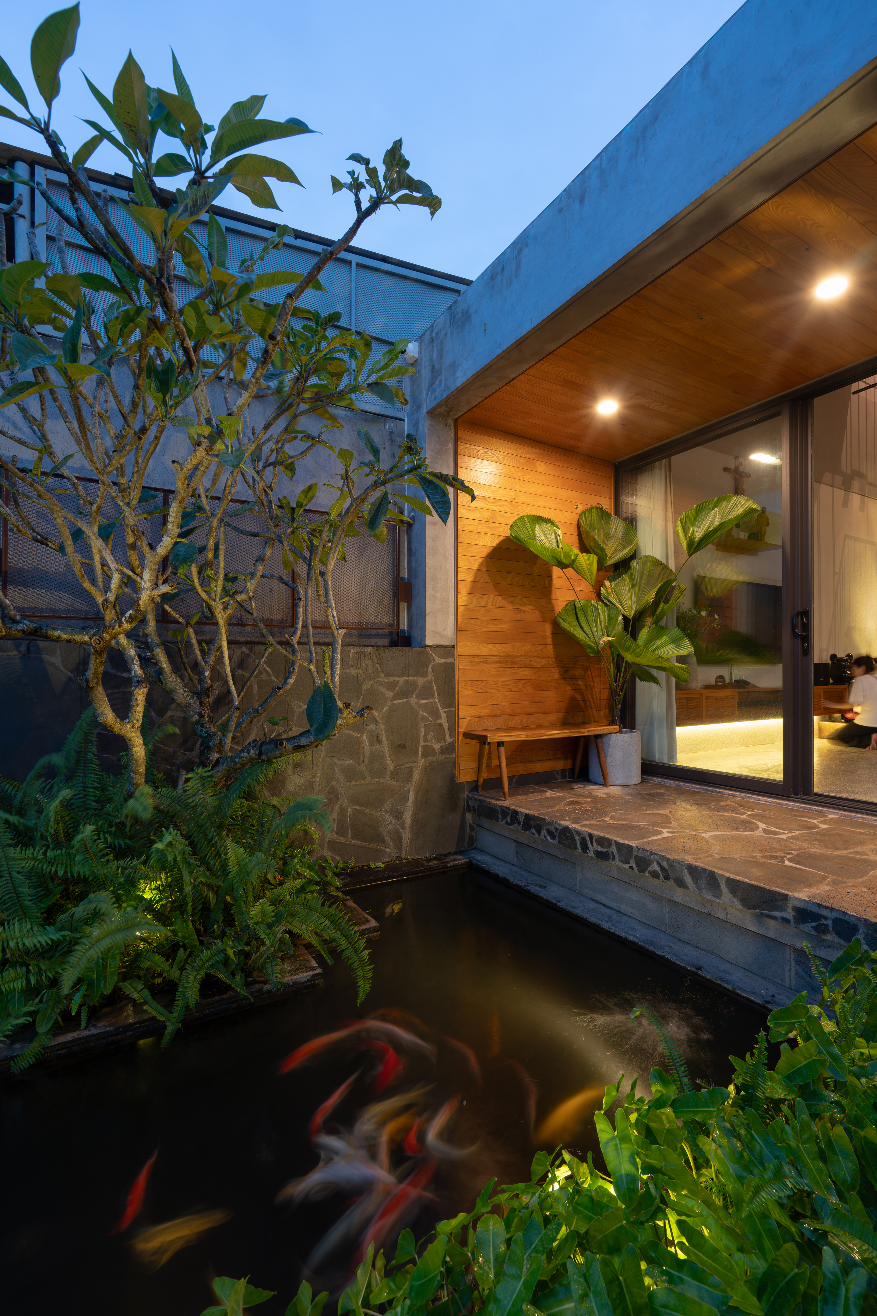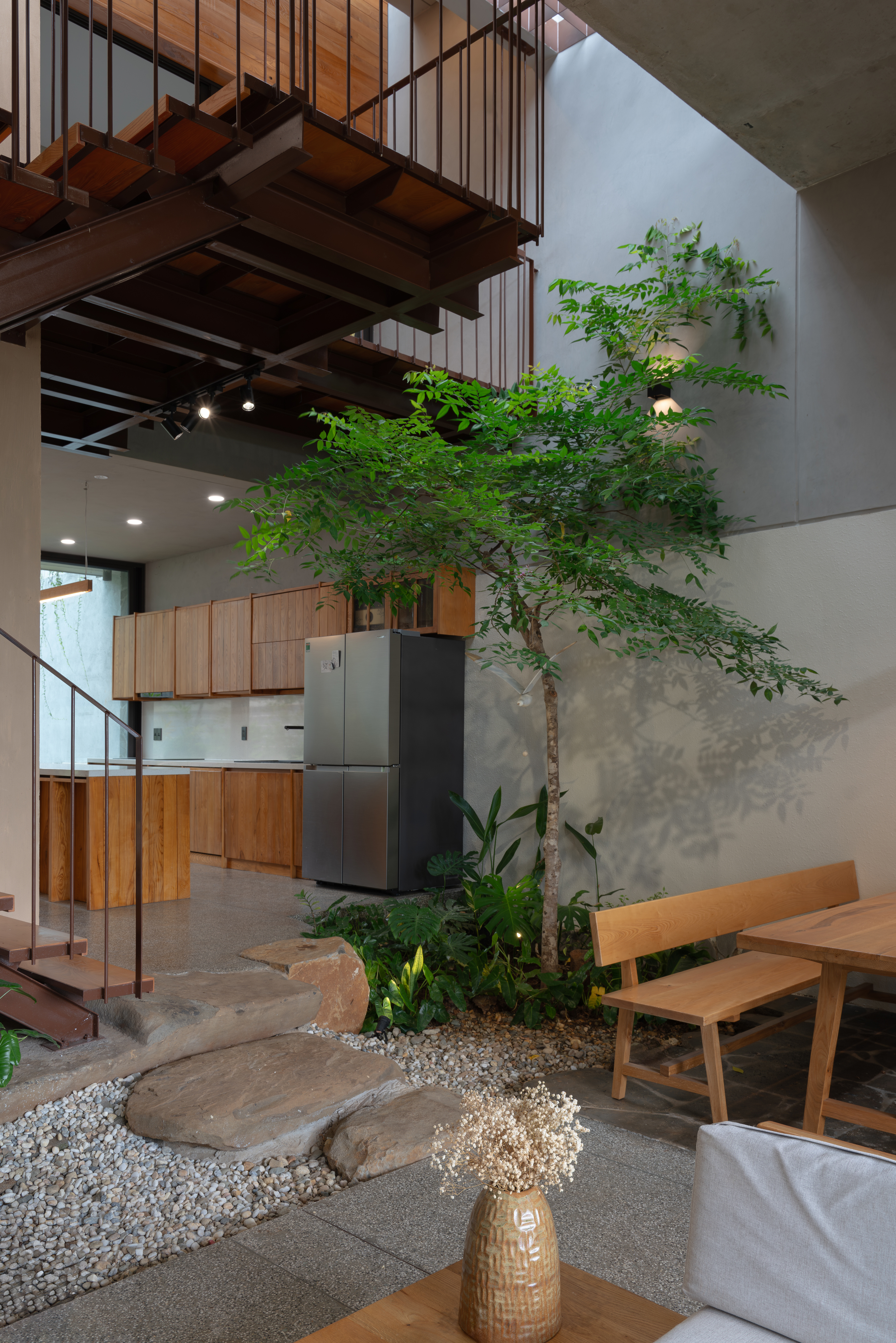 평지붕은 수평성을 유지하면서도 주변 건물의 경사 방향에 따라 소규모로 나뉘어 구성되었다. 이 지붕 위에는 가족을 위한 옥상 정원이 마련되어 있다. 자연석 계단과 목재, 테라조 등의 마감재를 조합해 투박함과 섬세함 사이의 대비를 의도했으며, 자연광을 전략적으로 도입해 공간의 밝기와 질감에 뚜렷한 변화를 주었다. 이러한 대비는 사용자의 공간 경험을 더욱 풍부하게 만든다.