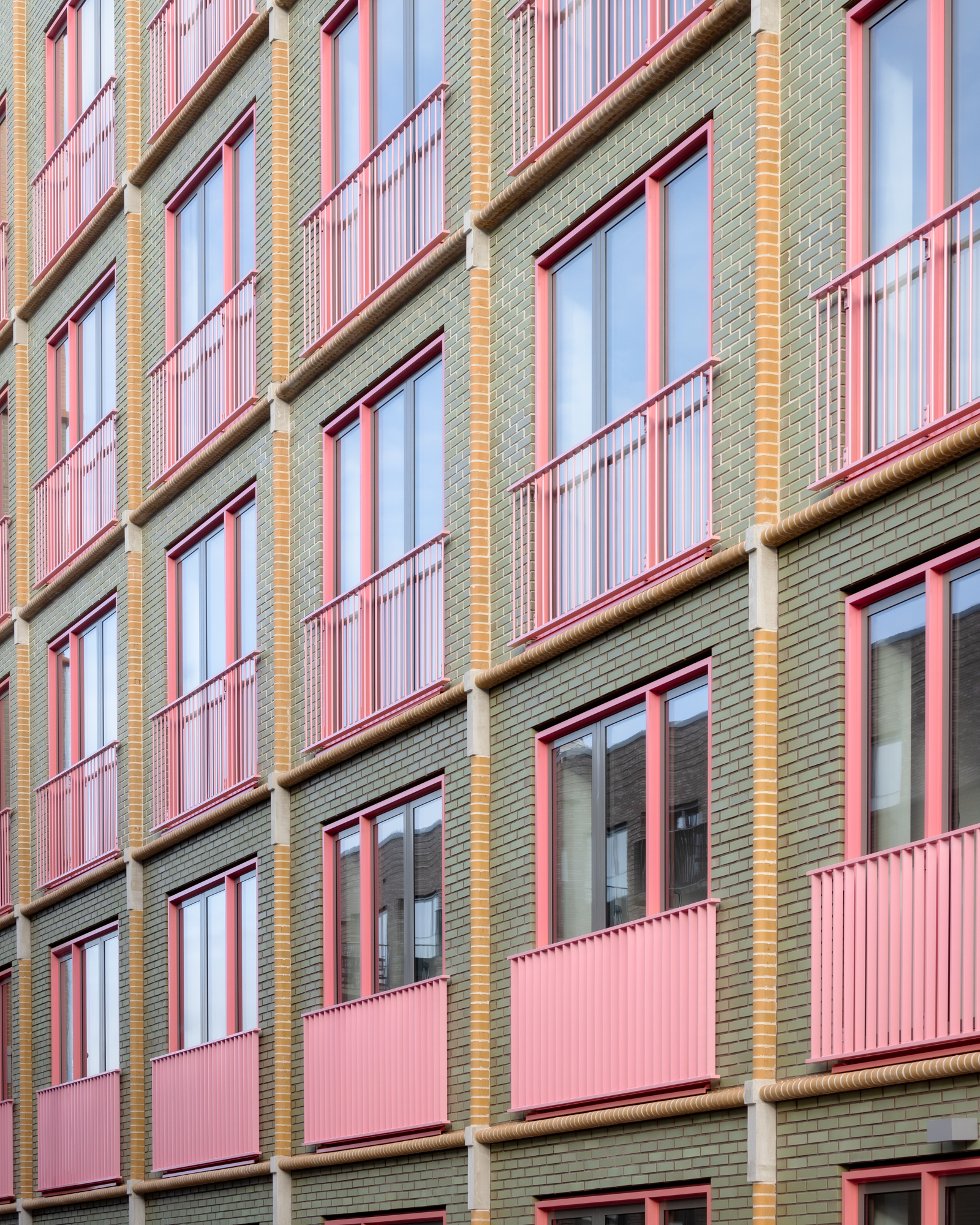 정교하게 마감된 벽돌 디테일은 내구성과 시공 효율을 동시에 고려한 결과물이다. 수직 기둥과 수평 밴드가 교차하는 입면 패턴은 특수 제작된 벽돌로 구성되며, 결절부를 살짝 돌출시켜 입면의 촉각성과 스케일감을 정교하게 조율했다.