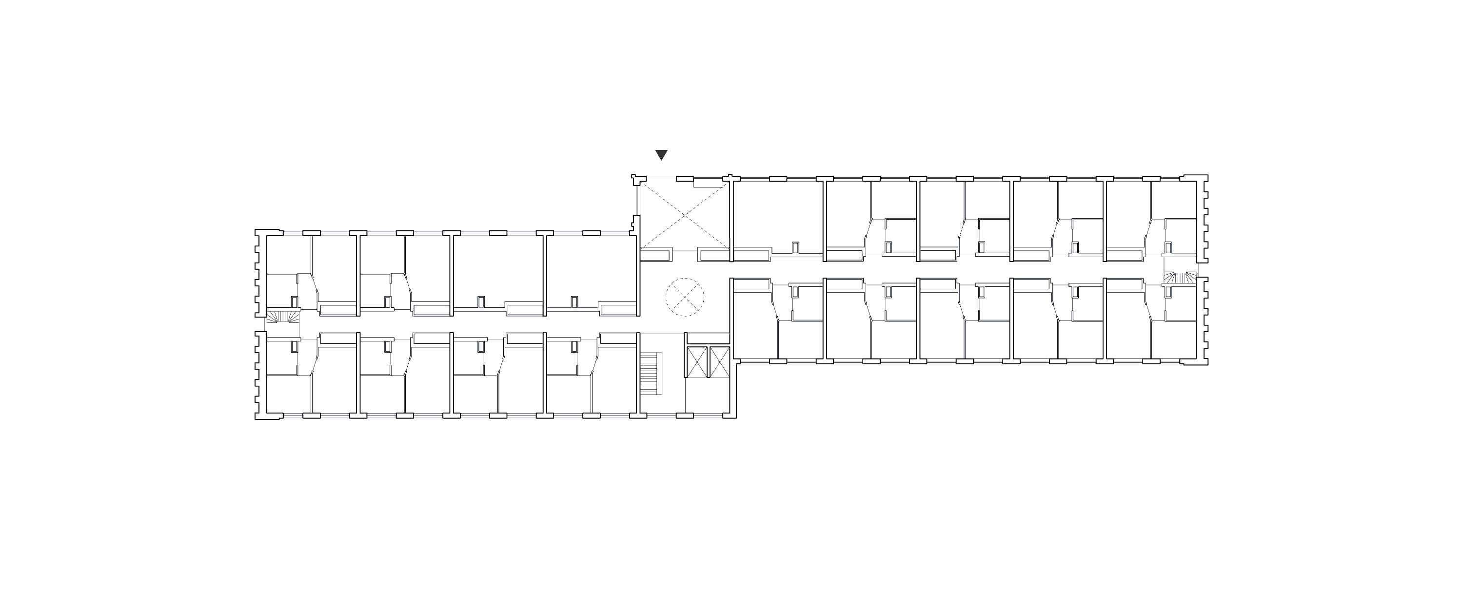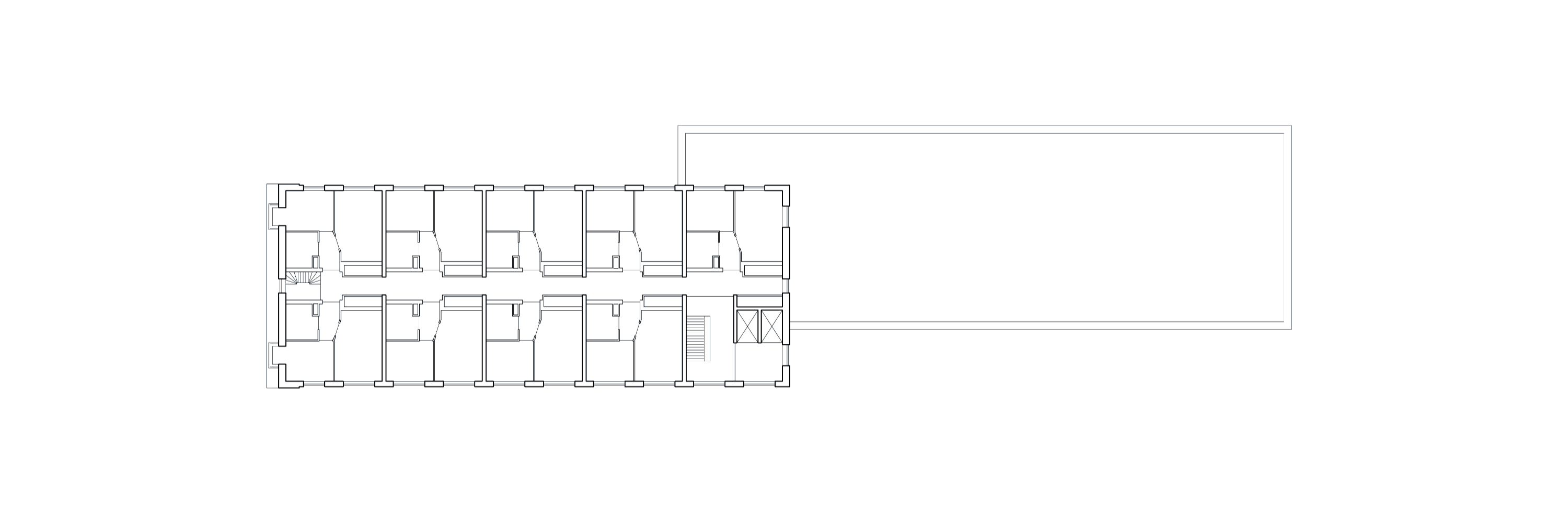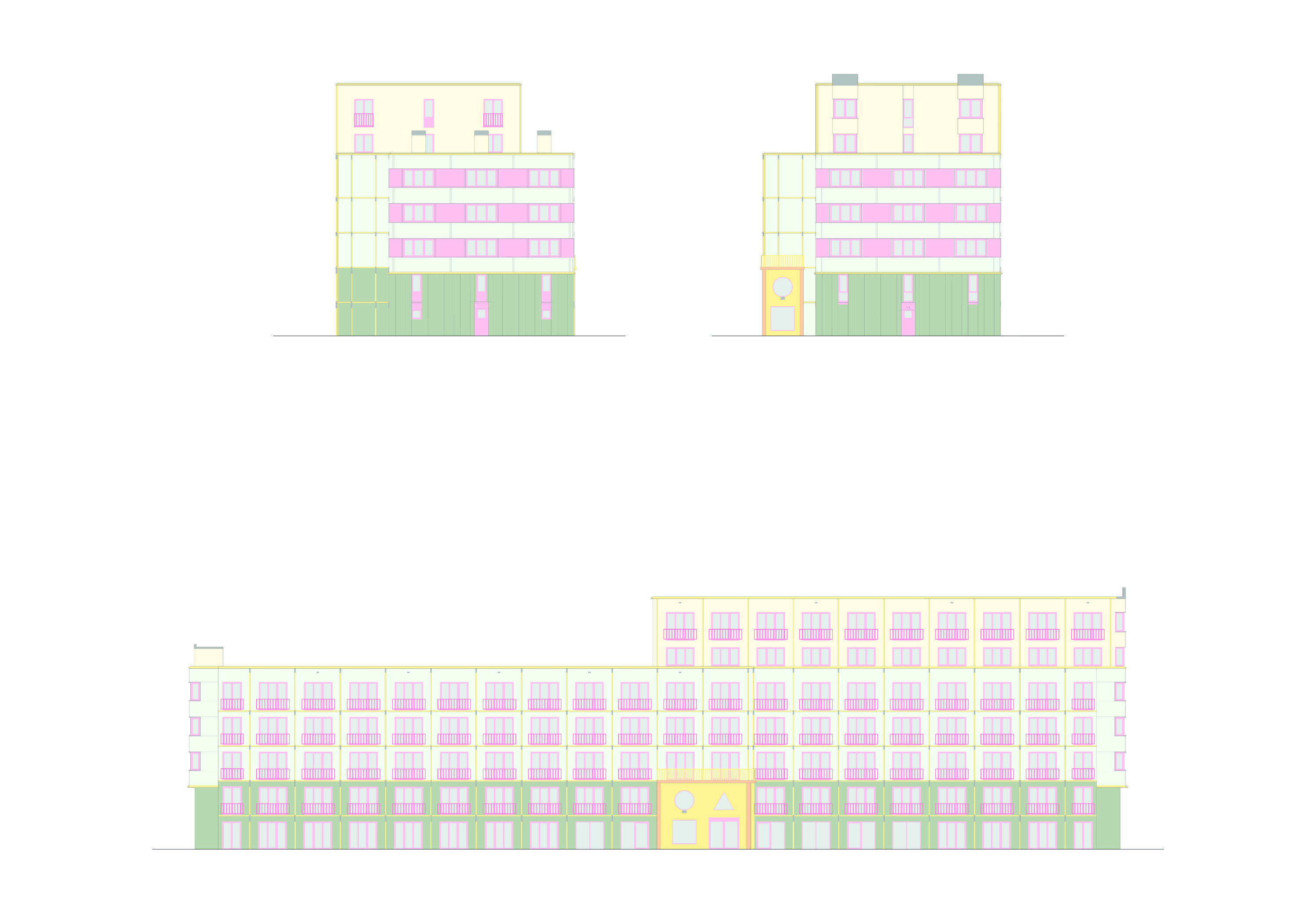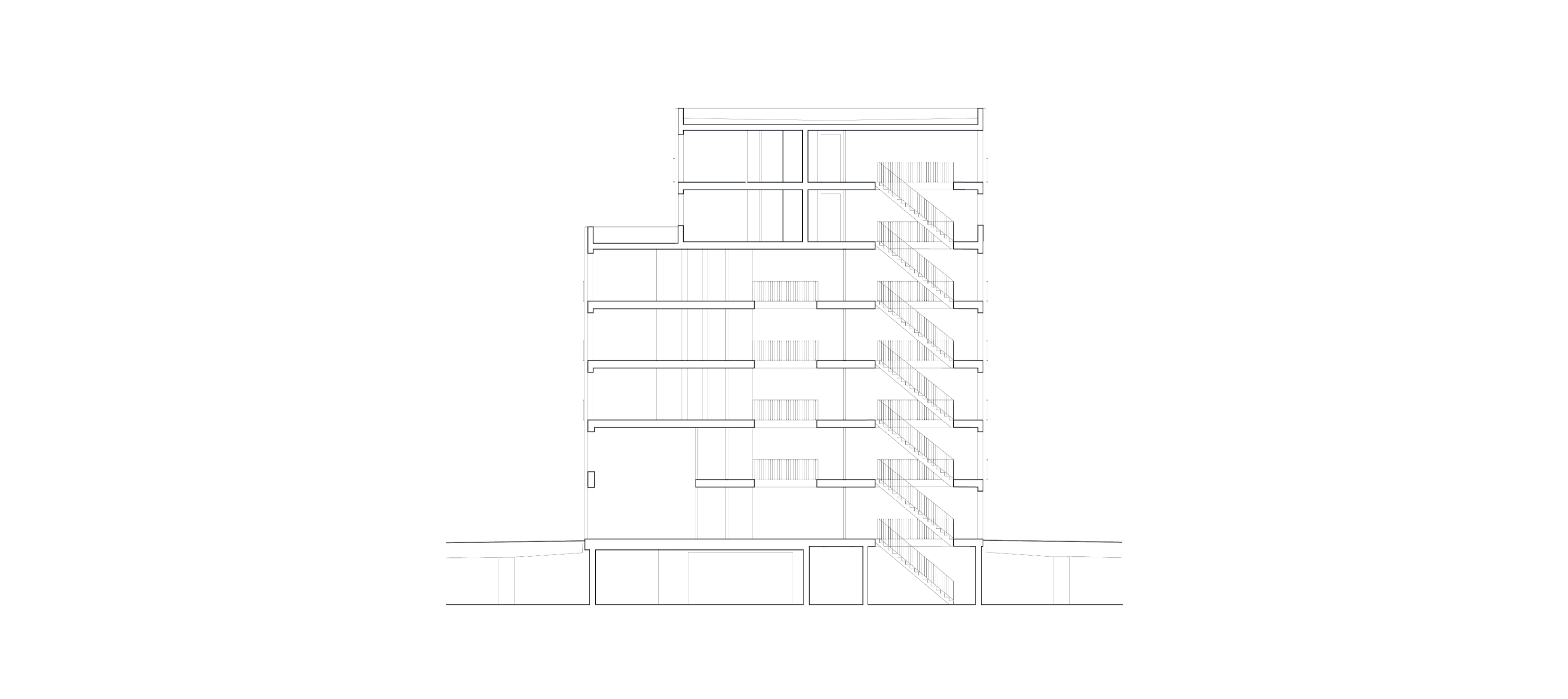 그중 중앙에 위치한 건물은 108세대 규모로 이번 개발의 마지막 단계에 해당하며, 주차장 상부 데크 위에 조성되었다. 길고 좁은 형태의 이 건물은 두 개의 매스로 구성되며, 기존 건물 사이에 정교하게 배치되었다. 건물 간의 조망과 채광을 유지하면서도 가용 공간을 최대한 활용했다.