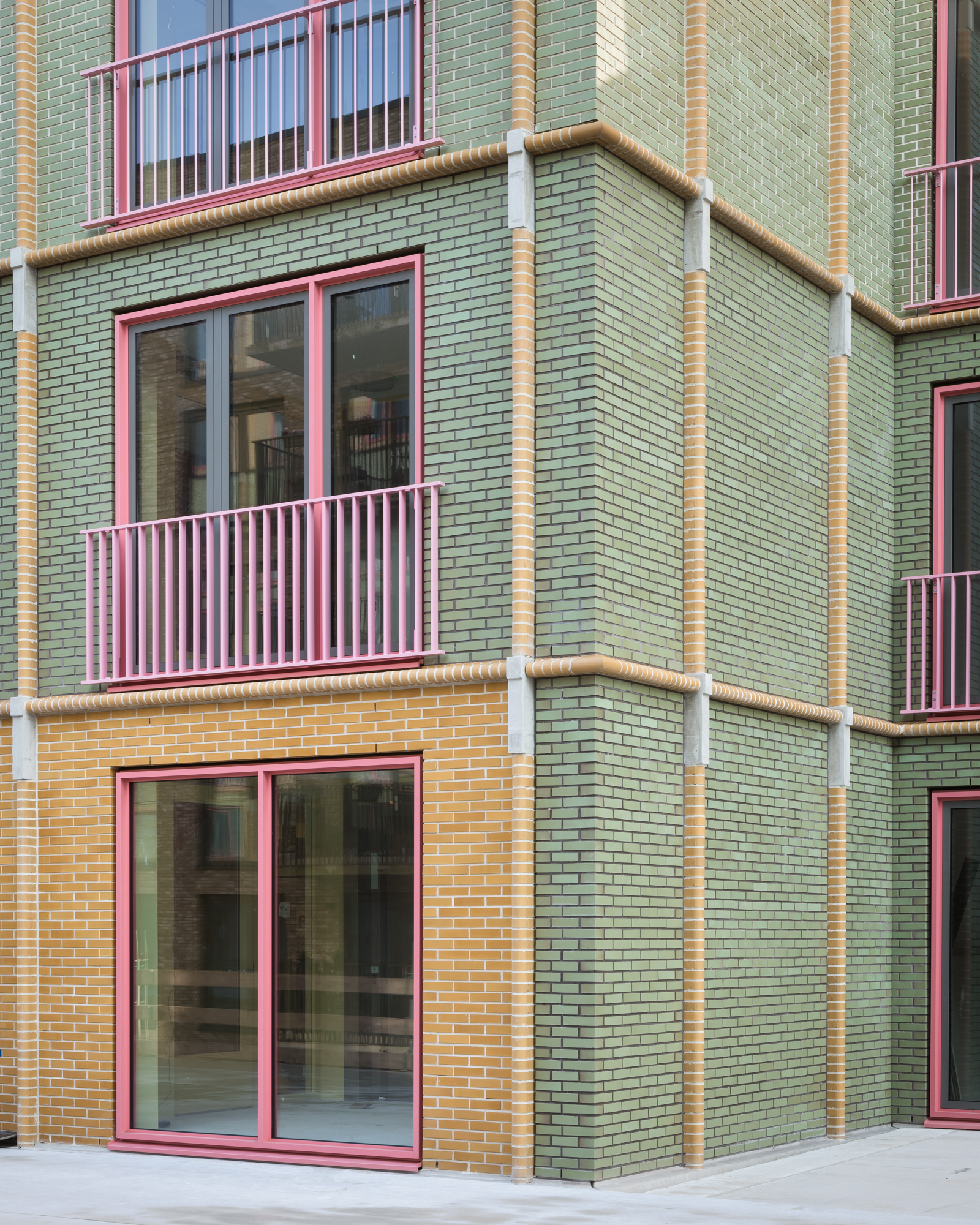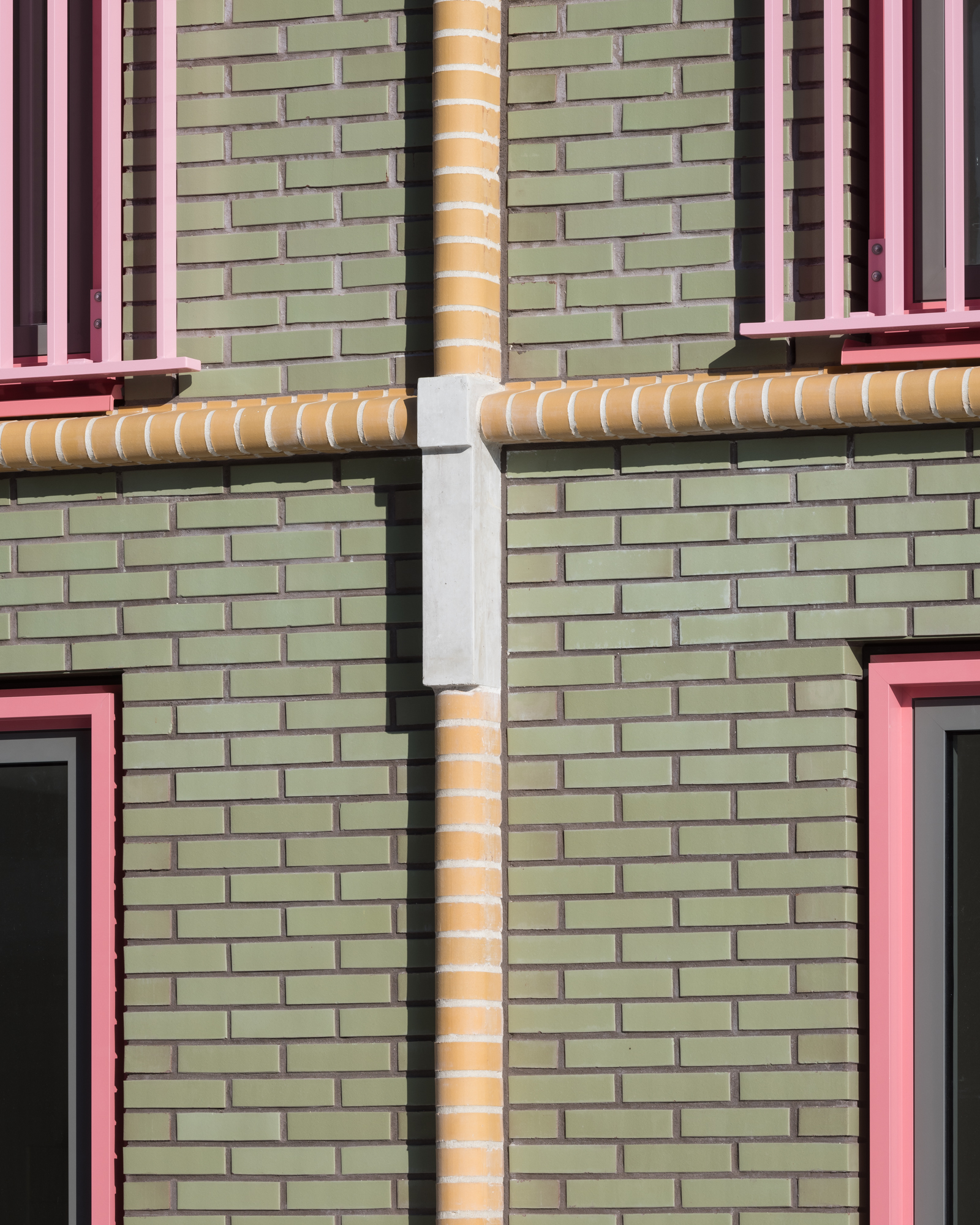 주 출입구는 유약 처리된 벽돌과 기하학적 형태의 개구부를 통해 주변과 뚜렷이 구분된다. 건물의 양 끝 입면은 멀리서도 인지 가능한 상징적인 형태로 구성되어, 프로젝트 전체에 독창적인 인상을 만든다.