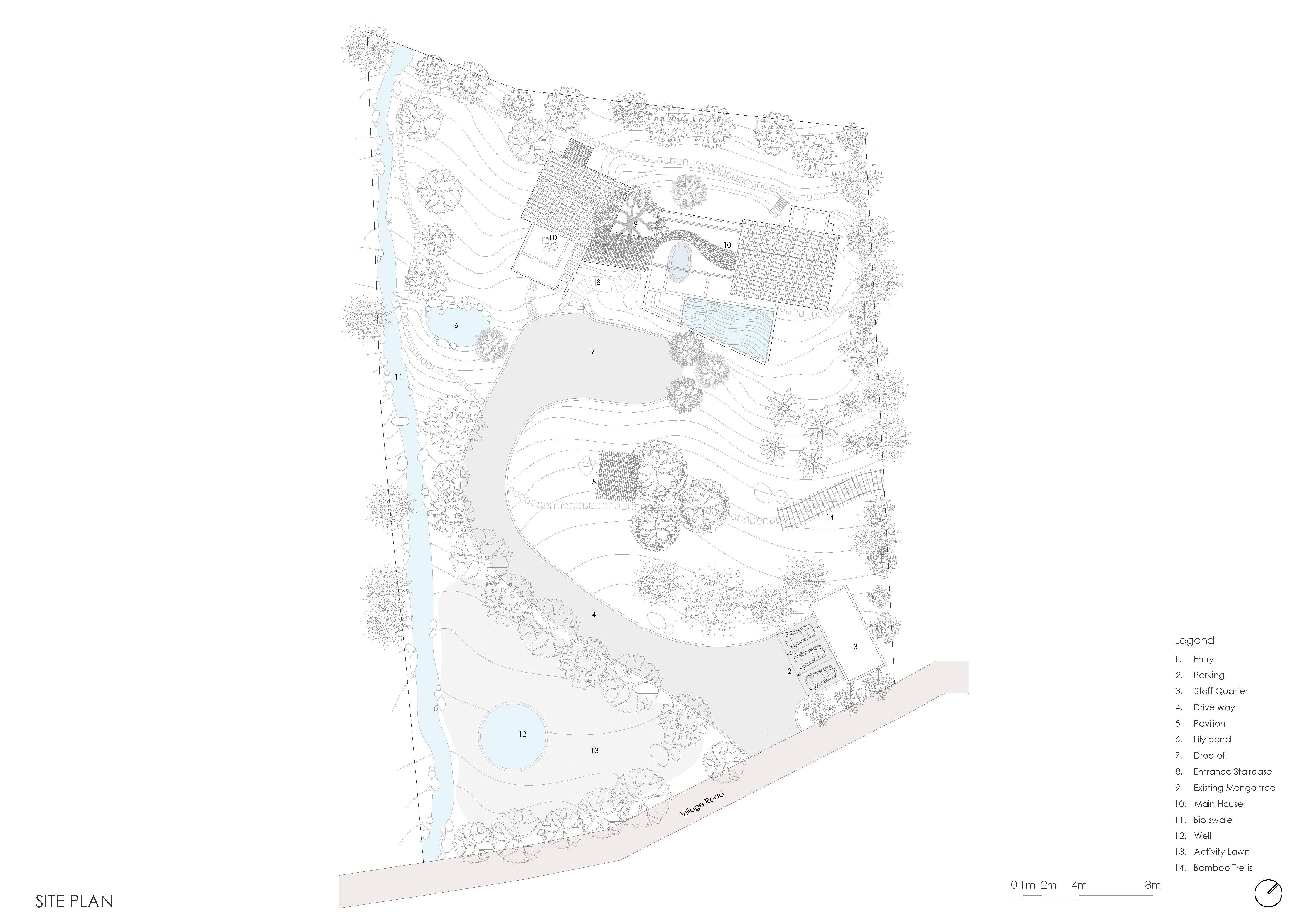 설계의 최초의 발상은 외딴 망고나무 아래에서 시작되었다. 조용하면서도 단단한 존재감을 지닌 이 나무는 직관적인 중심축이 되었고, 집의 이야기는 이 축을 중심으로 펼쳐진다. 공간 구성은 망고나무를 기점으로 공적 영역과 사적 영역, 두 개의 날개로 나뉘며, 그 사이에는 단순한 순환을 넘어 빛과 그림자, 소리와 침묵, 자아와 숲 사이의 대화가 존재한다. 나무가 조형물로 거듭나듯, 집도 겸손하면서도 힘 있게 바깥으로 확장된다.