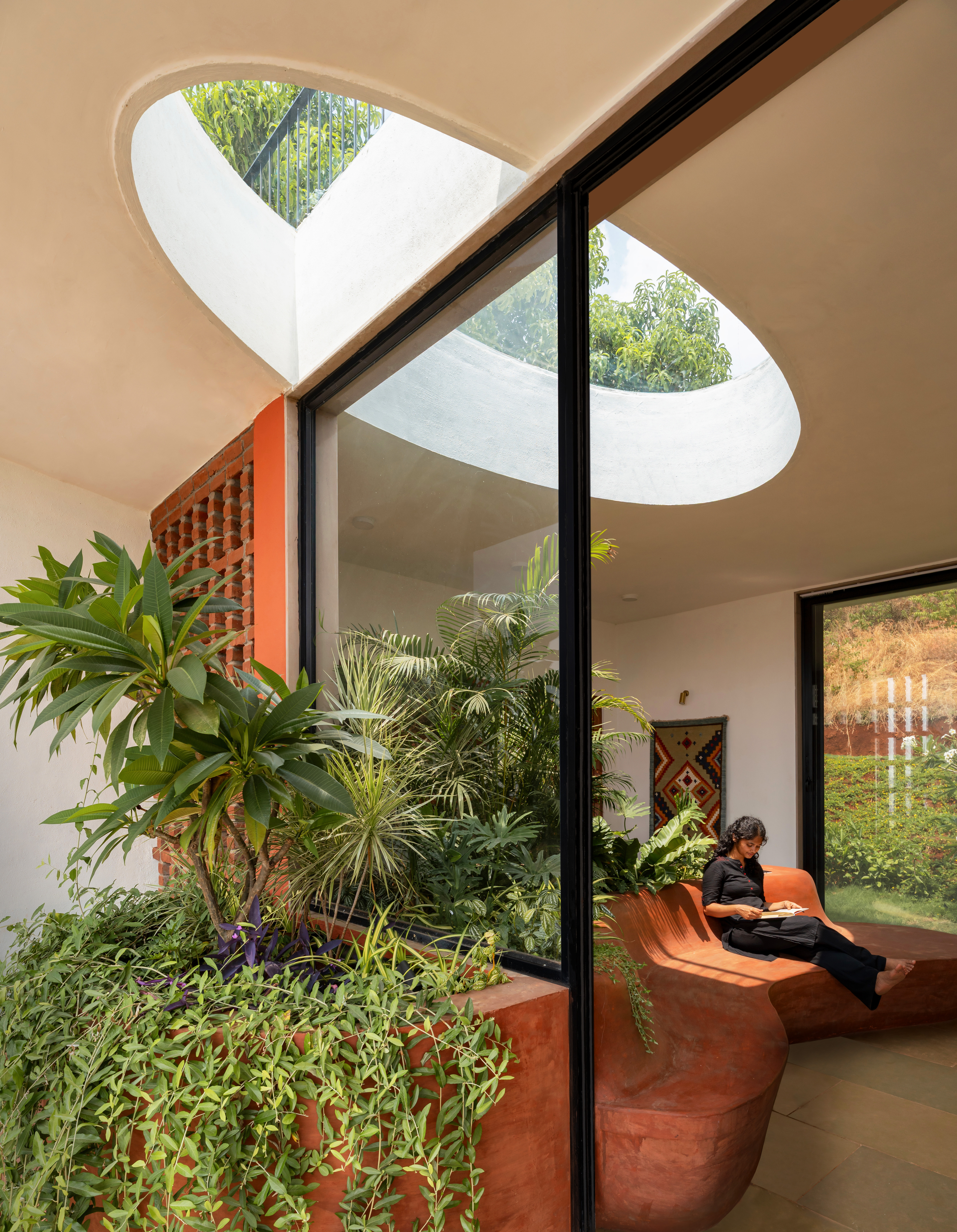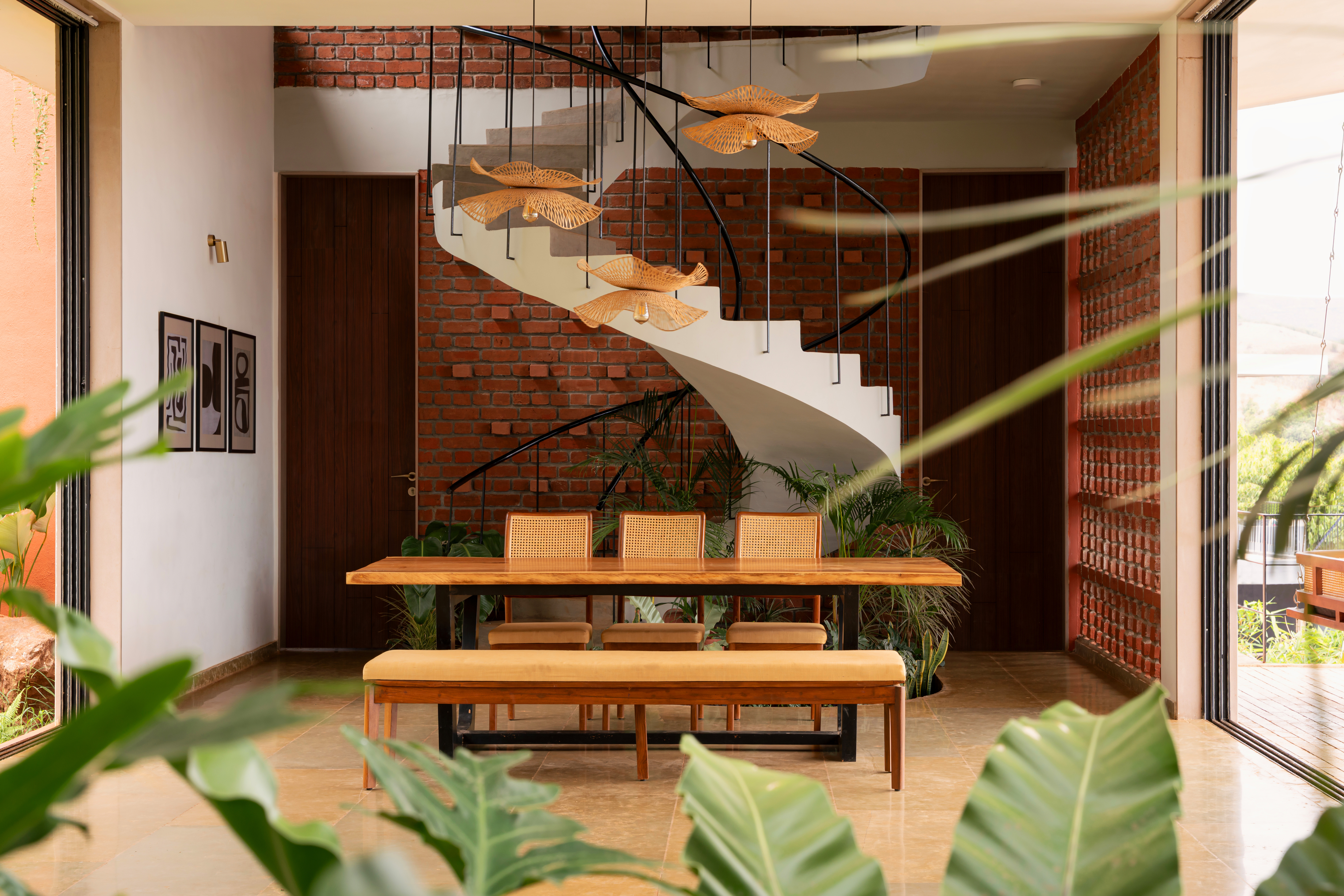 사야드리 산맥의 비옥한 토양에서 태어난 흙빛 생명체처럼, 이 집은 테라코타 색조를 통해 다양한 녹색 생명들을 품는다. 벽돌은 진솔하고 질감이 살아 있으며, 시대를 초월한 재료로 벽과 바닥 전체에 걸쳐 활용되어 따뜻함과 촉감을 전달한다. 토착 석재인 샤하바드 석은 집 전체에 다양한 패턴으로 활용되며, 전통 망갈로르 타일 지붕은 지역 건축의 타임리스한 특성을 되살린다. 내부는 따뜻하고 친밀한 분위기를 유지하며, 넓고 개방된 창문은 자연광을 풍부하게 유입시키고 주변 풍경을 액자처럼 담아낸다. 진정한 지속가능성은 단지 재료 선택에 있는 것이 아니라, ‘절제된 해법’에 있다. 집의 매스부터 세부 디테일에 이르기까지, 모든 요소는 생태적이면서도 경제적인 설계를 위한 의식적인 선택의 결과이다. 이 집은 겸손한 규모, 세심한 디테일, 부지와 계절에 대한 깊은 존중을 통해 디자인을 ‘공감의 행위’로 전환한다. 건축과 풍경은 지어진 것과 지어지지 않은 것 사이의 경계를 허물며, 생태적 기억을 회복하고 숲의 연속성을 자연스럽게 회복시킨다.
