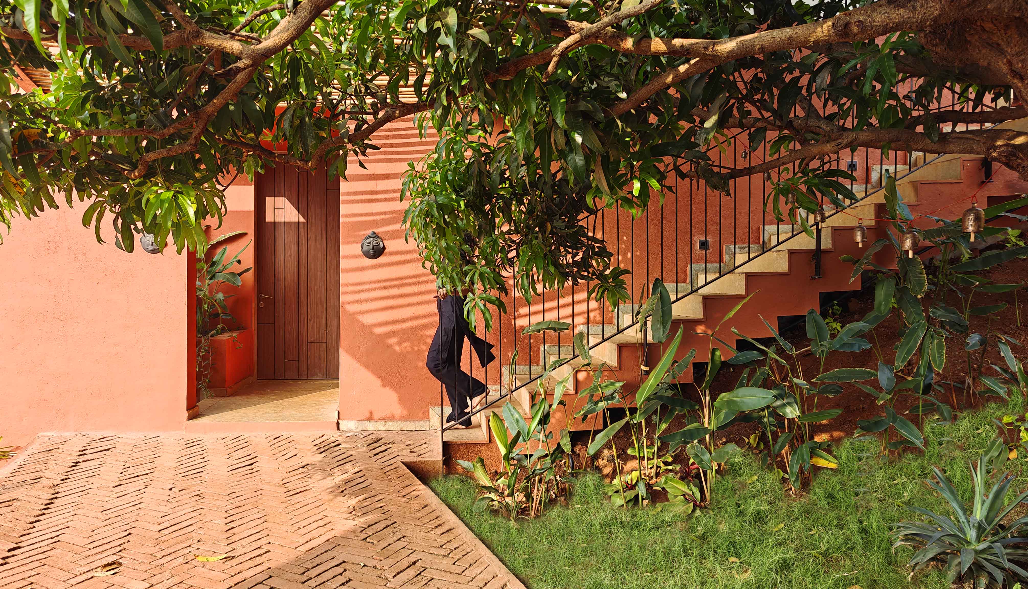 이 집에 진입하는 경험은 ‘존재’의 참여이다. 초록으로 우거진 오솔길을 따라 구불구불한 계단이 오르내리며 공간의 바이오필리아적 특성을 예고하고, 계단 끝에는 벽돌로 포장된 진입 캐노피와 대나무 퍼골라를 통과해, 빛과 그림자가 교차하는 입구에 이르게 된다. 바로 그 자리에 망고나무가 방문자를 맞이한다. 거실은 앞뒤 조경을 연결하는 통과 공간으로, 망고나무 가지를 시적으로 프레이밍하며 구성된다.