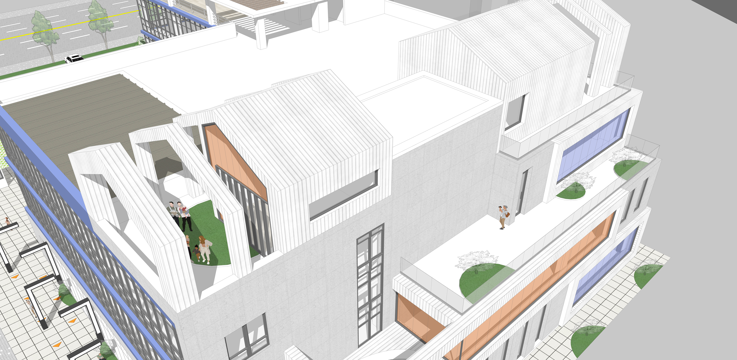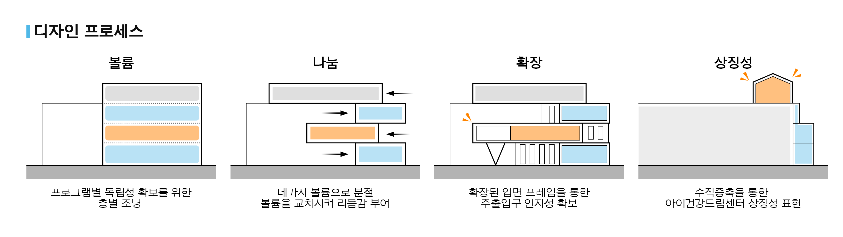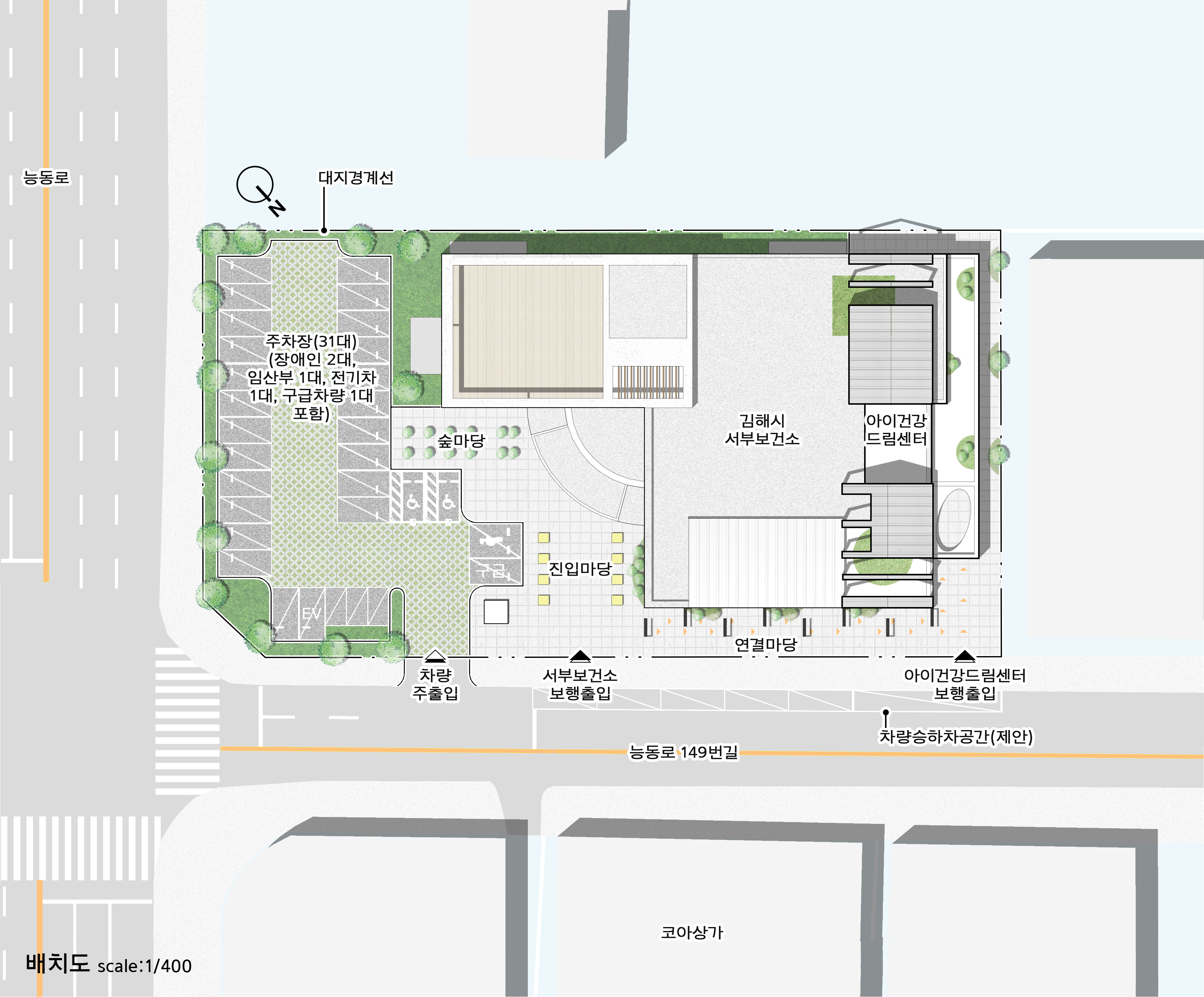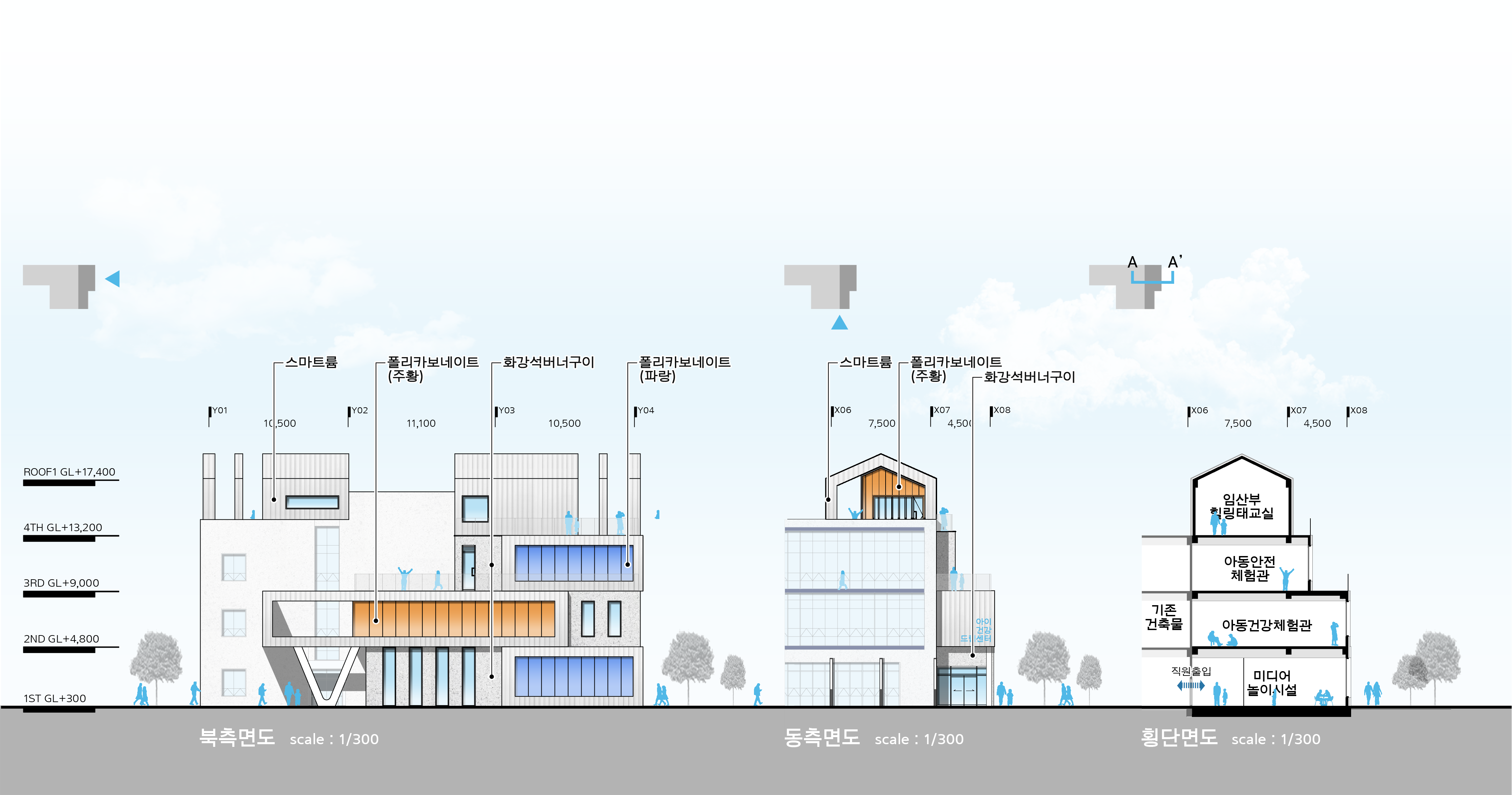 아이건강드림센터는 아이들의 건강한 발달과 균형 잡힌 성장을 돕기 위해, 놀이와 보호, 창의적 체험이 유기적으로 연결된 수직적 구조로 설계되었다. 개방적인 놀이공간에서는 아이들이 자유롭게 뛰놀며 신체 발달과 사회성을 기를 수 있고, 보호 중심의 기능은 안전한 환경과 돌봄 시스템을 통해 부모와 보호자가 안심할 수 있는 공간을 제공한다. 또한, 정서적·창의적 프로그램은 예술, 감정 표현, 창의 놀이 등 다양한 활동을 통해 아이들의 감성과 상상력을 자극한다. 이러한 요소들이 층별로 유기적으로 구성되어, 아이들은 자연스럽게 놀이에서 배움과 성장으로 이어지는 흐름을 경험한다.