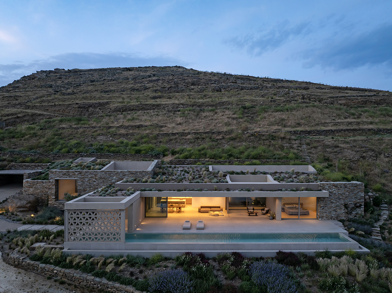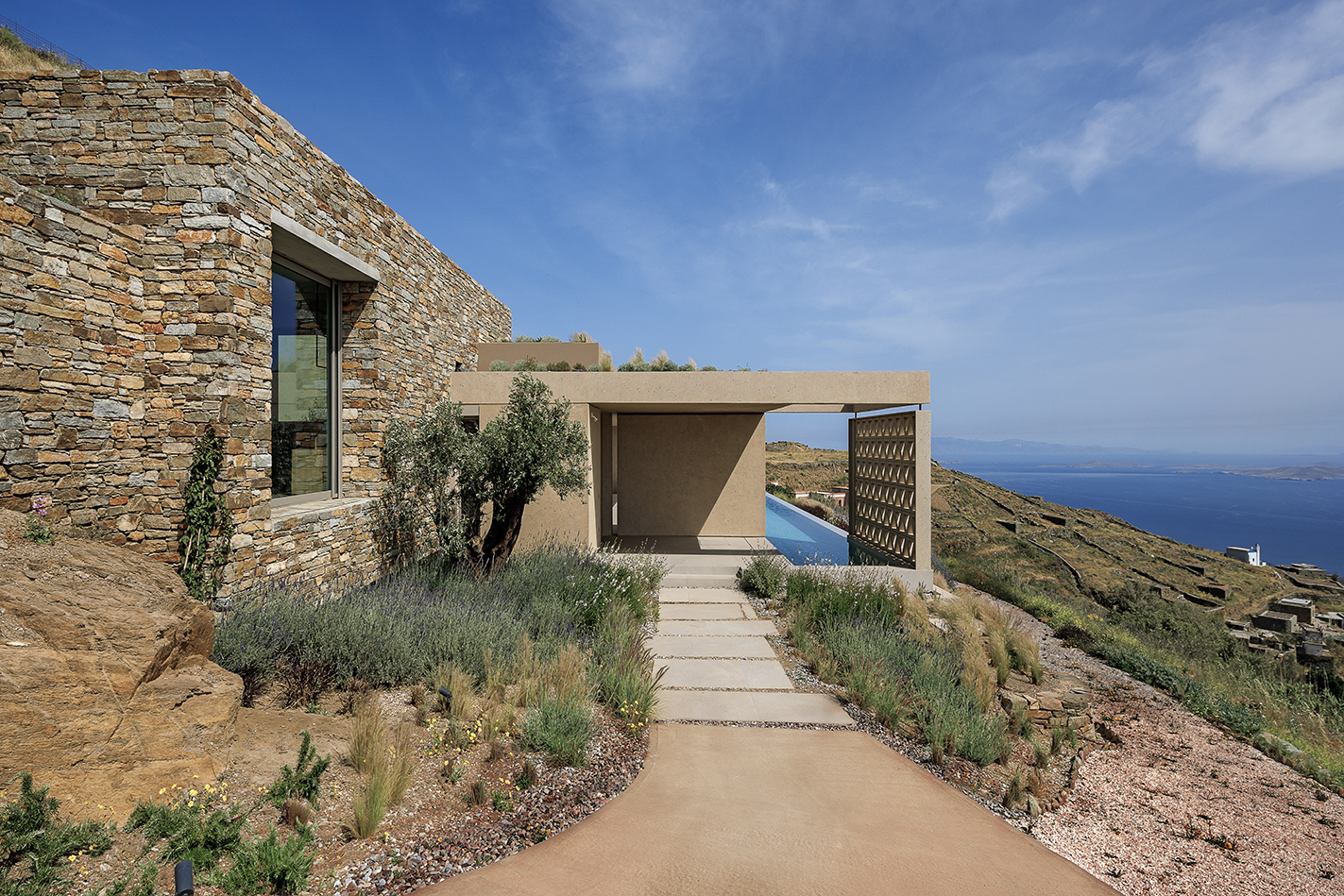 대지는 디오 호리아 마을 동쪽에 위치한 가파른 남향 경사면에 자리하며, 호라와 항구를 비롯해 시로스, 미코노스, 레니아, 델로스, 낙소스, 파로스, 시프노스 섬까지 탁 트인 조망을 제공한다. 건축 전략은 두 가지로 구성된다. 하나는 주택을 지면 속 깊숙이 묻는 것이고, 다른 하나는 그 앞의 지형을 바다와 하늘의 끝없는 푸름이 잘리듯 파고드는 것이다. 이로써 시선의 방향은 반전되며, 풍경 자체가 하나의 파사드가 된다. 내부를 드러내는 유일한 요소는 거실 천장의 연장선인 기다란 캐노피로, 집의 길이를 따라 뻗어 나오며 그 존재를 암시한다.