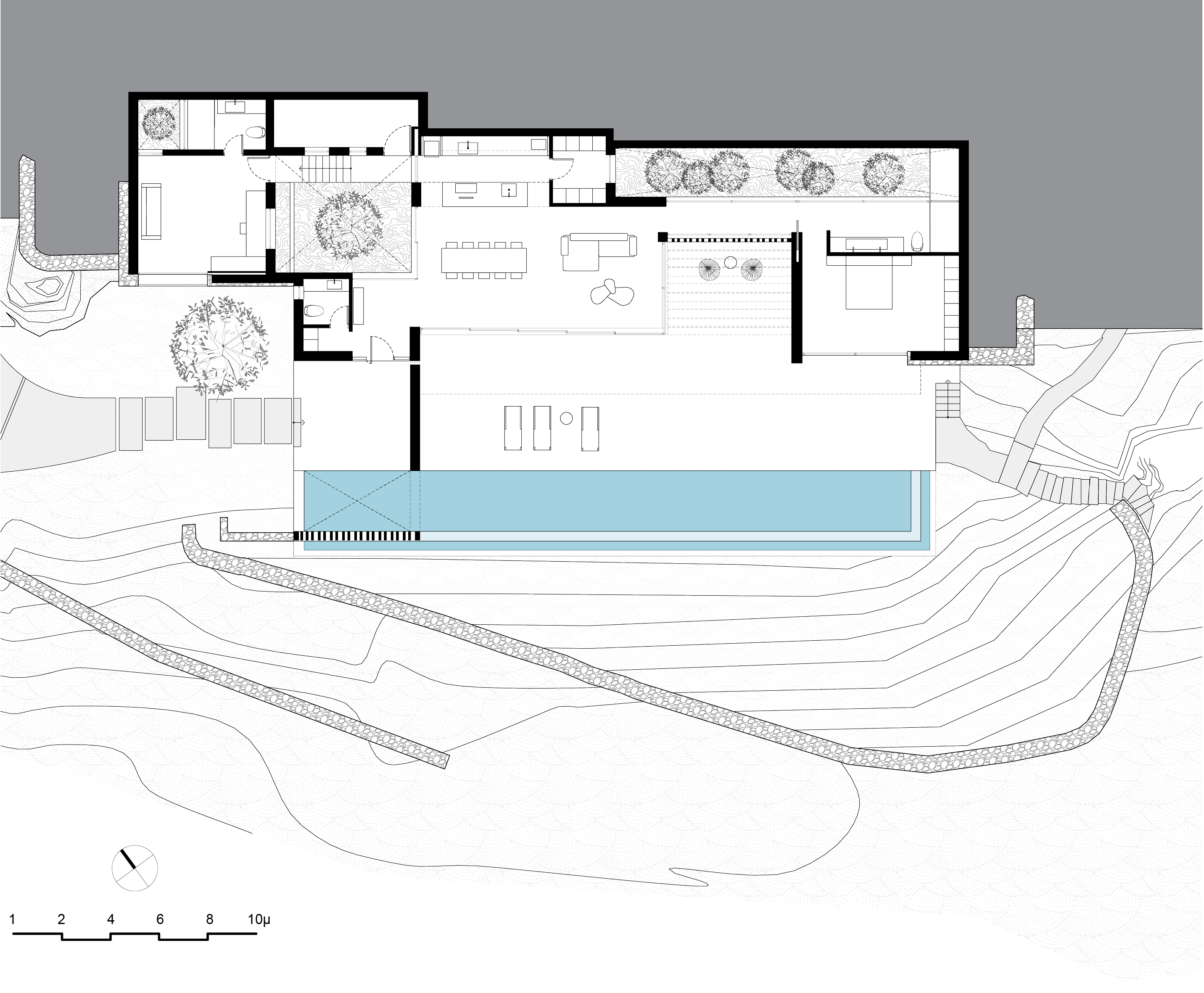 주택 전면의 지상층에 자리한 작은 매스는 티노스 전역에 흩어져 있는 전통 도브코트(비둘기 집)의 패턴에서 영감을 받아 디자인되었으며, 주 출입구 역할을 하며 멀리 호라를 향한 시선을 프레이밍한다. 그 옆으로는 입면을 따라 길고 좁은 수영장이 이어진다. 이러한 원형적 요소들이 공존함으로써, 이 집에 들어서는 경험은 단순한 공간적 기능을 넘어 감각적이고 의미 있는 행위로 승화된다.