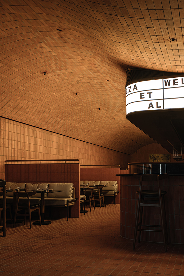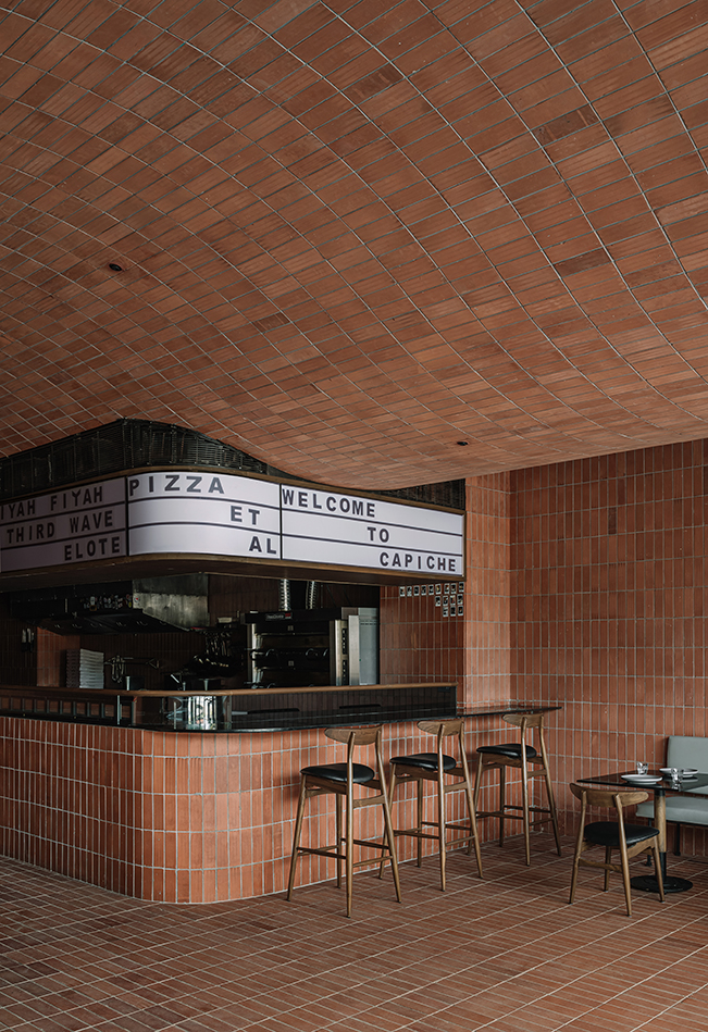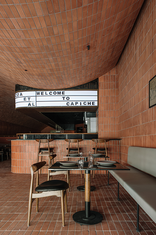 레스토랑의 중심은 오픈 키친으로, 이곳은 ‘카피체’의 심장이자 핵심 공간이다. 오븐을 중심으로 한 키친은 손님들을 요리의 세계로 끌어들여 몰입감 있는 다이닝 경험을 선사한다. 매끈한 어두운 조리대는 벽돌 마감재와 대조를 이루며, 통합된 조리 설비는 현대적 우아함을 더한다. 이곳에서 기능성과 미학의 균형은 가장 뚜렷하게 드러난다. 주방 상단의 메뉴판은 아크릴 소재와 백라이팅으로 구성되어, 고전적인 피제리아의 감성을 담아내고 있으며, 미니멀하고 정돈된 디자인은 메뉴를 쉽게 읽을 수 있게 한다.